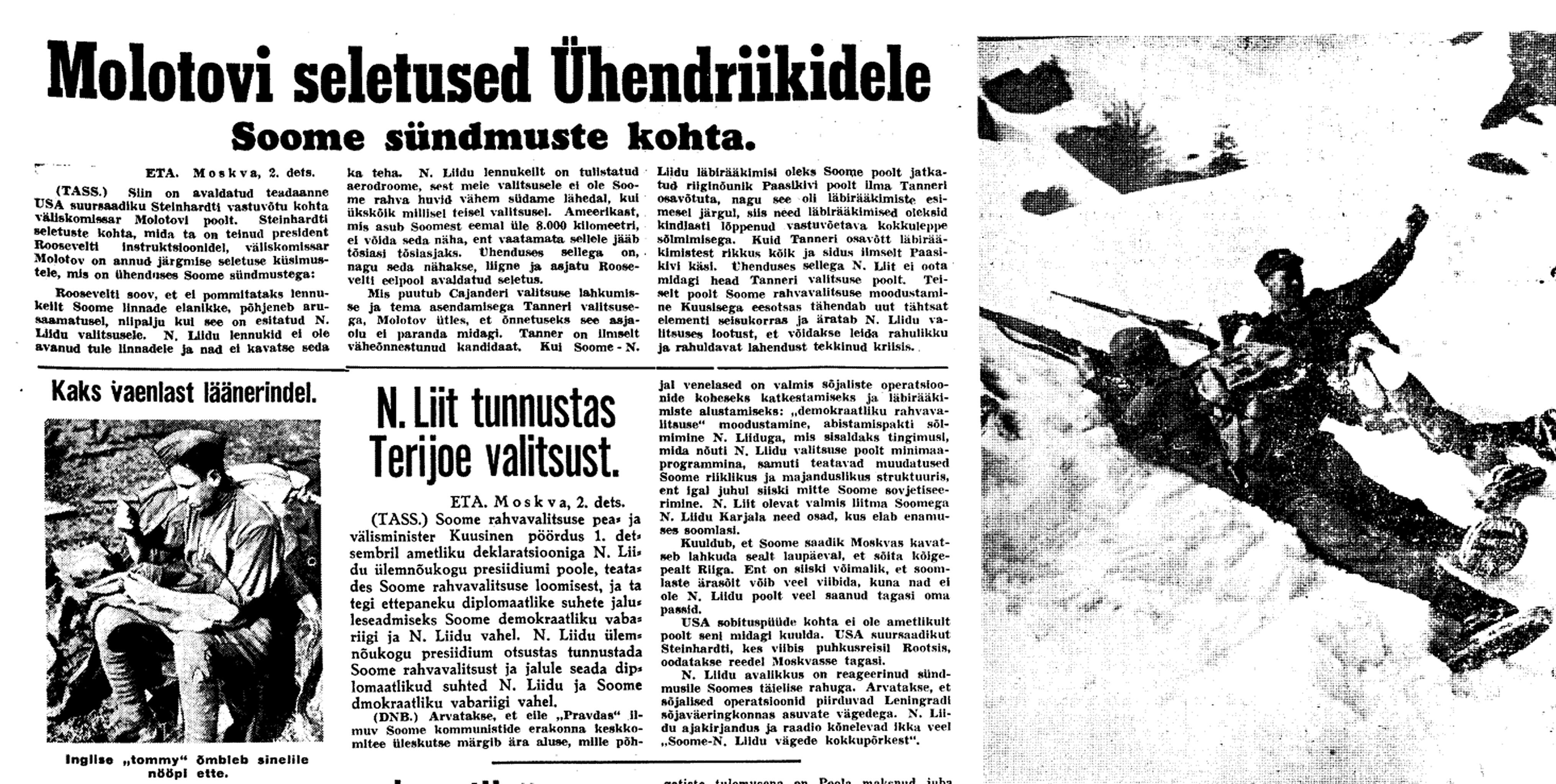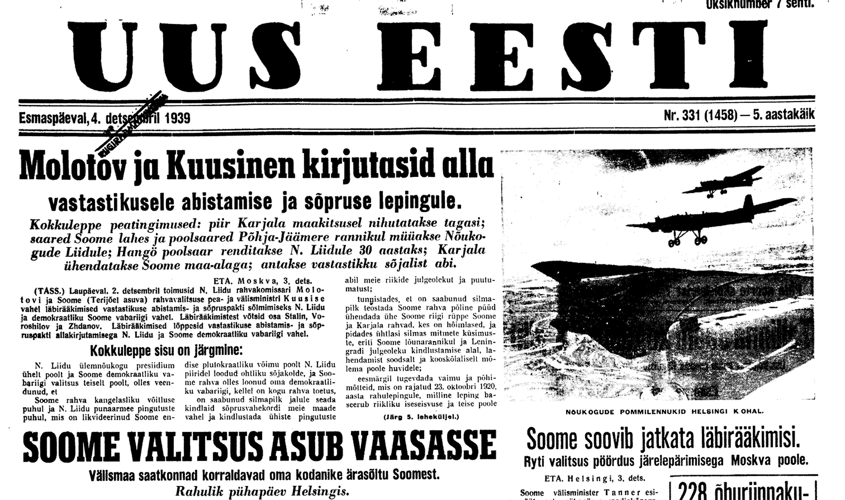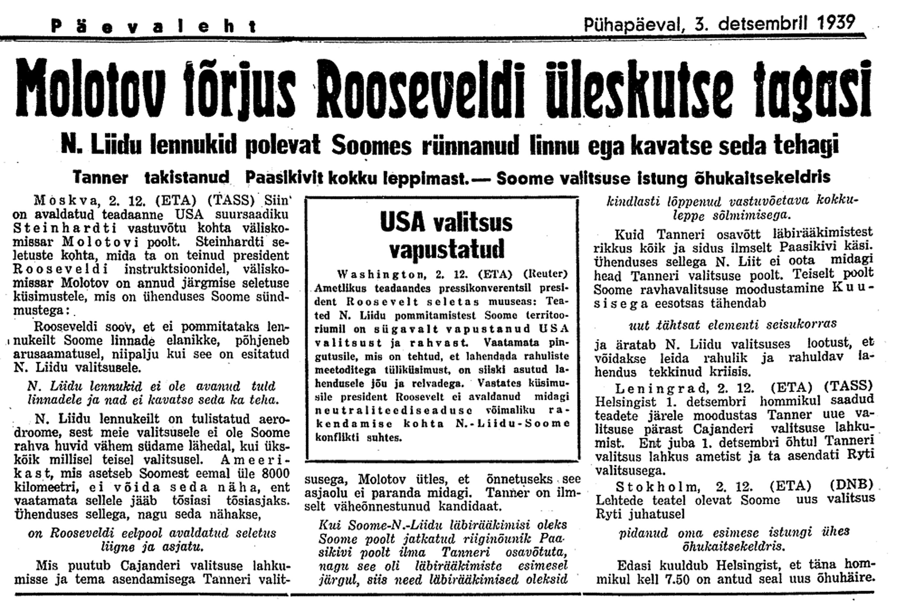 4. dets. Nagu selgub, pole "Kirov" Tallinna tulnud. Ka Kuusikult aeroplaanide lend pole tõenäoline. Olukord on niisugune, et ei Soome ega Vene tunnista ennast sõjas olevaks. Käimas on juriidiliselt "repressaaliad". Inglasi on huvitanud, kas meie Kuusineni valitsust tunnustame.