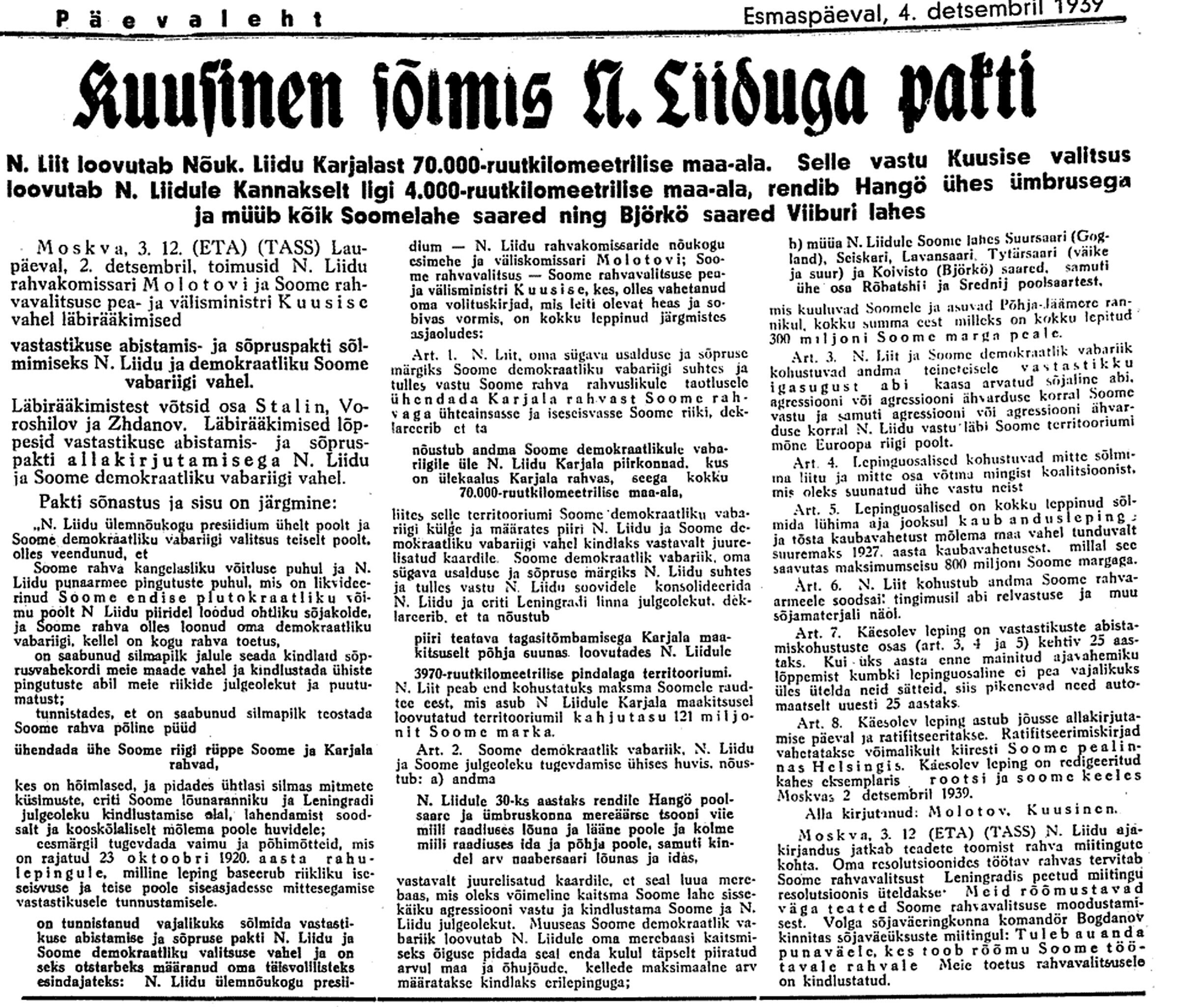 3. dets. Vene on sõlminud vastastikku abistamise pakti Terijoe valitsusega. Annab viimasele Karjala 70 000 ruutklm. Saab vastu: 1) saared Balti meres, 2) Karjala kannaksest 3900 klm. [km2], 3) Hango, 4) Kalastajasaare. See leping näitab Vene nõudmiste minimumi Soome vastu.