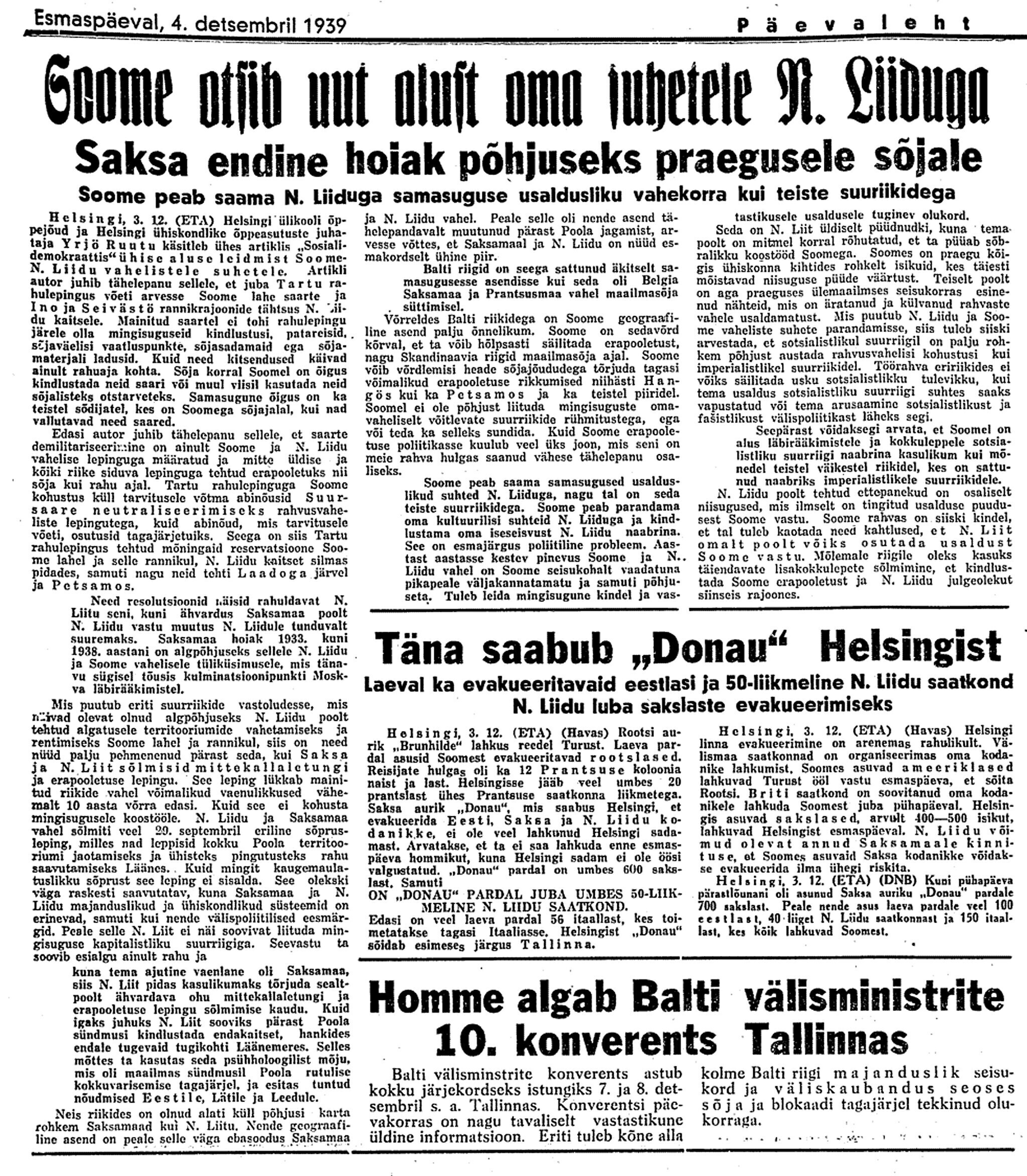 Ka on huvitanud neid küsimus, kuidas suhtutakse Vene tegevusele, mis Soome vastu ette võetakse baasidest. Meie vastus: Paldiski on baas. Selle kaitse – Vene ülesanne. Tallinn pole baas – seda kaitseme meie ükskõik kelle vastu, kes vägivallaga siia püüab tulla.