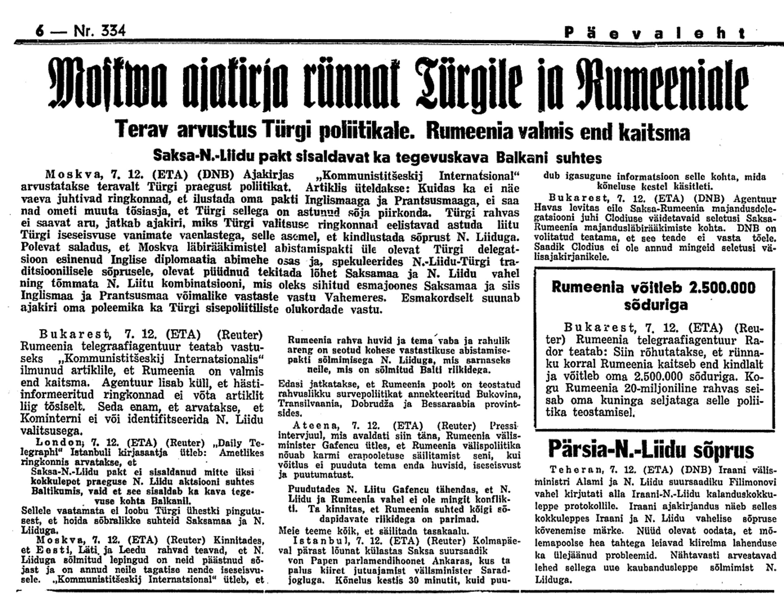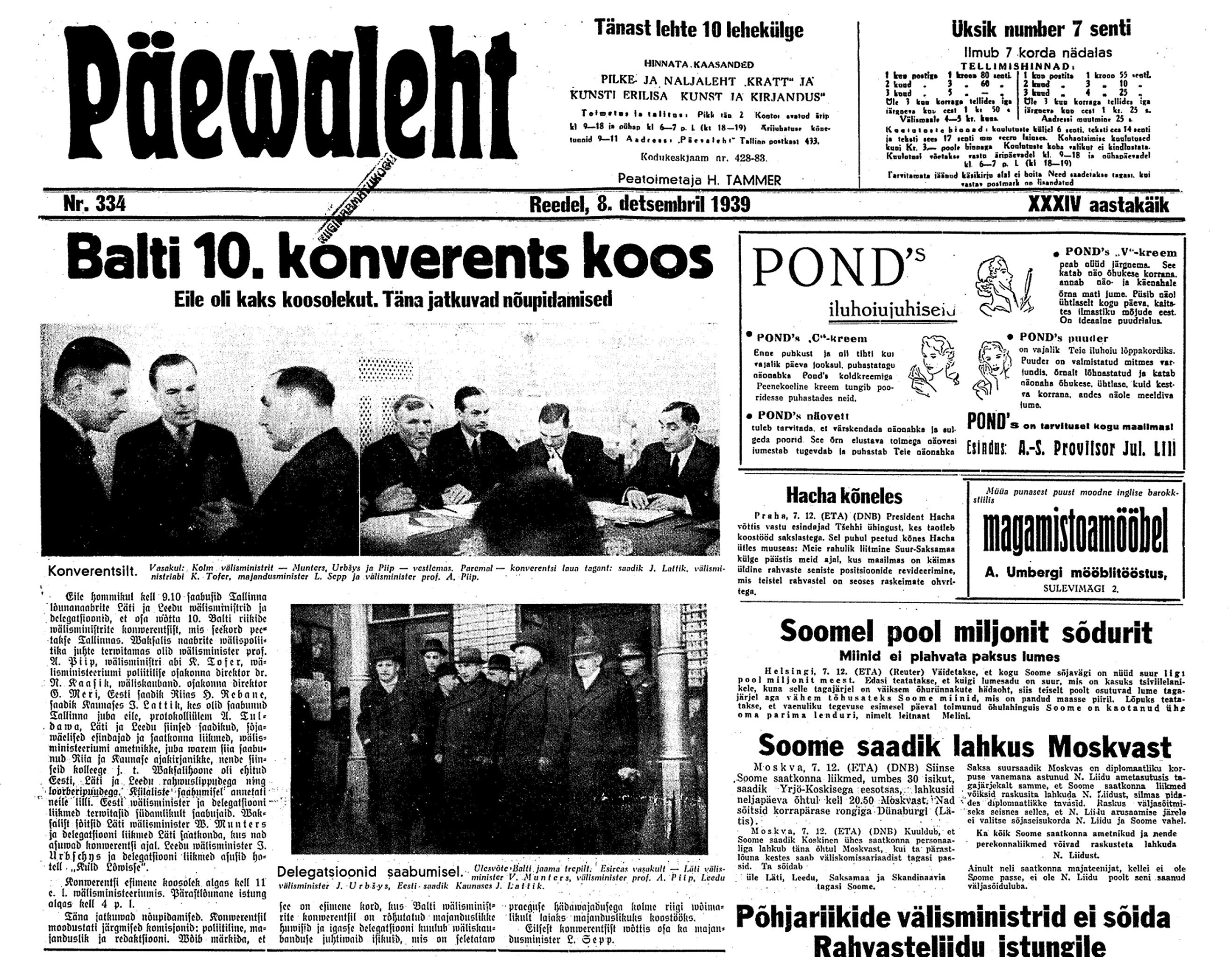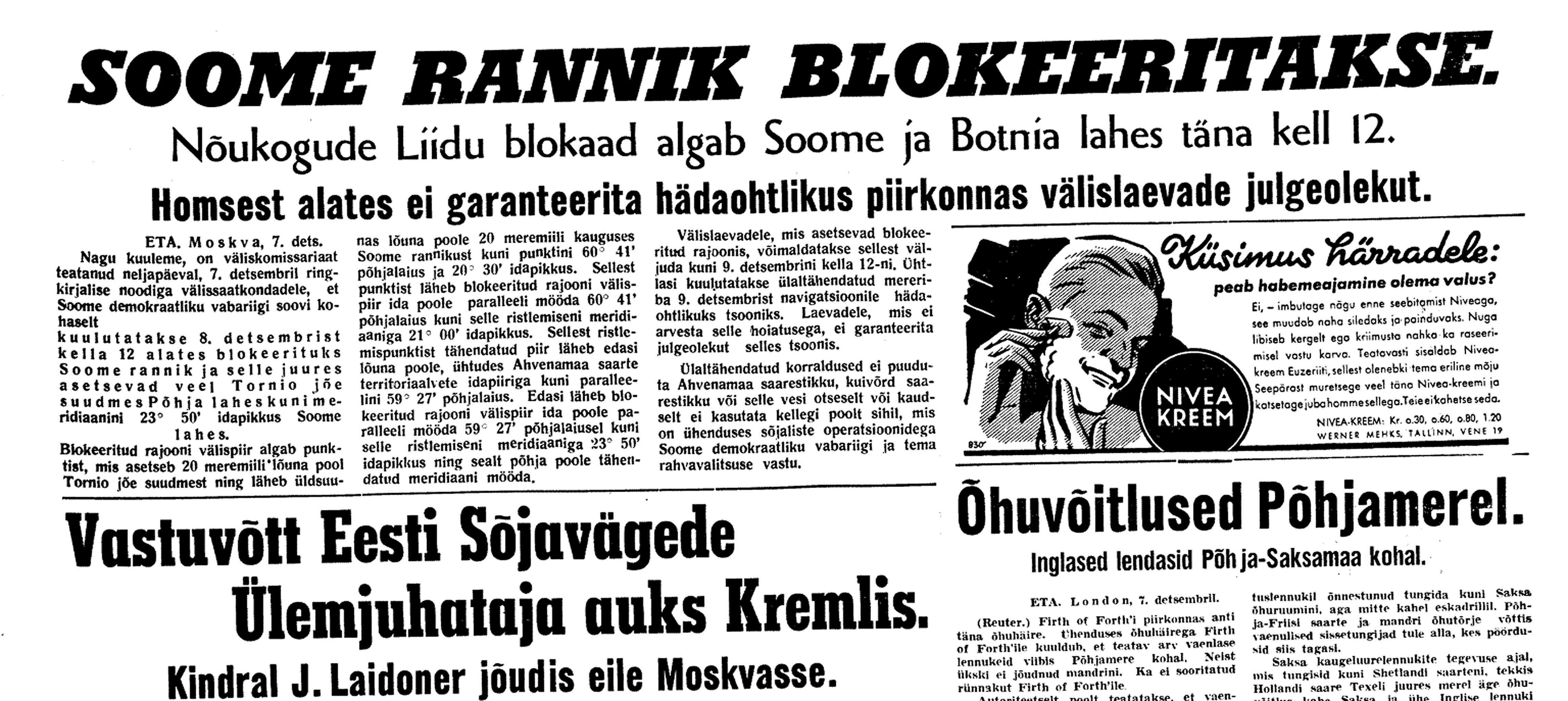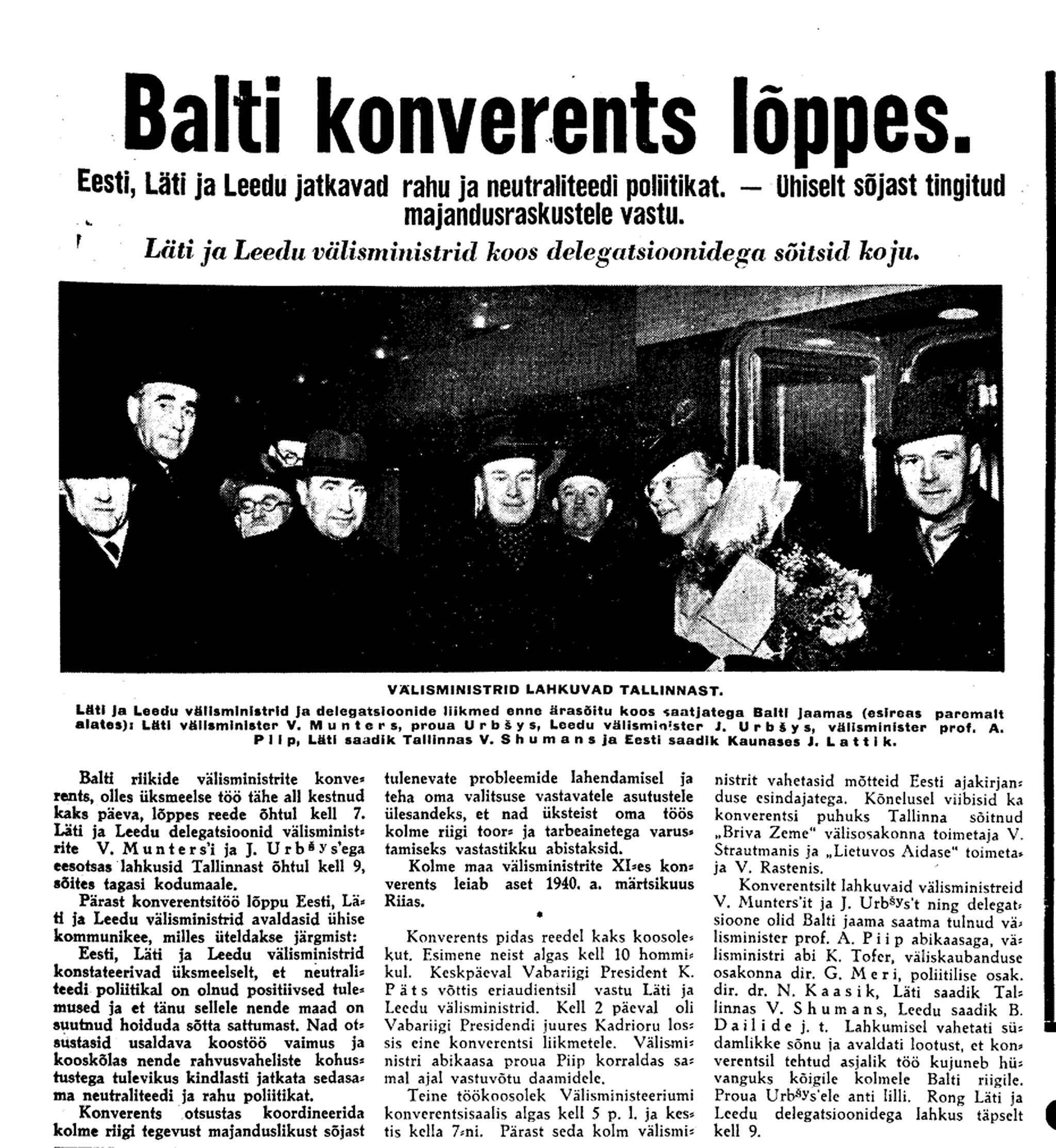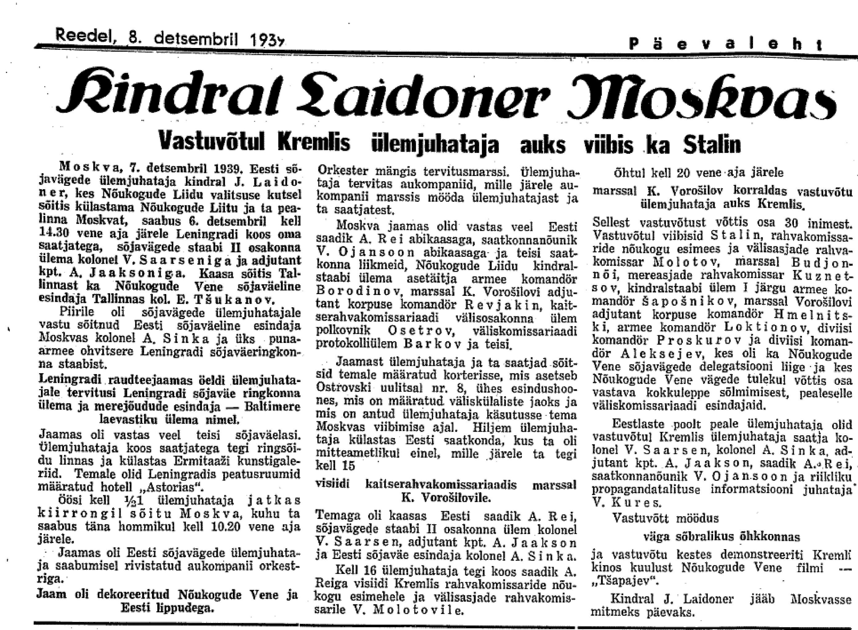 Ajaloolane Küllo Arjakas: 7.–14. detsembril viibis sõjavägede ülemjuhataja kindral Laidoner ametlikul visiidil Moskvas. Teda võeti seal südamlikult vastu ja kindralile kinnitati korduvalt, et NSV Liit ei sekku Eesti siseasjadesse. Laidoner kohtus Vorošilovi, Molotovi ja Staliniga.