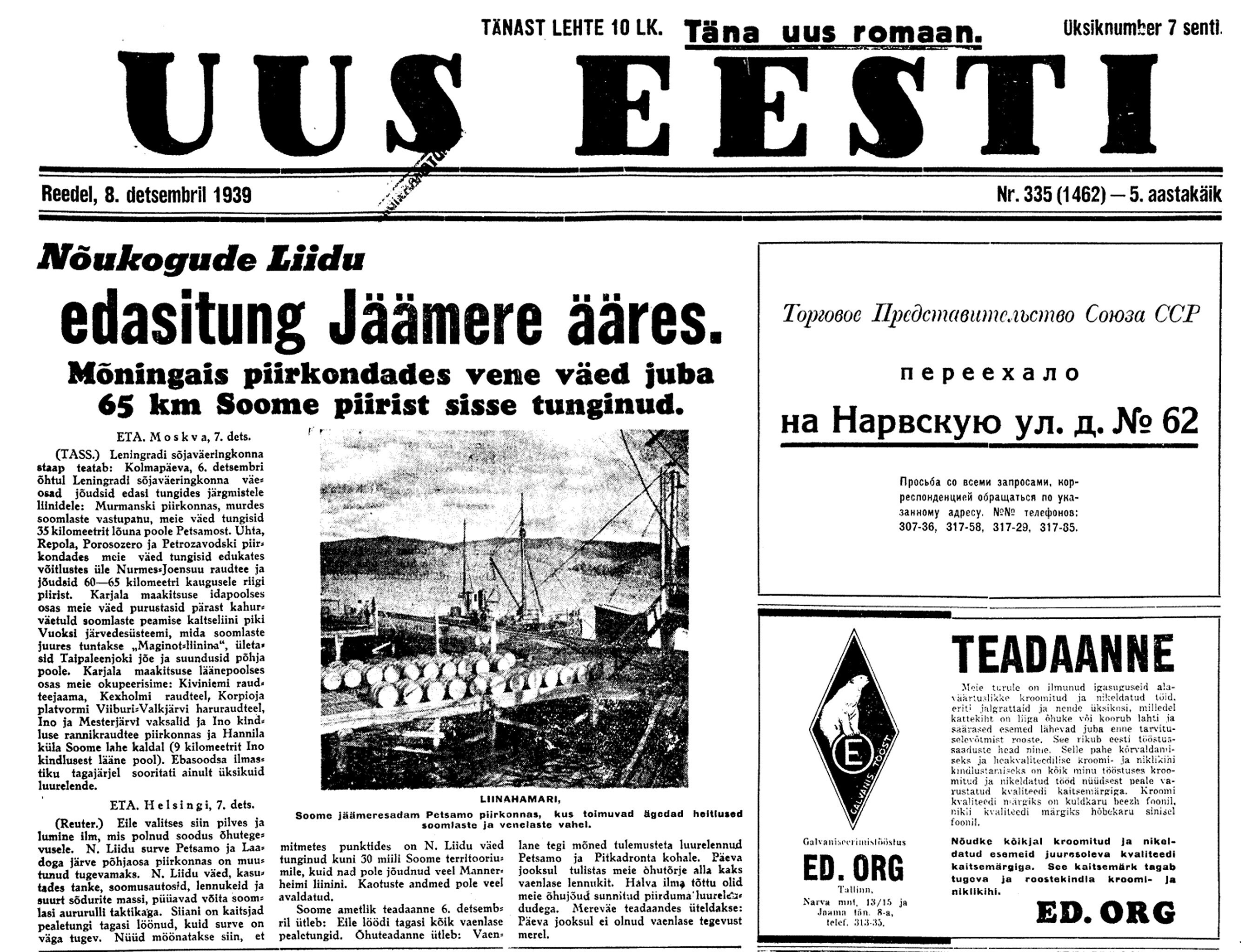 8. dets. Venelased rõhuvad kõvasti Soomele peale. Olevat tegevuses 1,2 milj. meest, 1000 tanki ja 500 aeroplaani (küll "Ceгодня" teade). Soomlased ütlevad endil mobiliseeritud olevat 500.000.