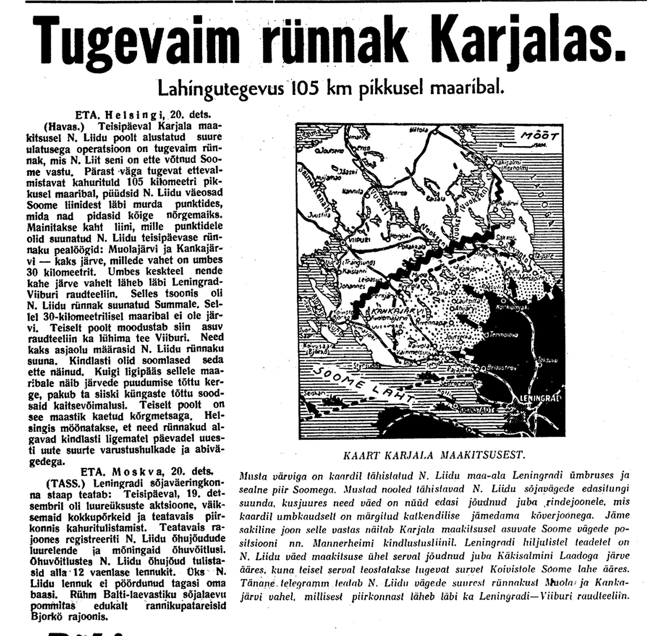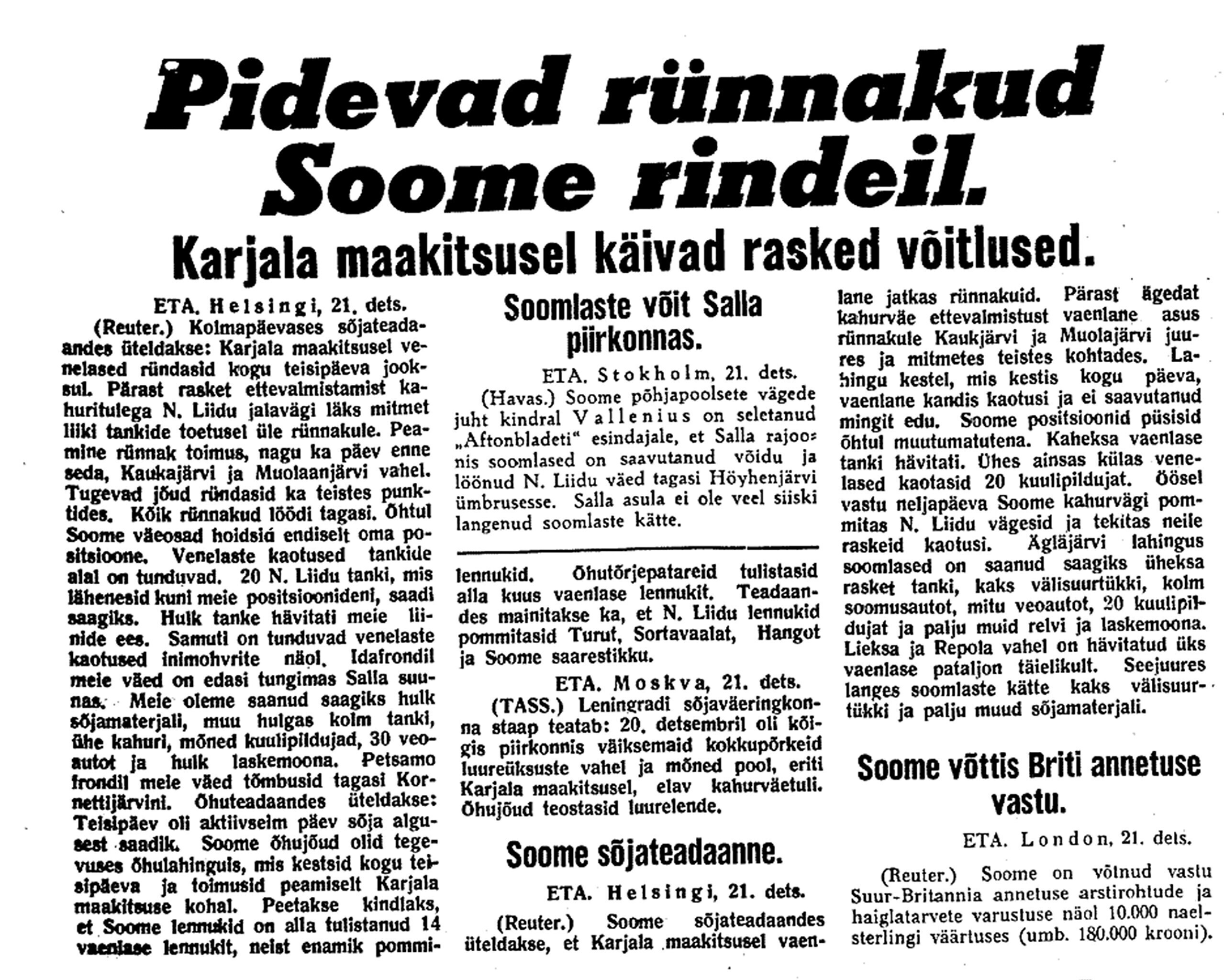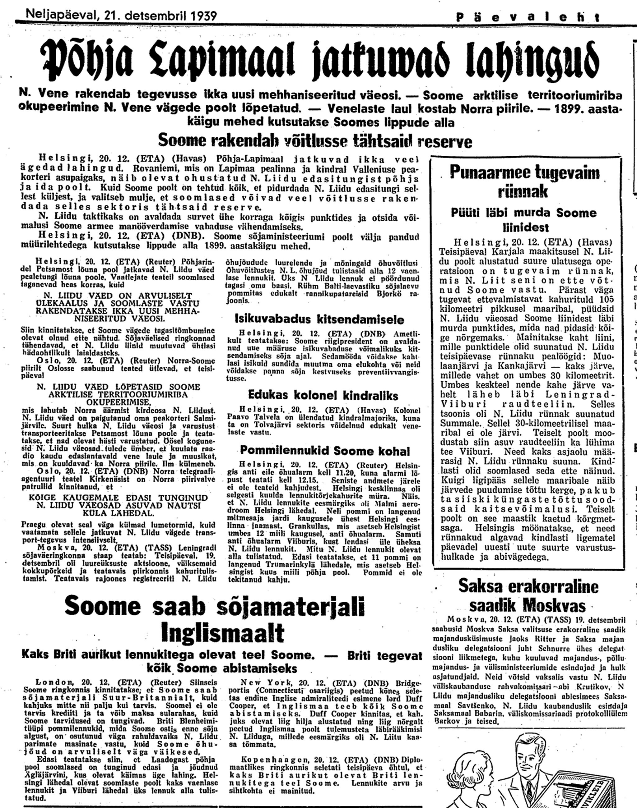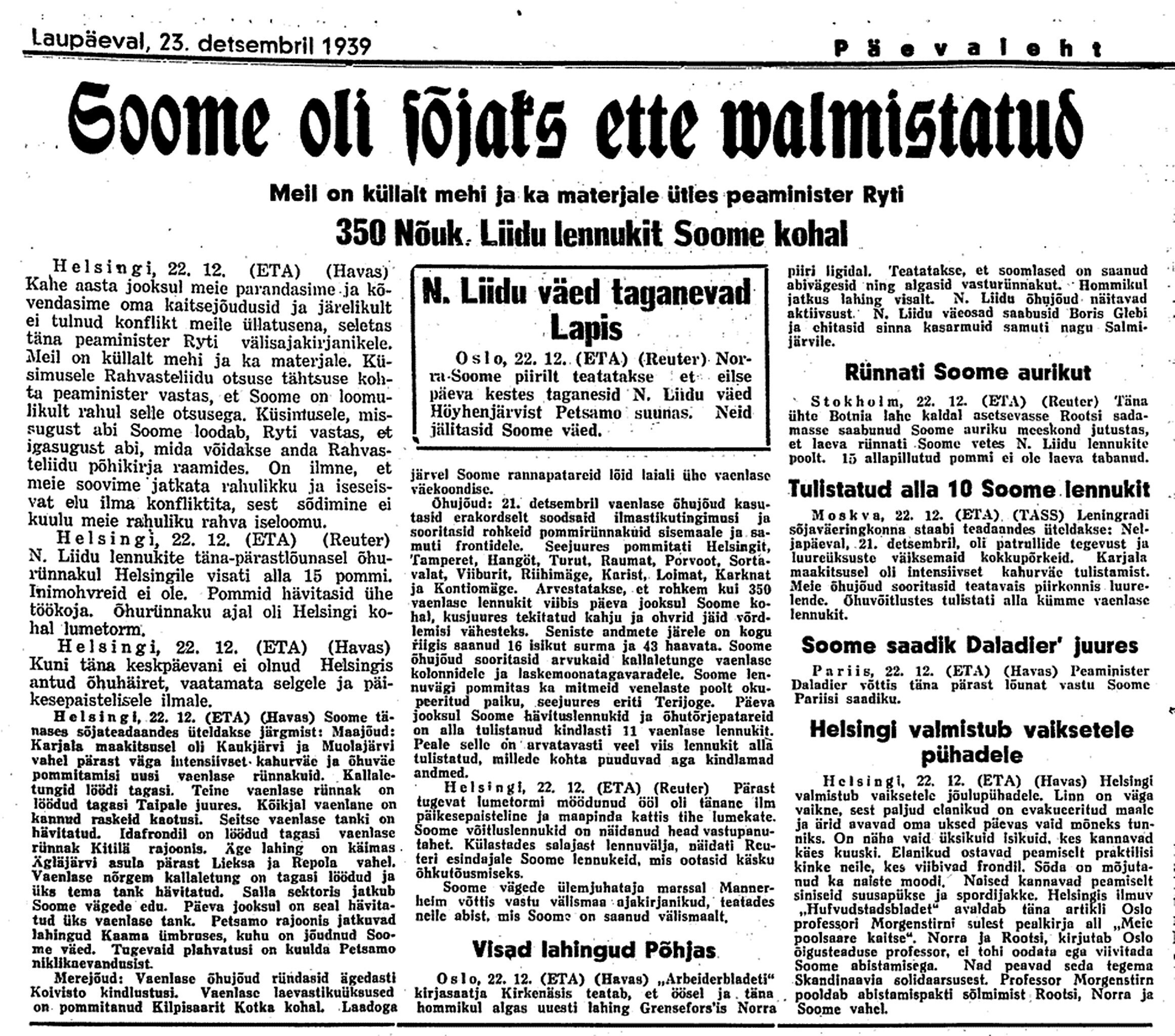 24. dets. Soome teatete järele olevat neil olnud edu. Karjala kannaksel olevat tagasi löödud Vene pealetung, millest 1000 tanki osa võtnud. 250 tanki olevat hävitatud. Ka põhja pool olevat edu olnud. Lennutegevus olevat elav, ca 300 Vene lennukit Soome kohal.