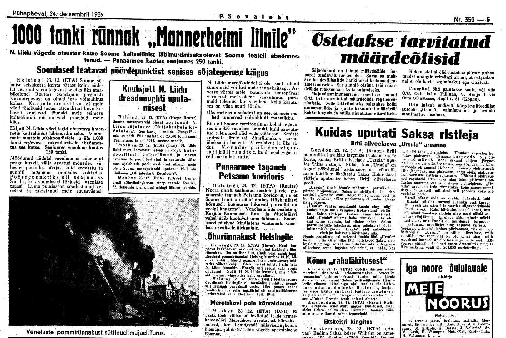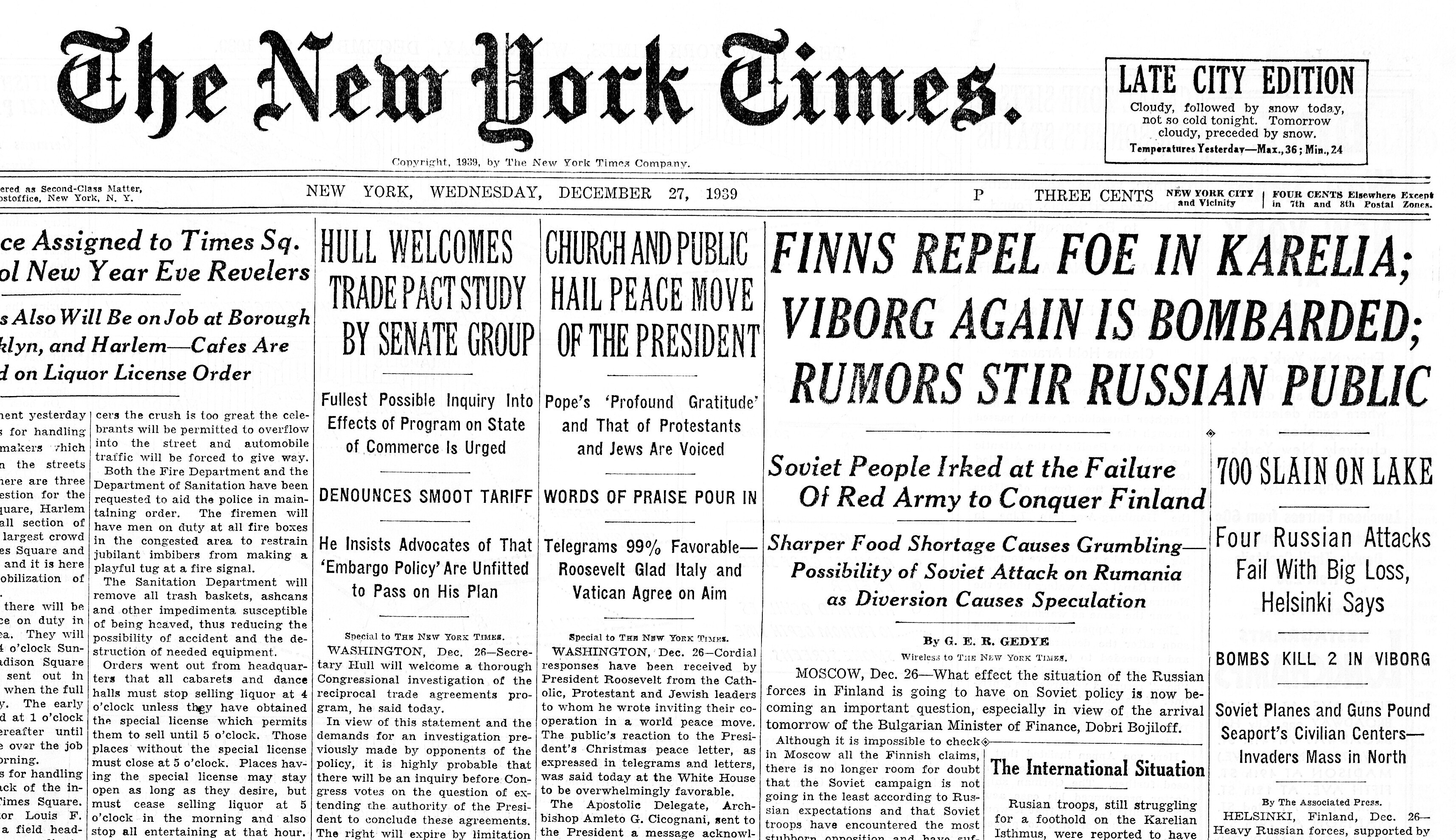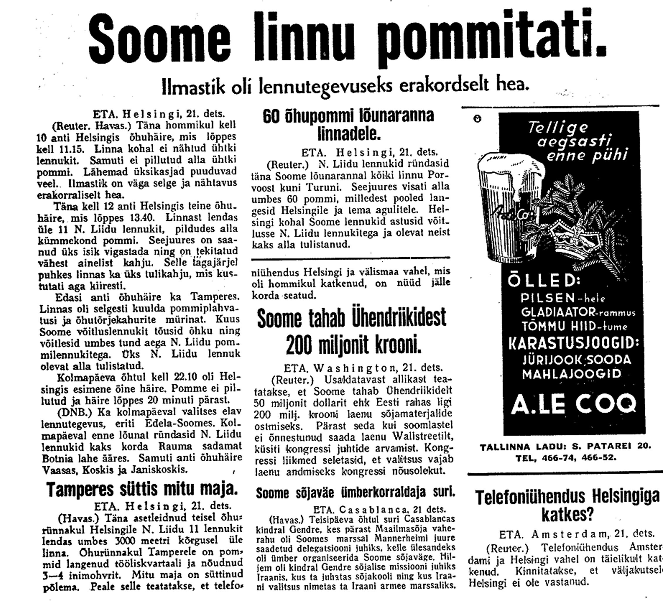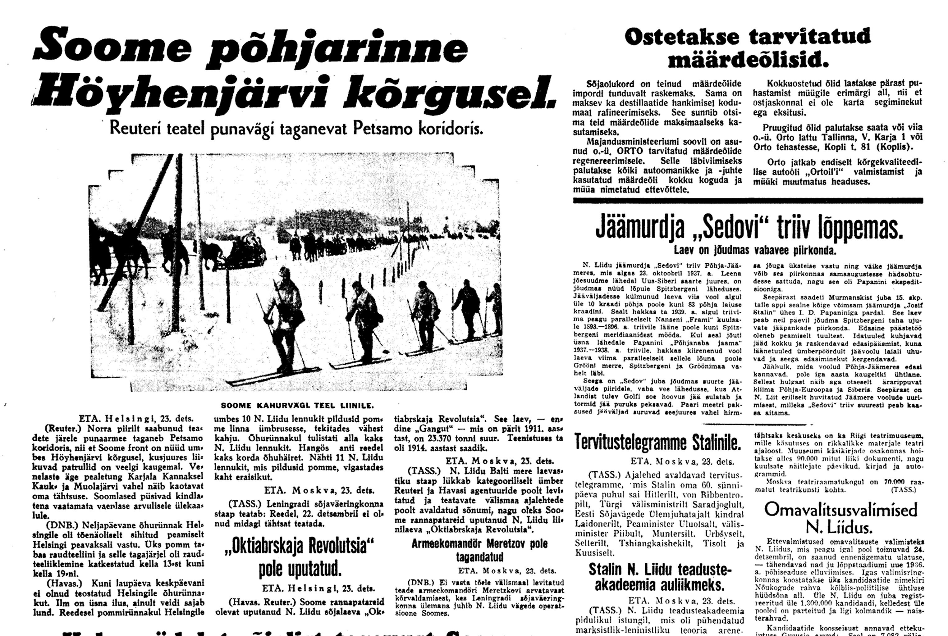24. dets. Soome teatete järele olevat neil olnud edu. Karjala kannaksel olevat tagasi löödud Vene pealetung, millest 1000 tanki osa võtnud. 250 tanki olevat hävitatud. Ka põhja pool olevat edu olnud. Lennutegevus olevat elav, ca 300 Vene lennukit Soome kohal.