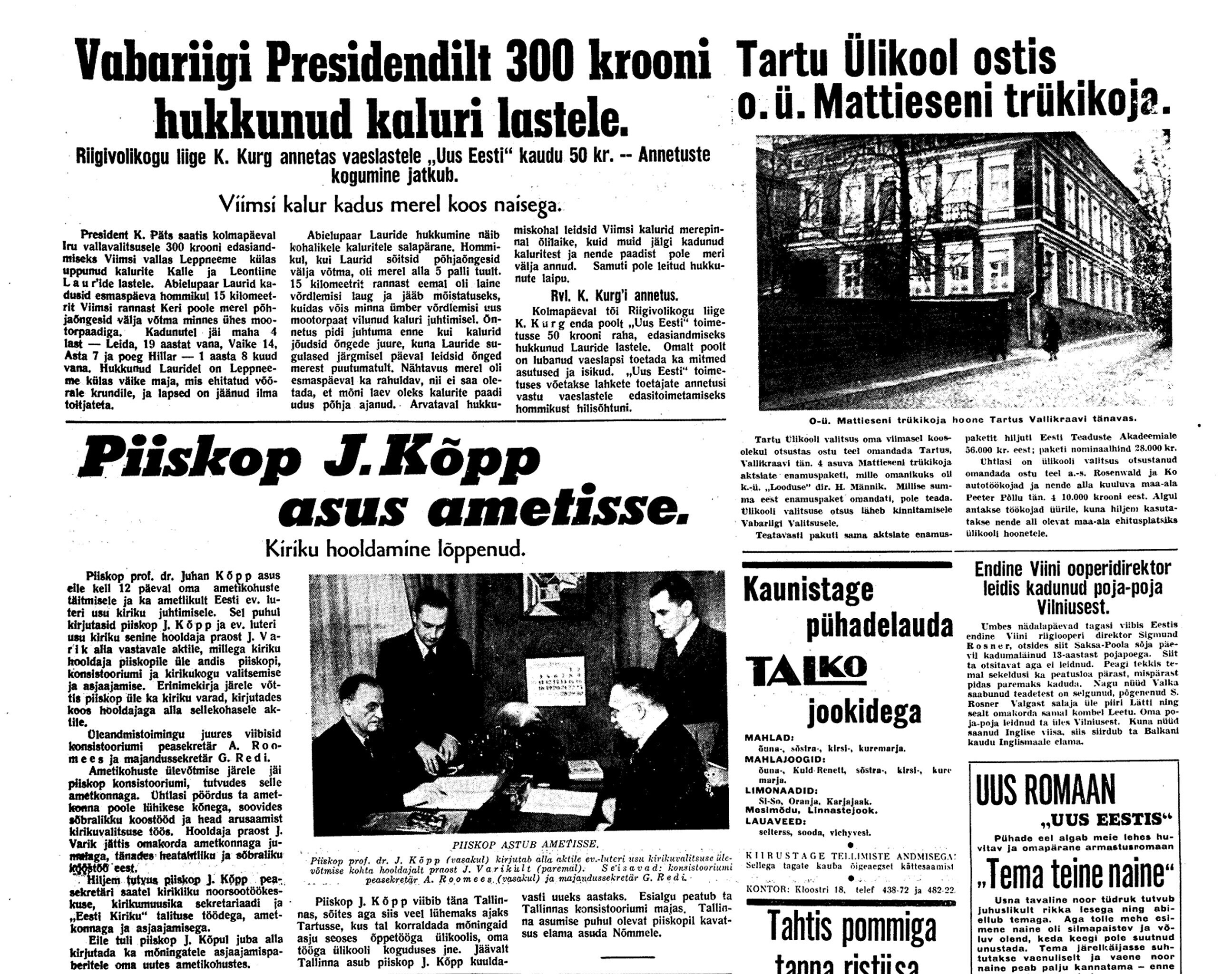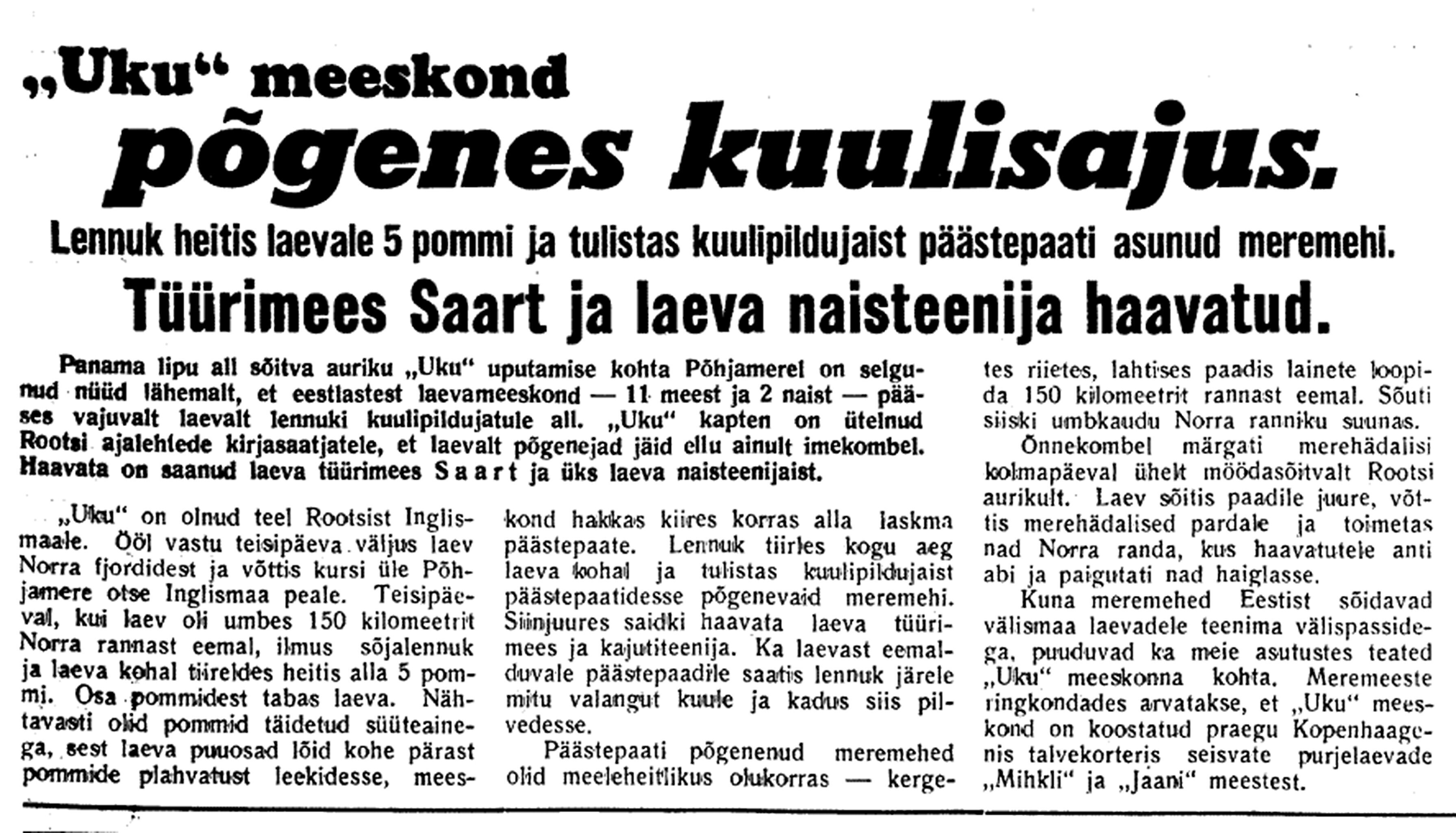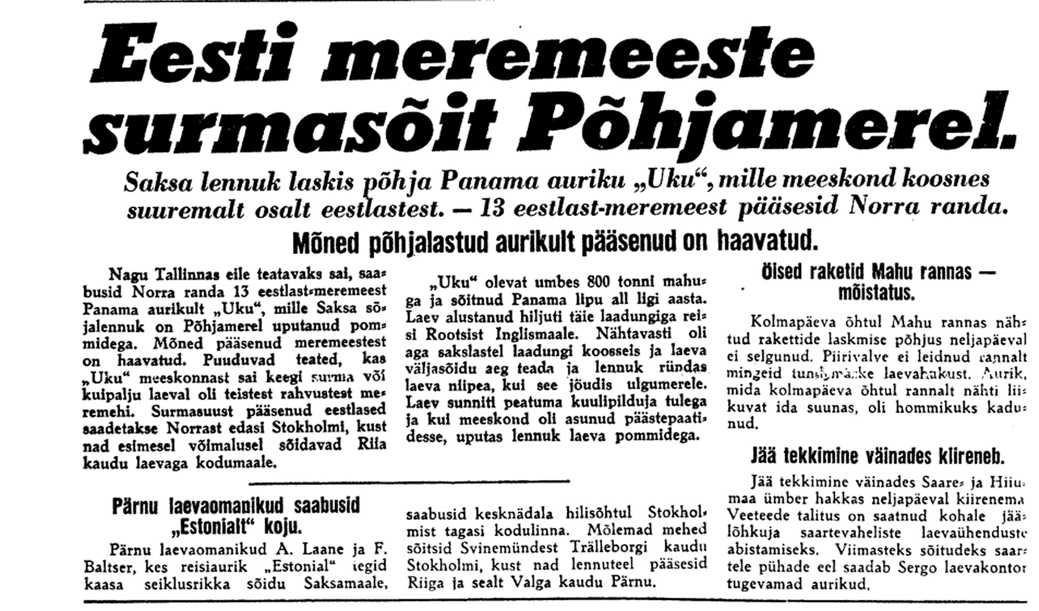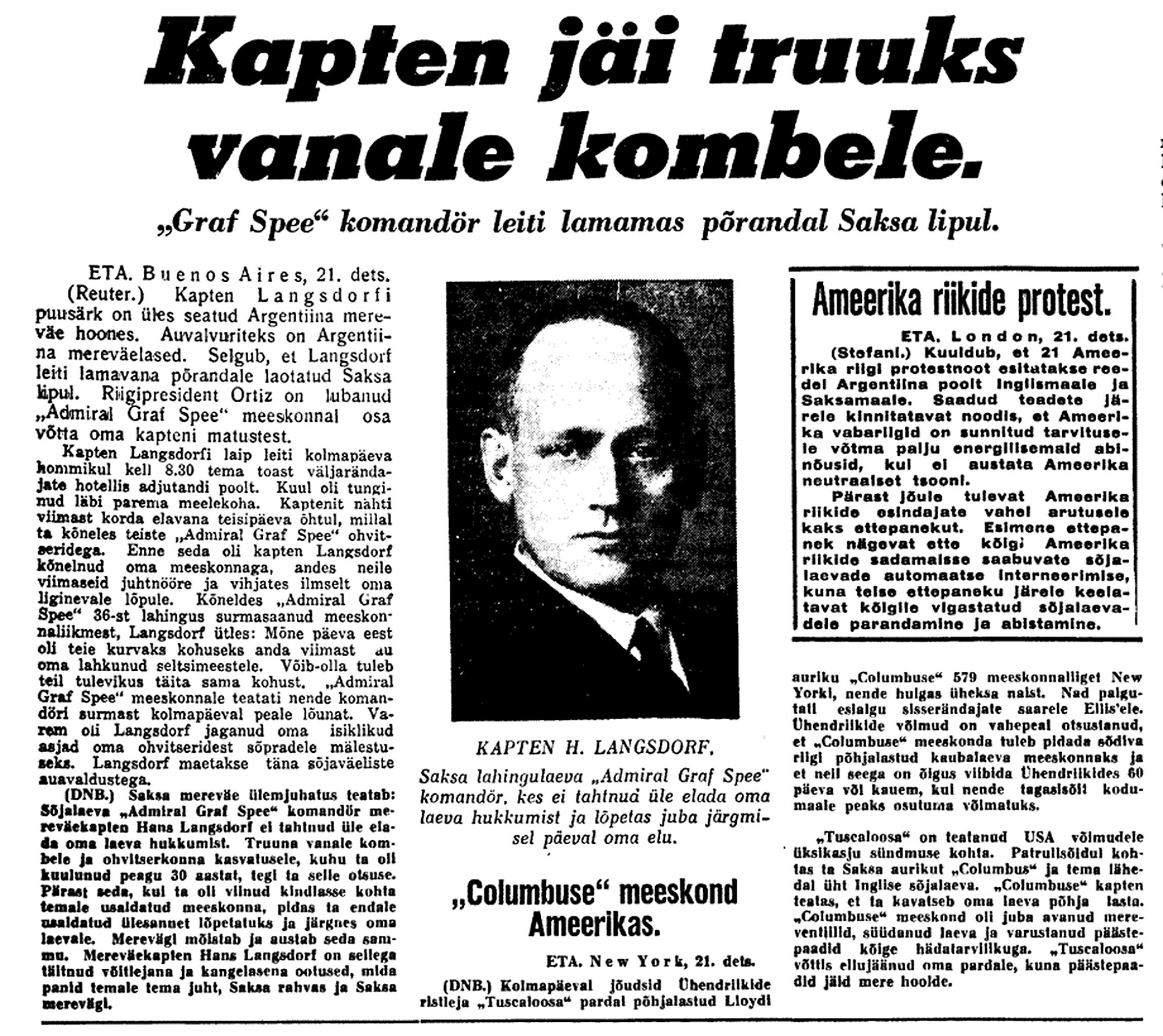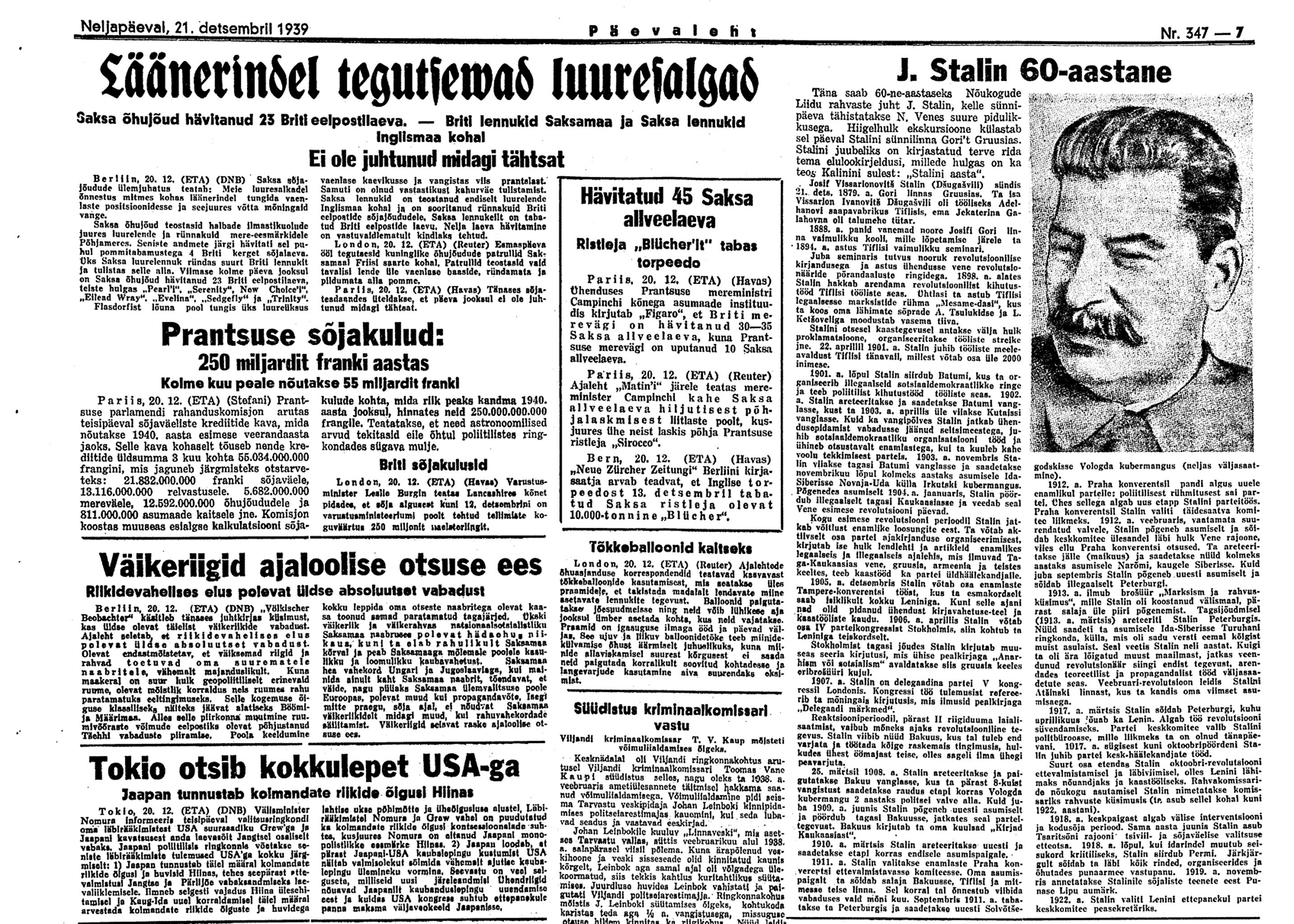 21. dets. V. V. koosolek. Sõjamehed ja Viitak seletavad, et Balti meres tegevuses tundmatuid jõude. Uputatakse Saksa laevu ja seda ka Skandinaavia rannikul. Kes need on, ei tea. Käisin EÜS-is. Assor, K. Matto, Küttis (+ 19 X 30).