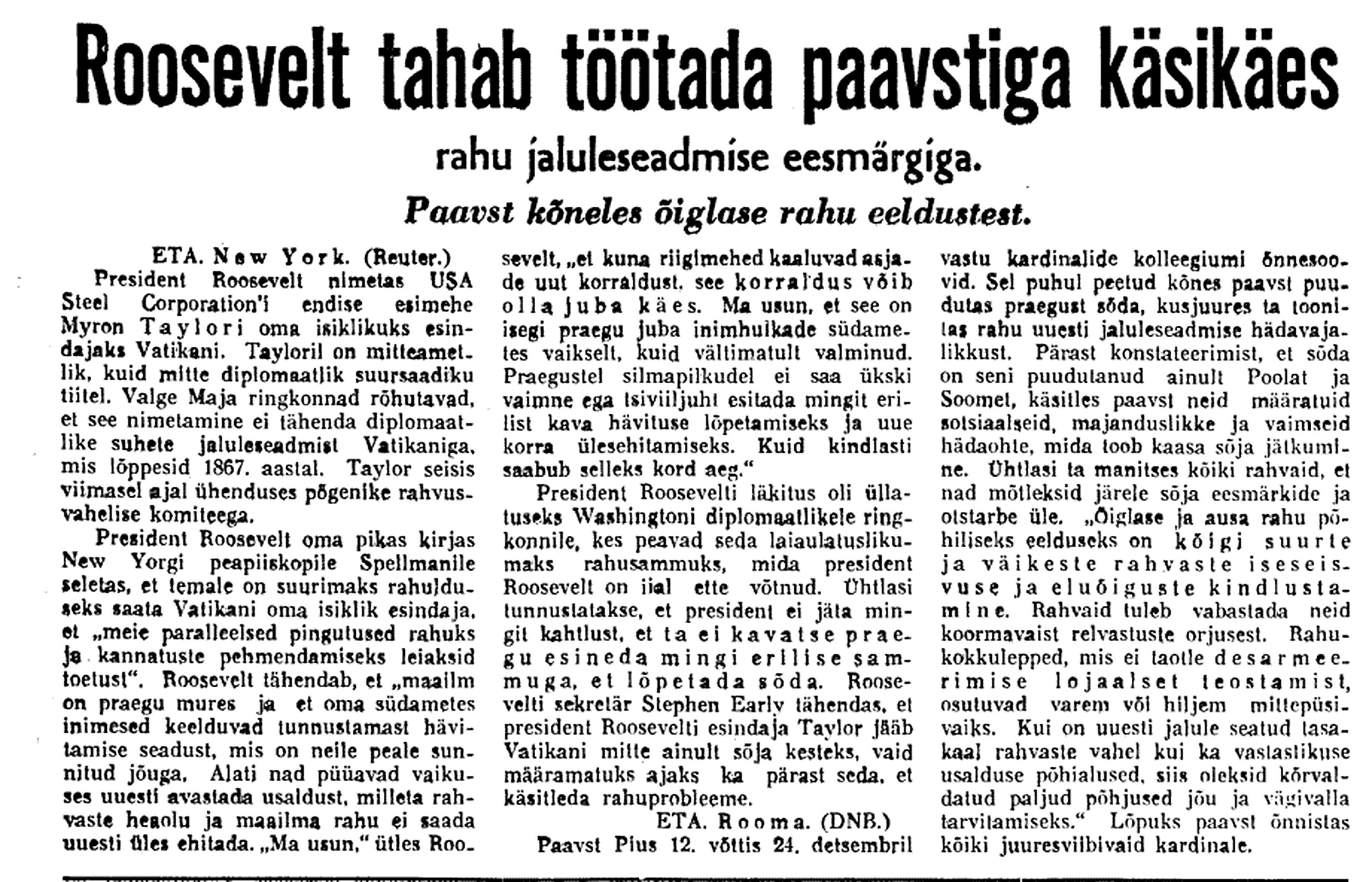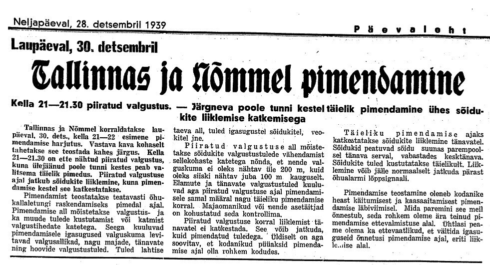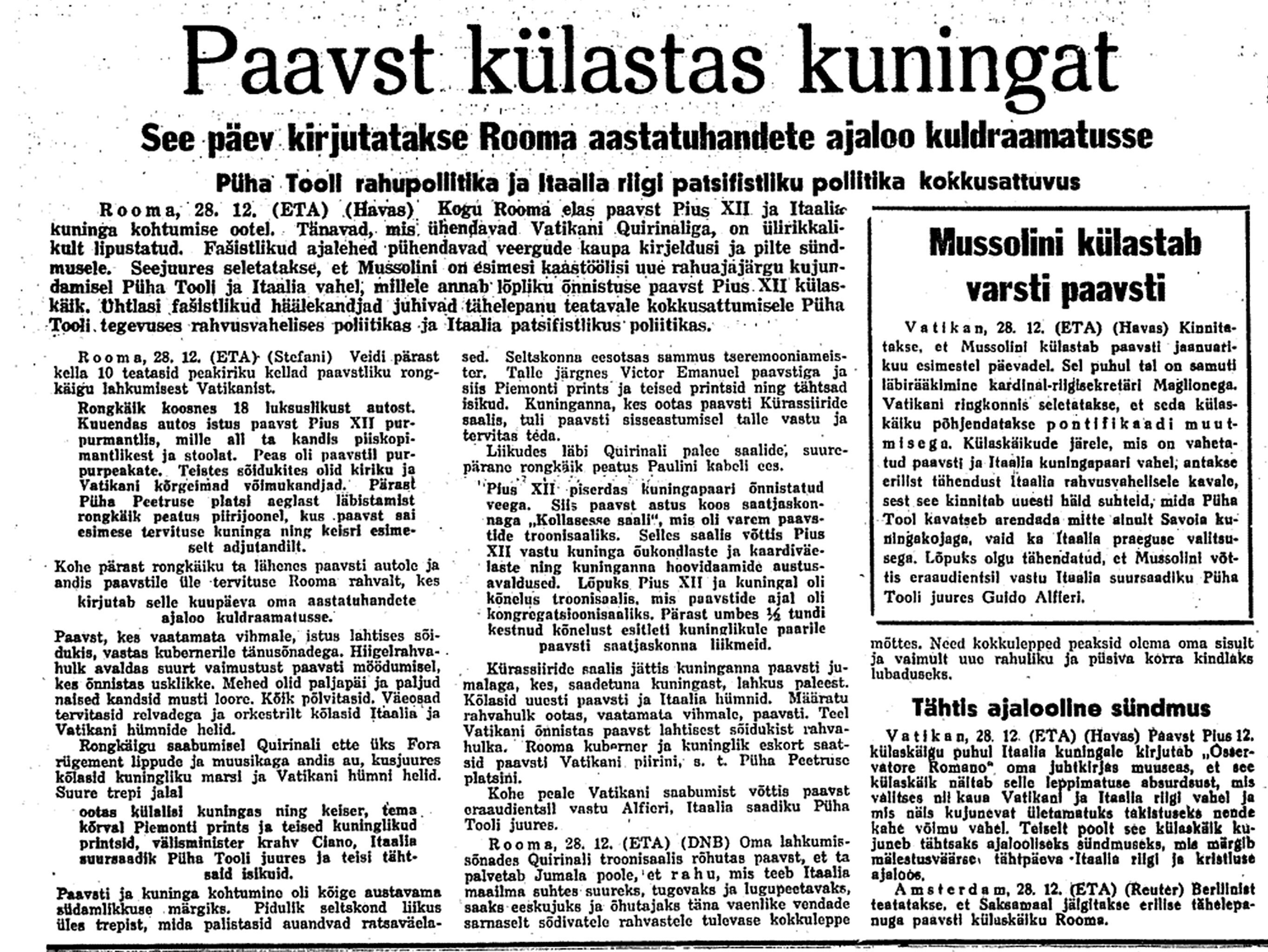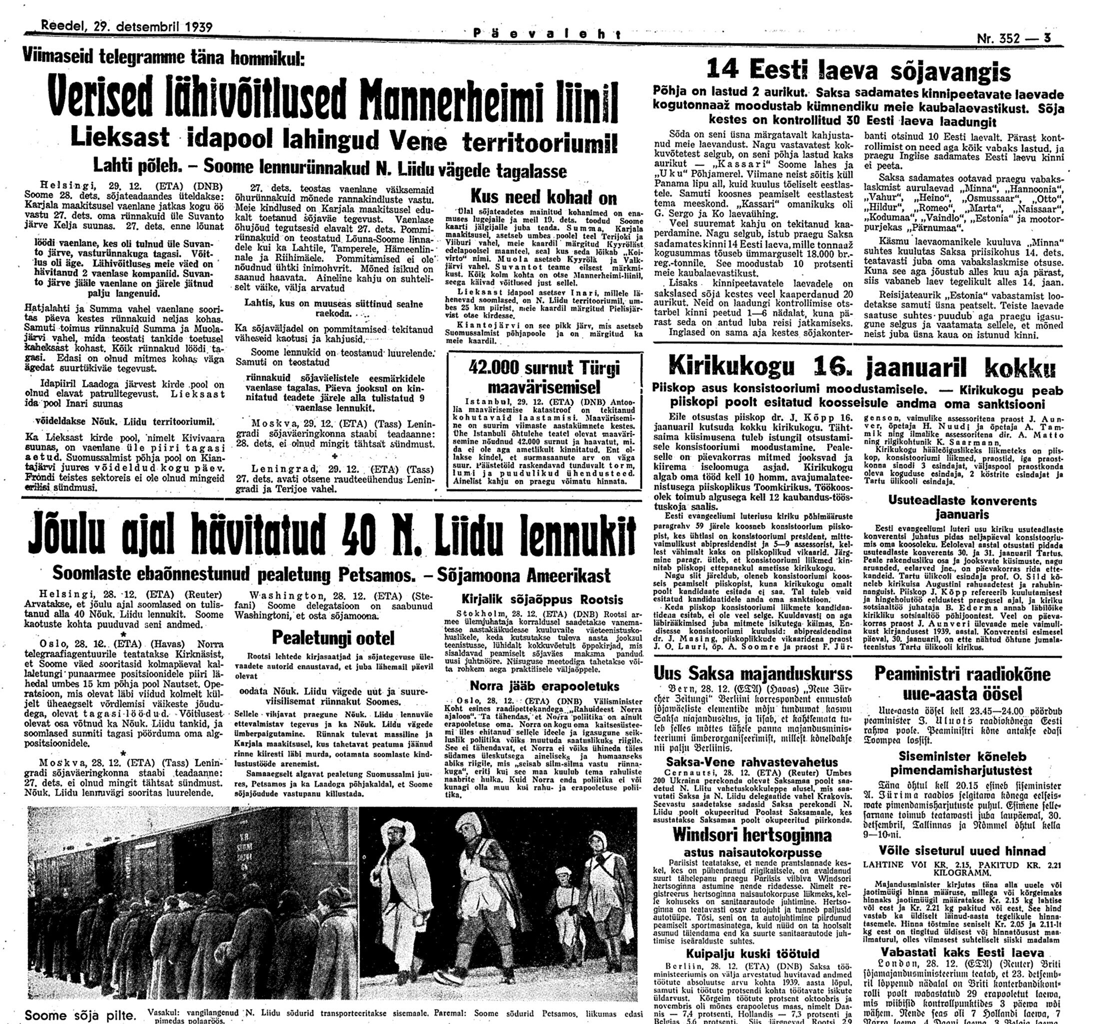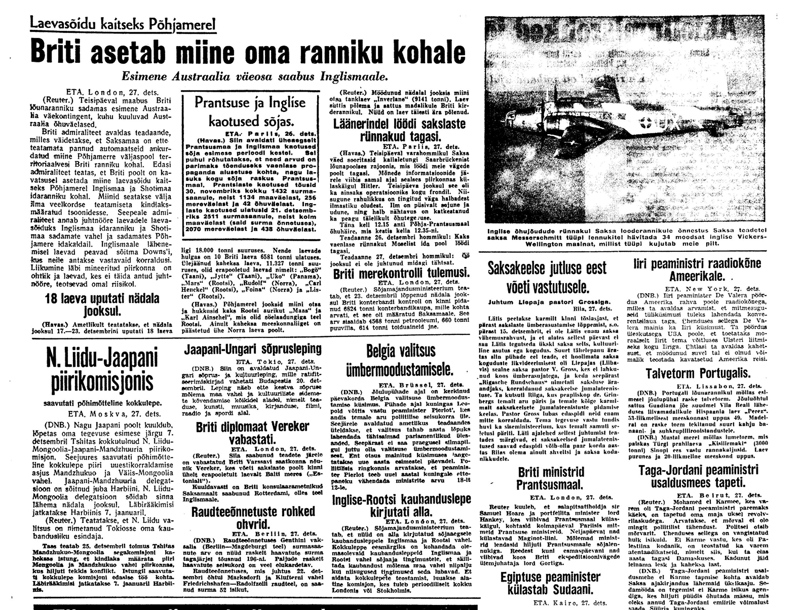 29. dets. Vab. Val. koosolek 17–24. [Välisminister Ants] Piip informeerib, et esimesel jõulupühal on saadud Soomelt noot, kus ta seletab, et Eesti rikub neutraliteeti, kuna lubab NSVL laevadel seista Tallinna sadamas. Ähvardab tarvitusele võtta abinõusid.