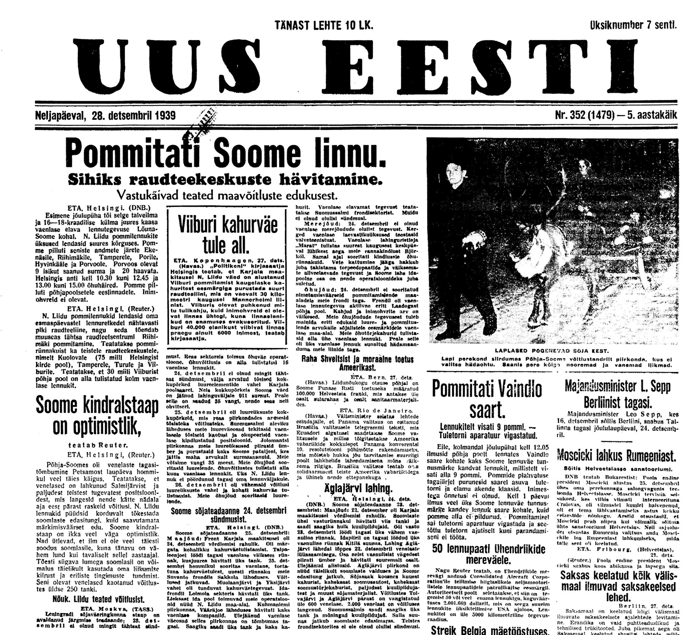 26. detsembril lükkas Eesti Välisministeerium protesti tagasi, kinnitades, et NSV Liit ja Soome ei ole sõdivad riigid (NSV Liit ei kuulutanud Soomet rünnates talle sõda). Juba 25. detsembril sõitis Soome allveelaev Vesihiisi Paldiski alla miine panema, asetades merre 19 meremiini. 27. detsembril pommitasid Soome lennukid Vaindloo saart ja kahjustasid tuletorni, mida Nõukogude sõjalaevad navigeerimisel kasutasid.