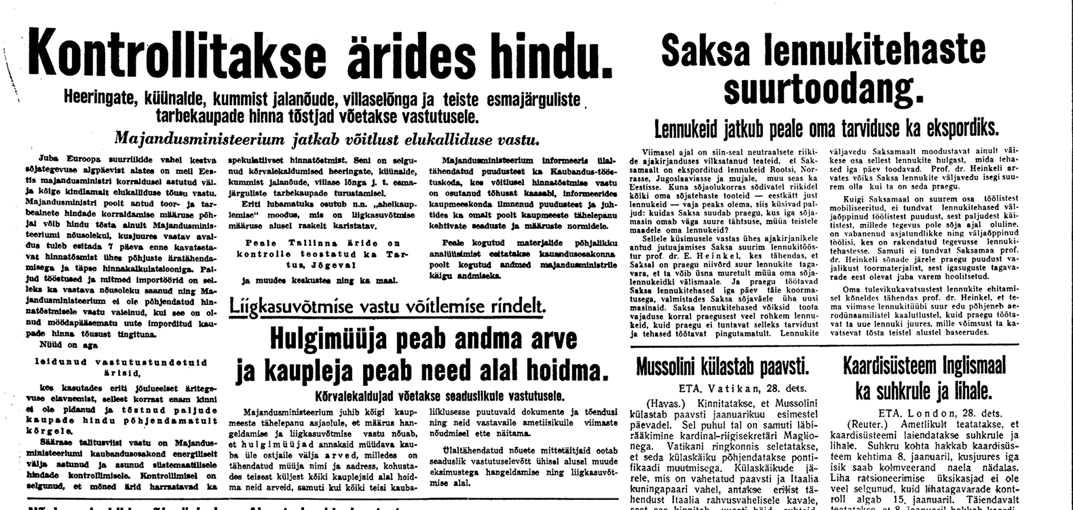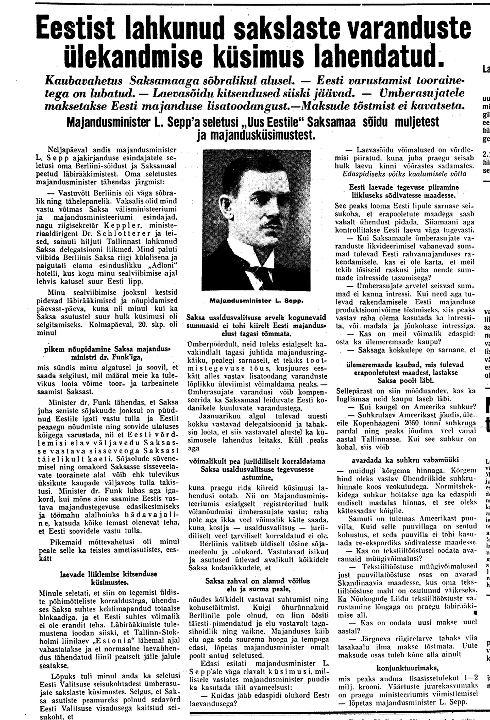 [Majandusminster Leo] Sepp on Saksas suure pompiga vastu võetud, aga nõudmised olnud kategoorilised. Ei sallita, et viiksime kaupu neutraalmaadesse, kust nad võiksid edasi liikuda Inglismaale. Siiski saadavat aru meie eksporti vaba valuutas neutraalmaadesse ca 15 milj. kr. ulatuses.