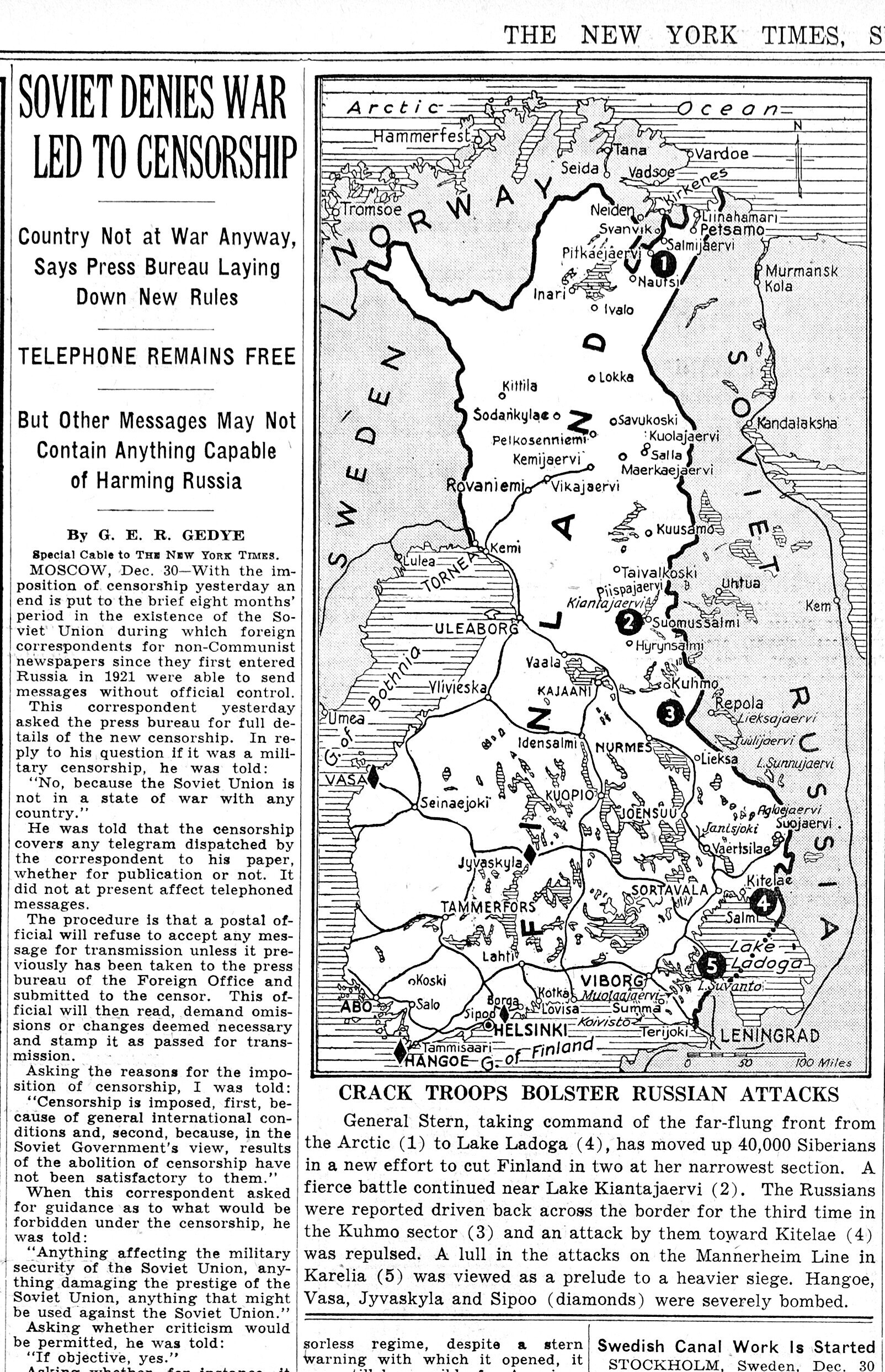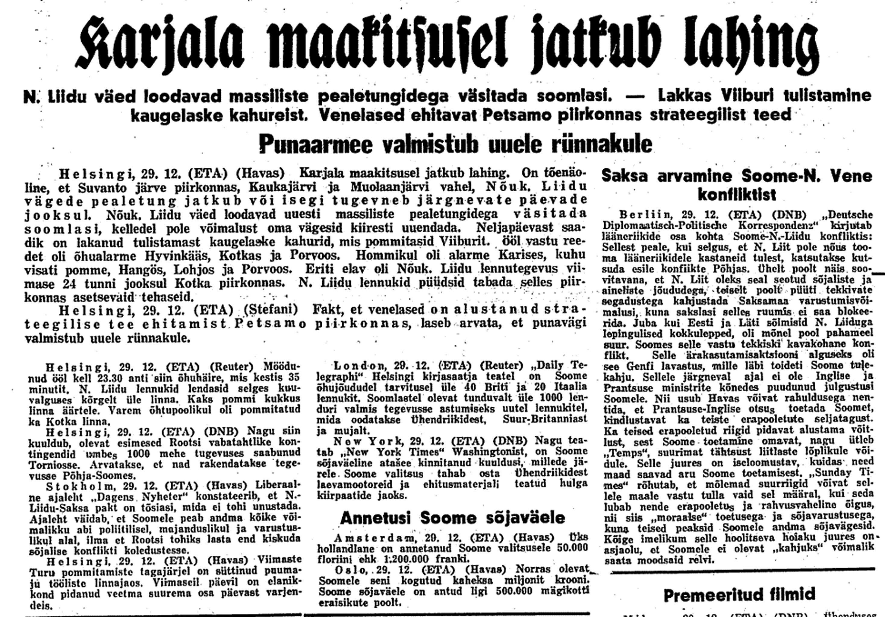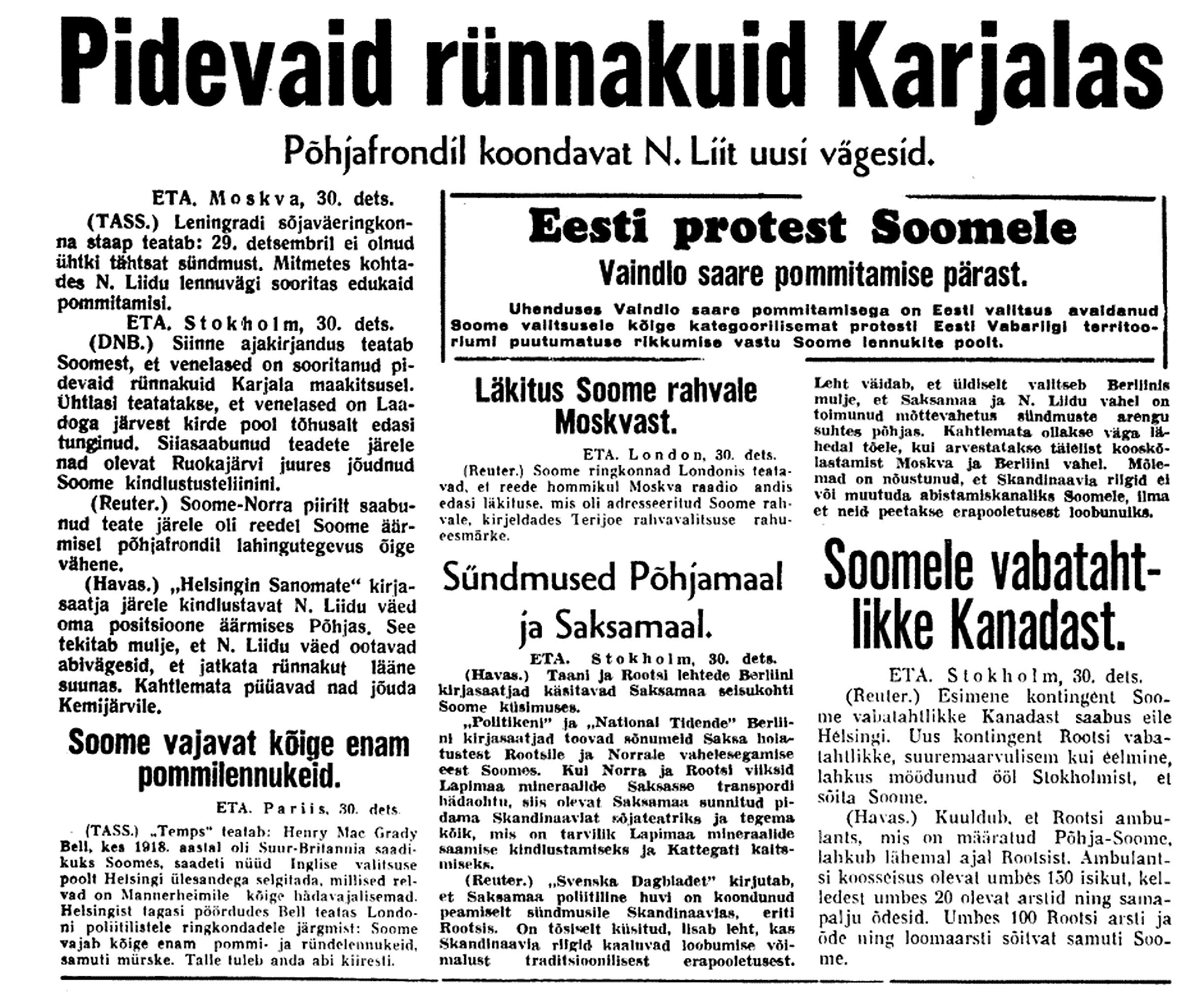 31. dets. [Otto] Sternbecki pool kell 20 ½–3. Kindral on Soome sõber. Ütleb, et venelane kaotanud Soome sõjas 1 kuu jooksul 100.000 meest. Soomlaste suusaosad olevat 3 kohas Muurmani raudteeni jõudnud ja seda põhjalikult lõhkunud.