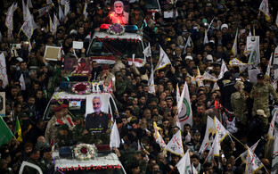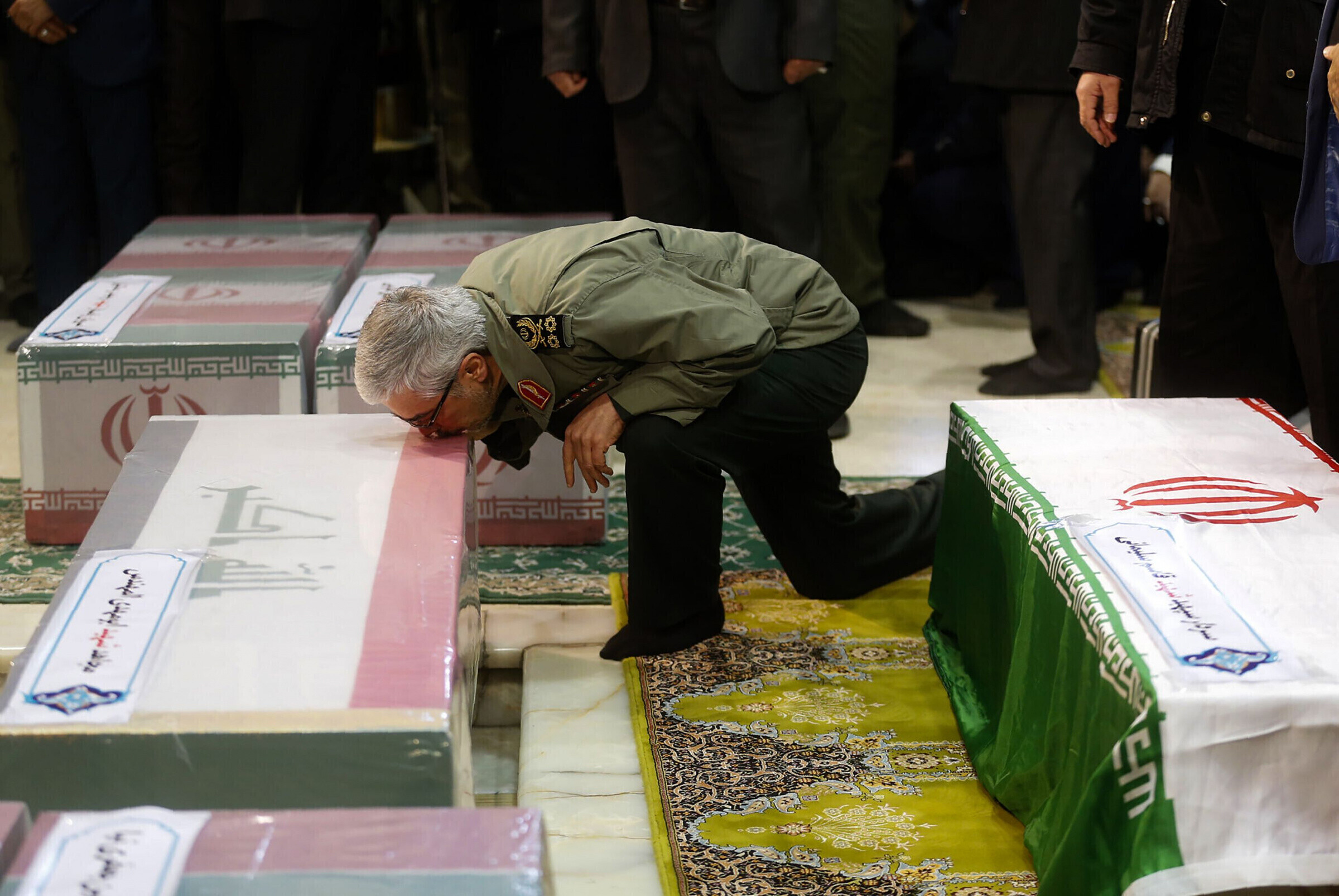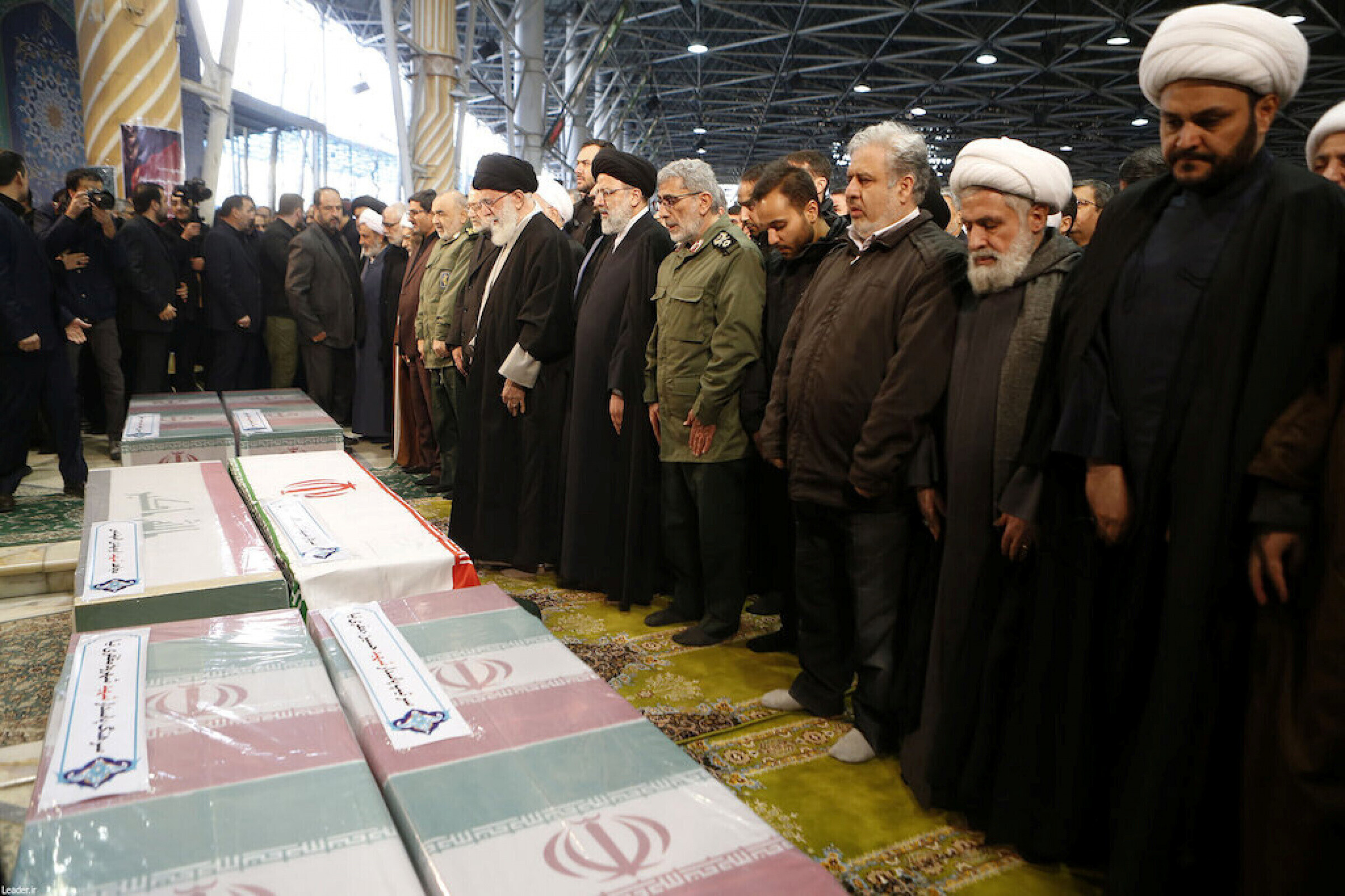 Khamenei nuttis Solemaini ja veel viie rünnakus hukkunud "märtri" lippudega kaetud sarkade juures palvetades. Riigi kõrgeima juhi kõrval seisid Soleimani poeg, tapetud kindrali järeltulija Qudsi juhi kohal Esmail Qaani, president Hassan Rouhani, parlamendi spiiker Ali Larijani ja revolutsioonikaardi ülem kindralmajor Hossein Salami.