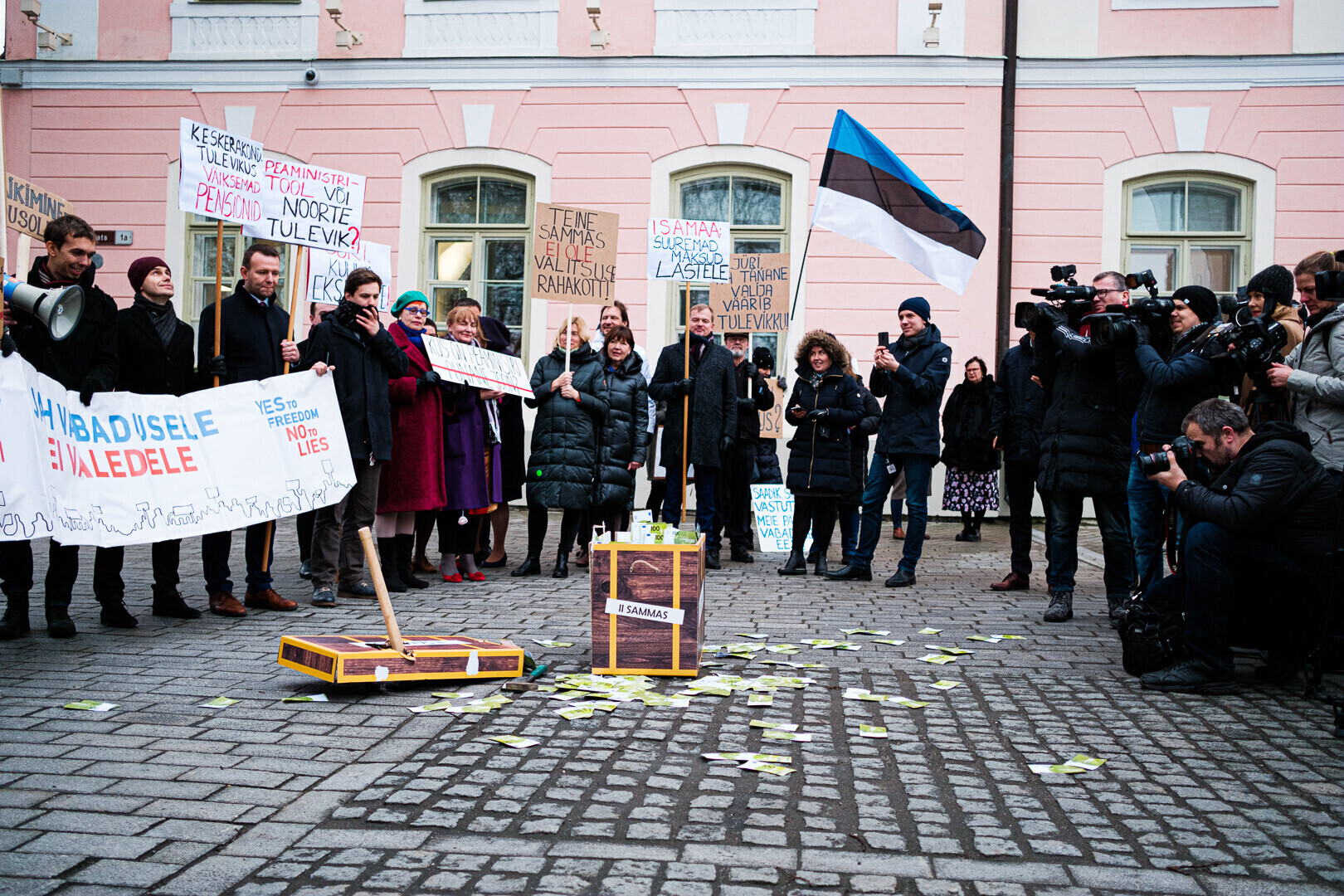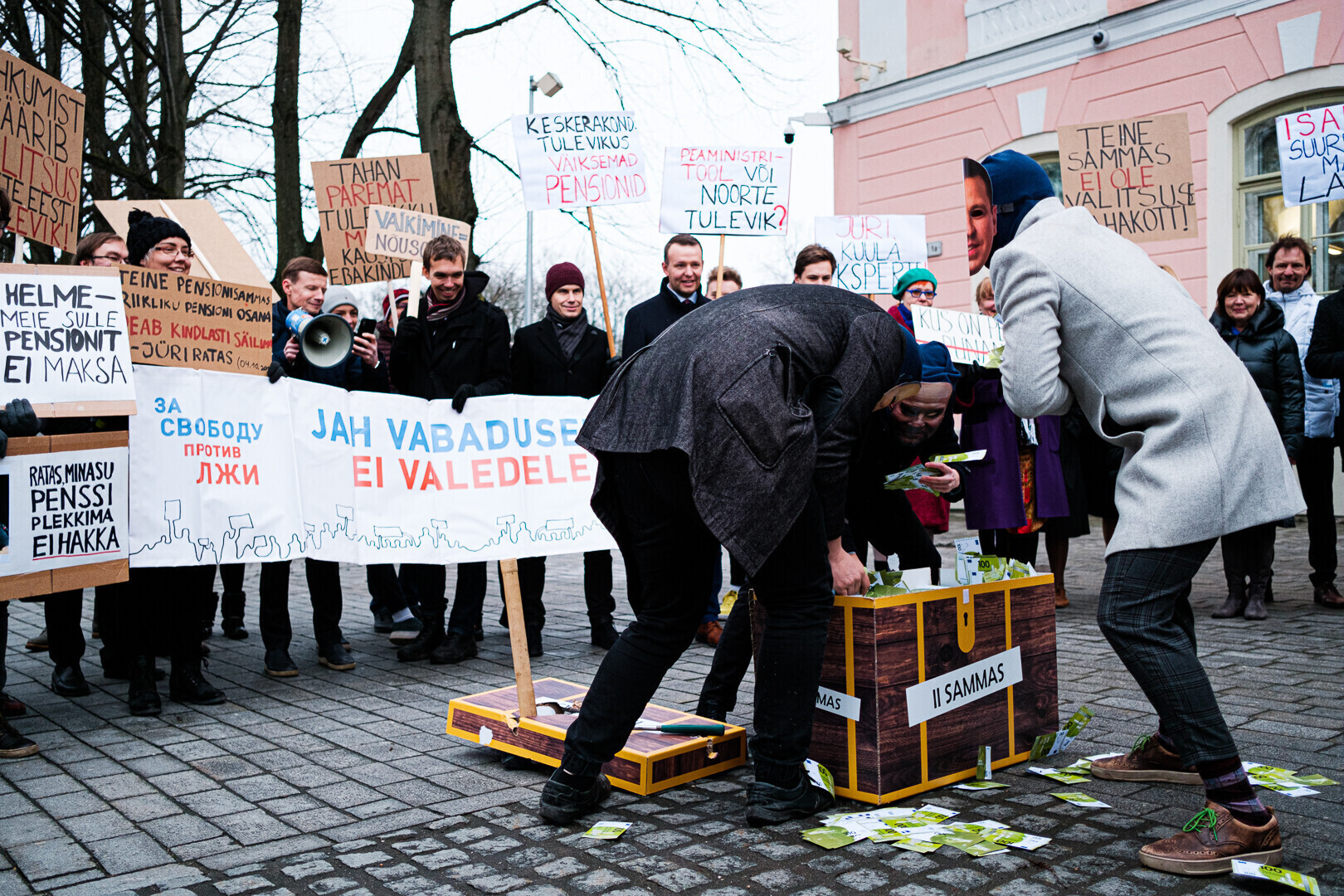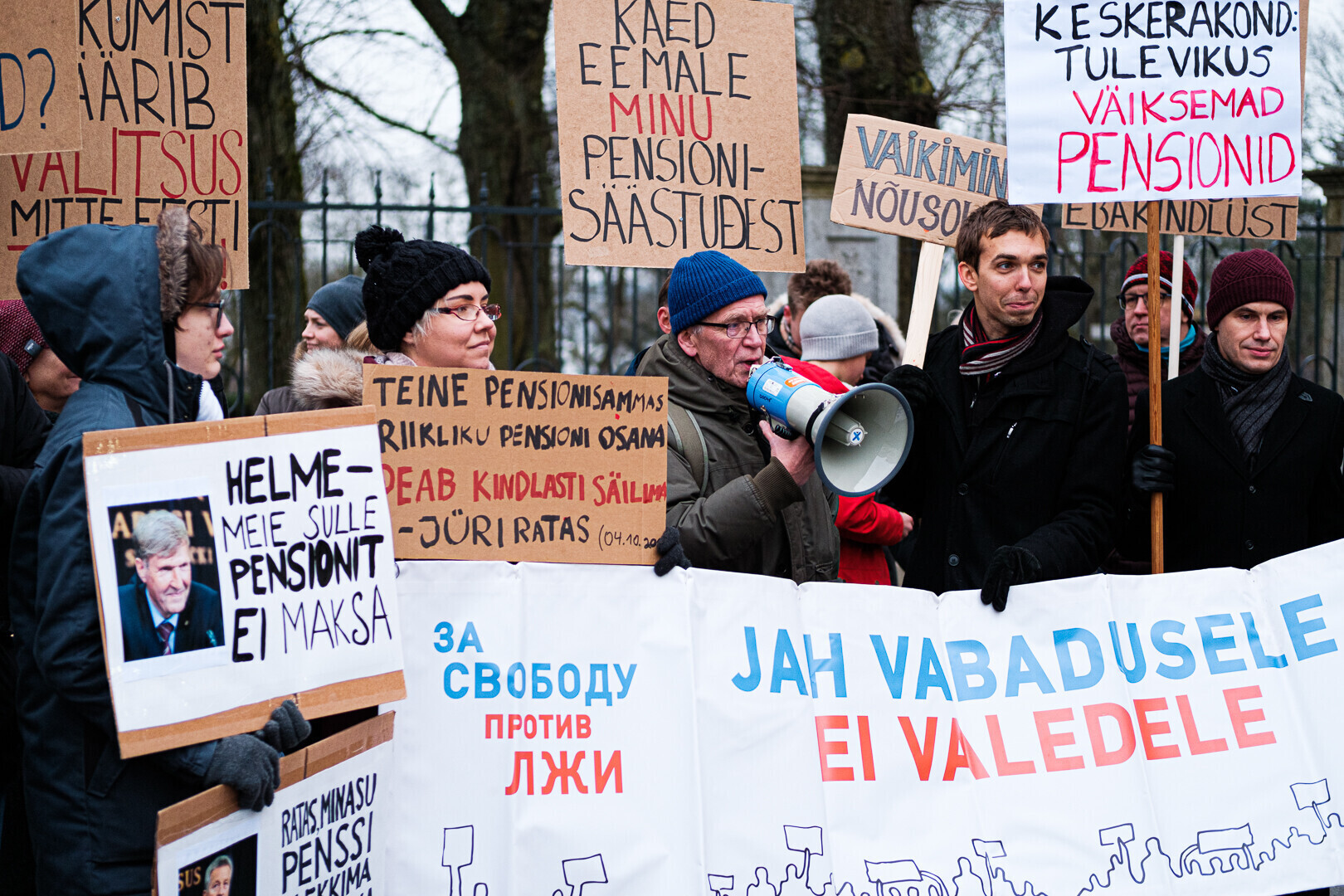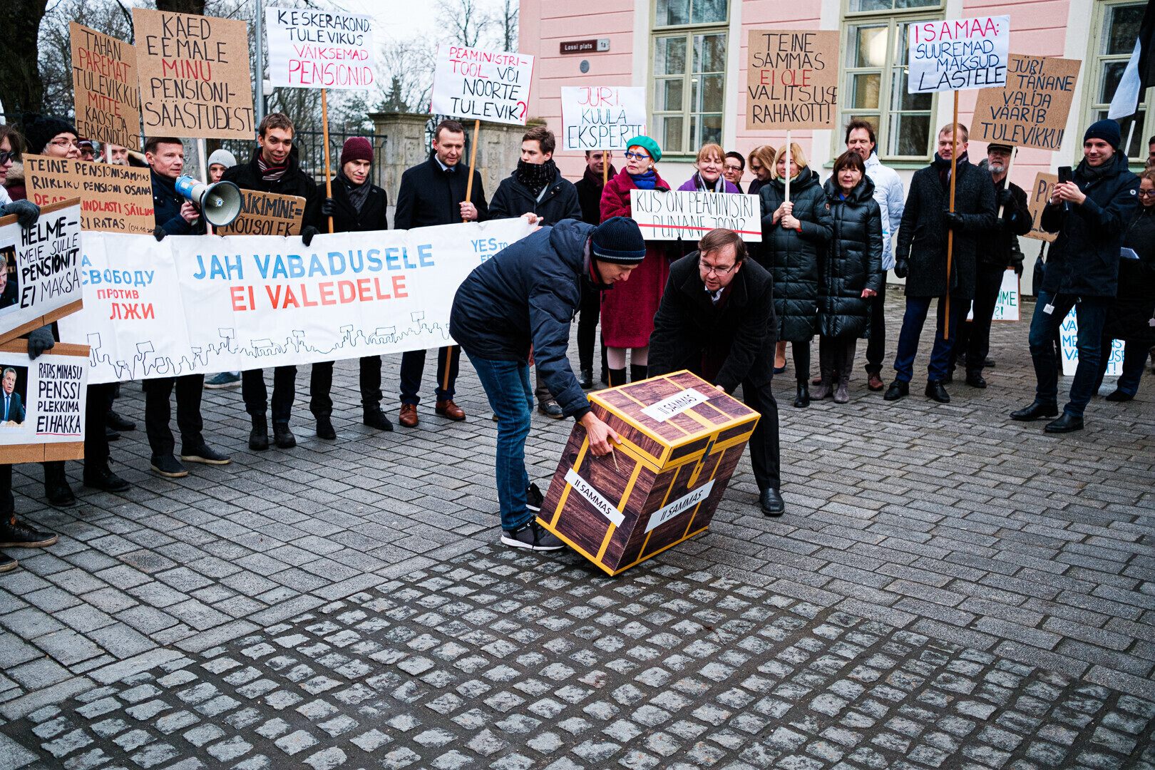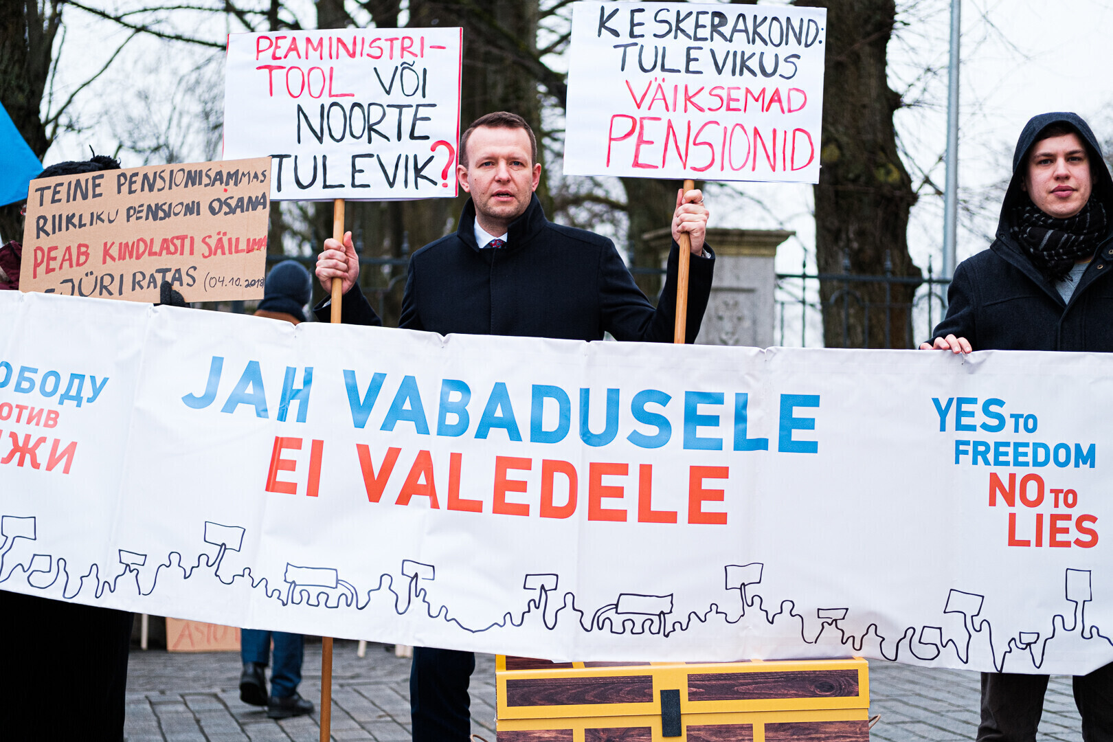 Kodanikuliikumised "Jah vabadusele, ei valedele" ja Pensionikogujate Ühendus protestisid riigikogu ees valitsuse pensionireformi vastu. Meeleavaldusega liitusid ka opositsioonierakondade esindajad.