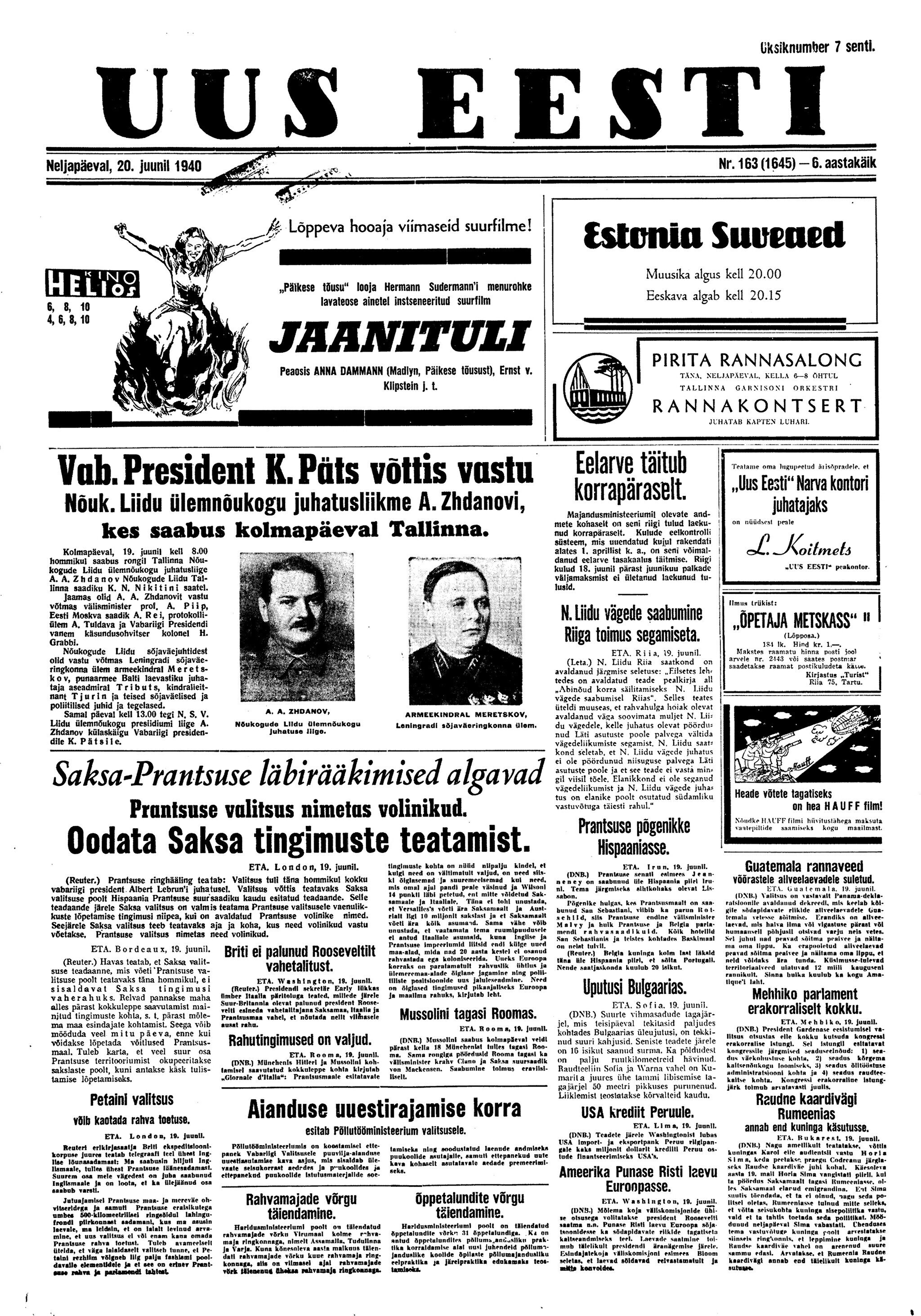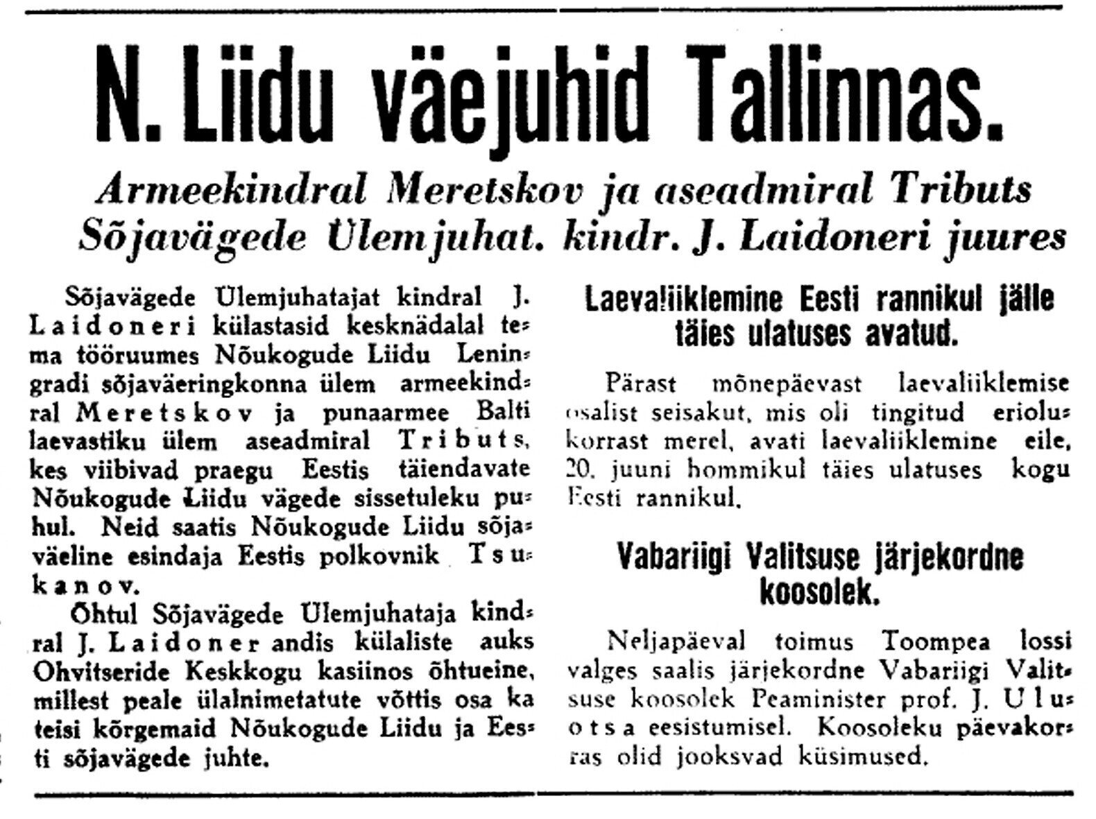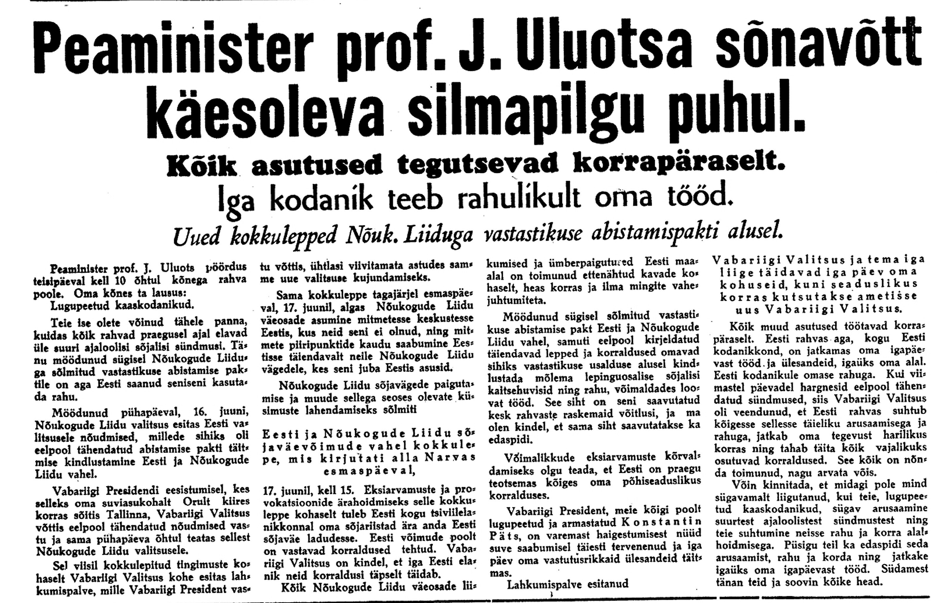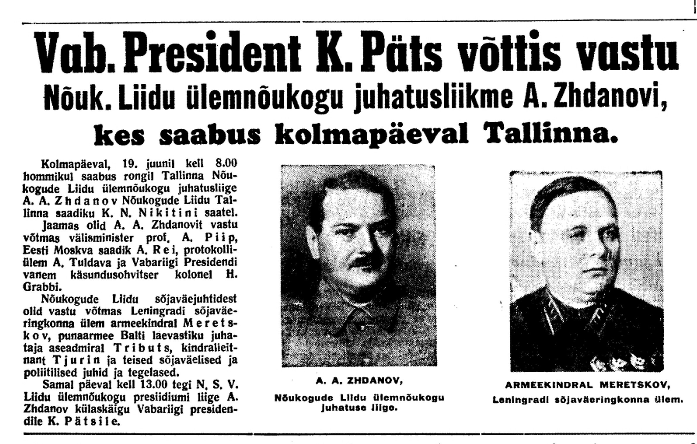 President osutab parlamendi kokkukutsumise mõtet, mis aga kahjuks maha laidetakse ([välisminister Ants] Piip, Jürima). Laidoner arvab, et Šdanov [Ždanov], kes uue Valitsuse kujundamise asjus Eestis viibib, otsib miitingult tuge võimalikkude loosungite näol, et nõuda rohkem punast värvi kujundavasse valitsusse.