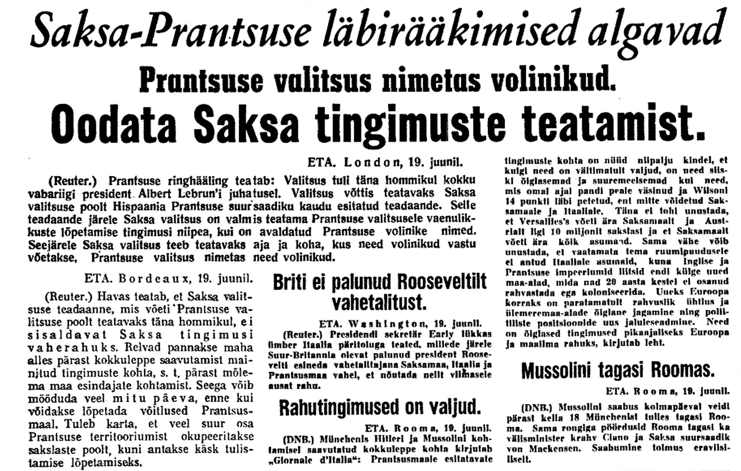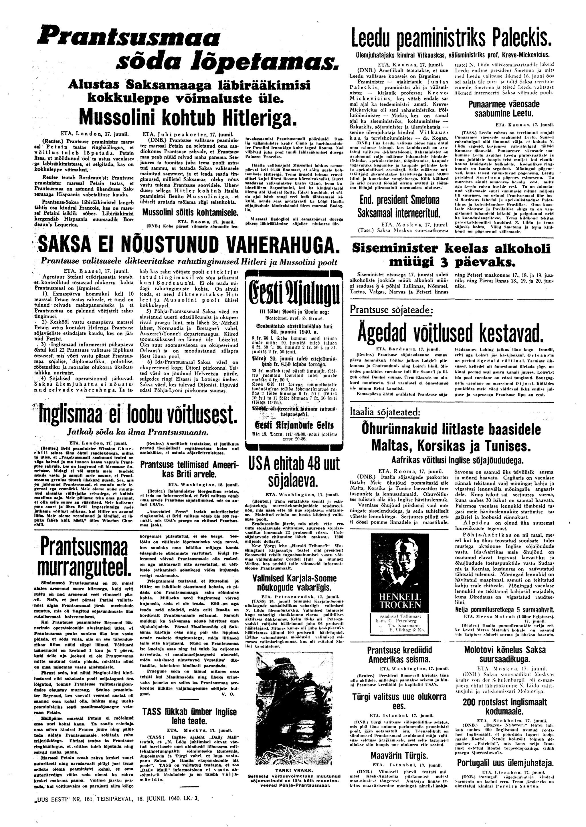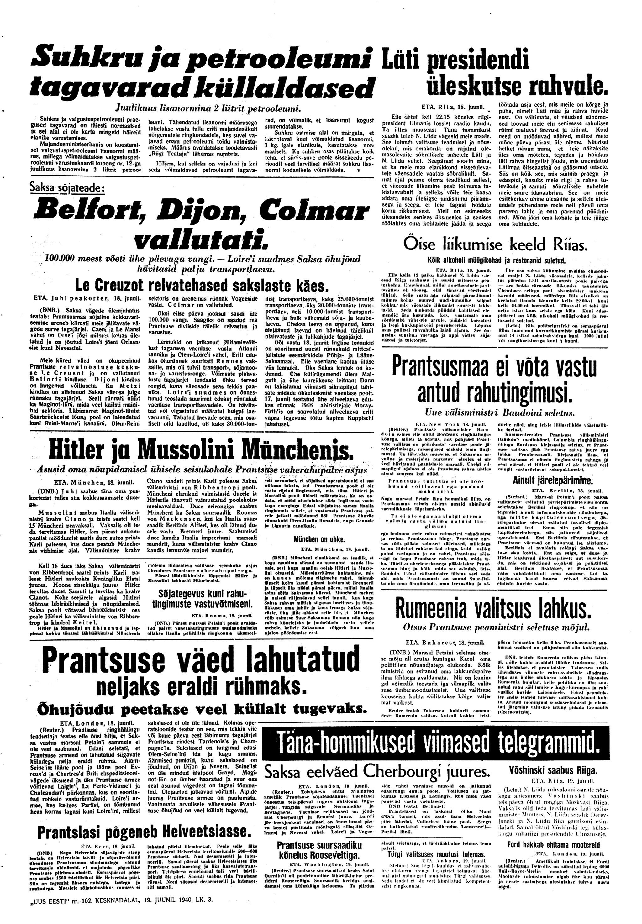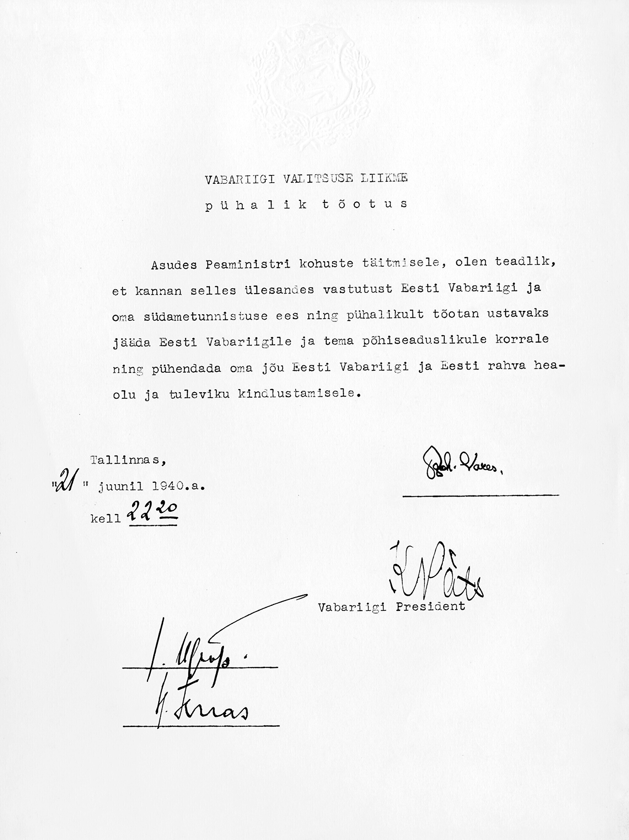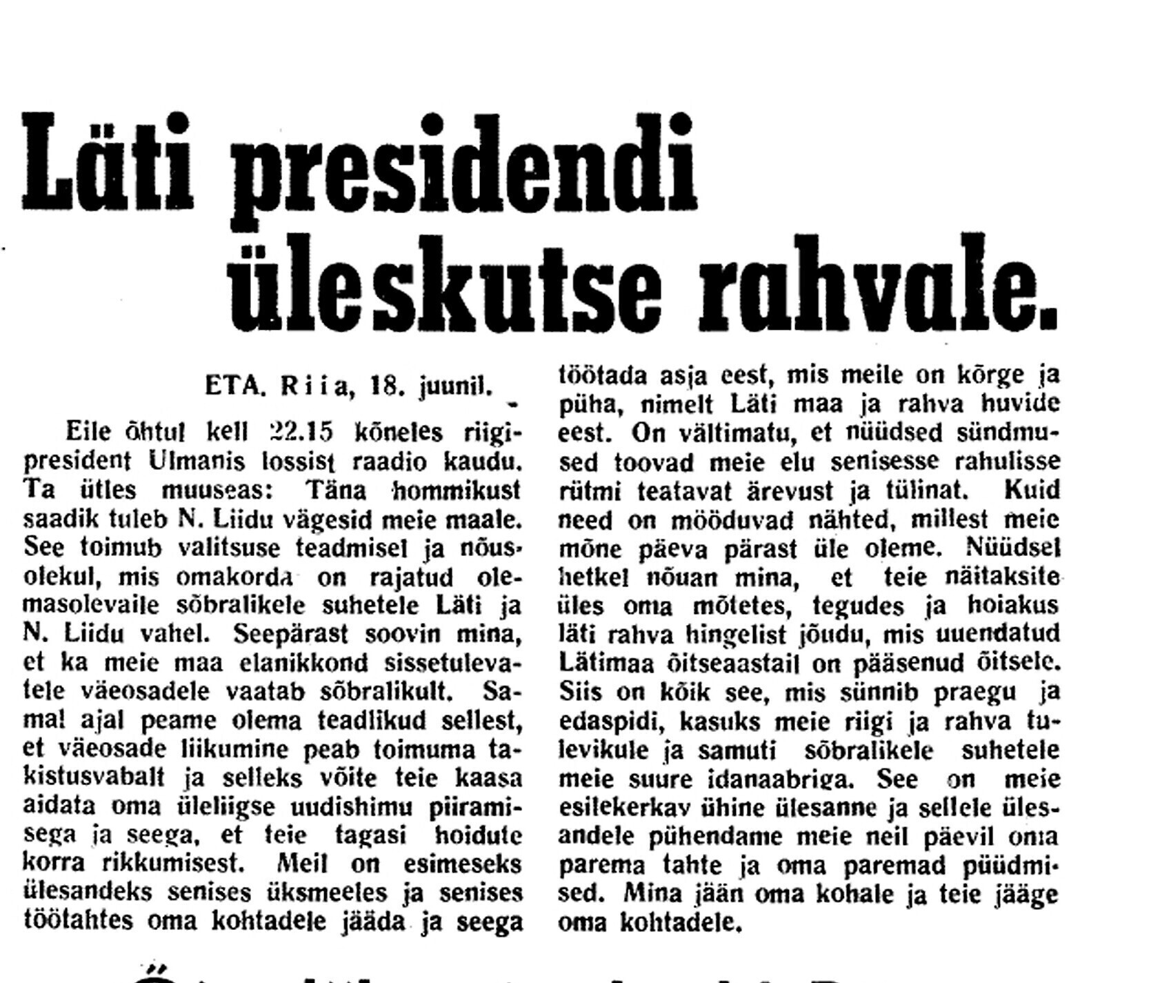President osutab parlamendi kokkukutsumise mõtet, mis aga kahjuks maha laidetakse ([välisminister Ants] Piip, Jürima). Laidoner arvab, et Šdanov [Ždanov], kes uue Valitsuse kujundamise asjus Eestis viibib, otsib miitingult tuge võimalikkude loosungite näol, et nõuda rohkem punast värvi kujundavasse valitsusse.