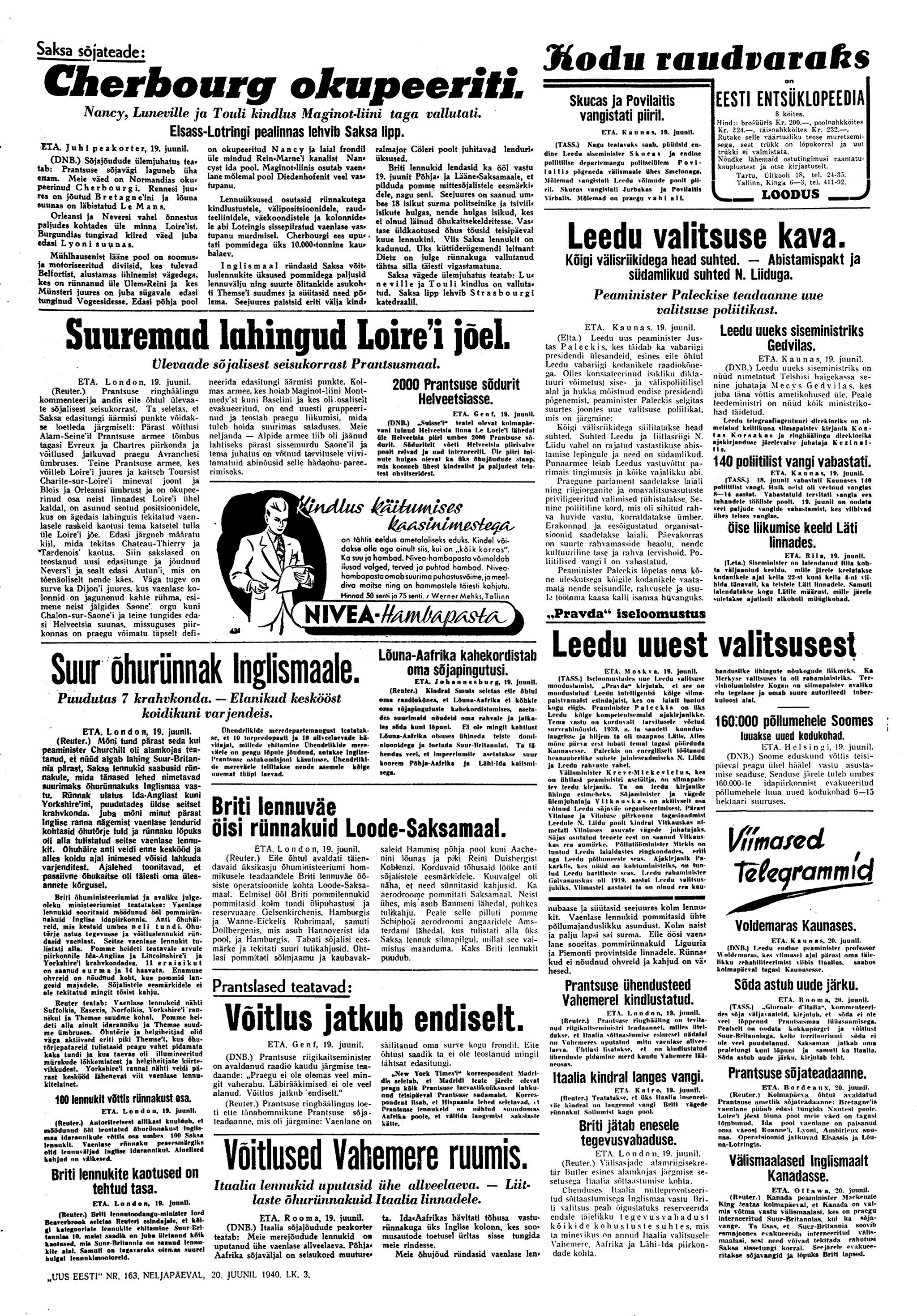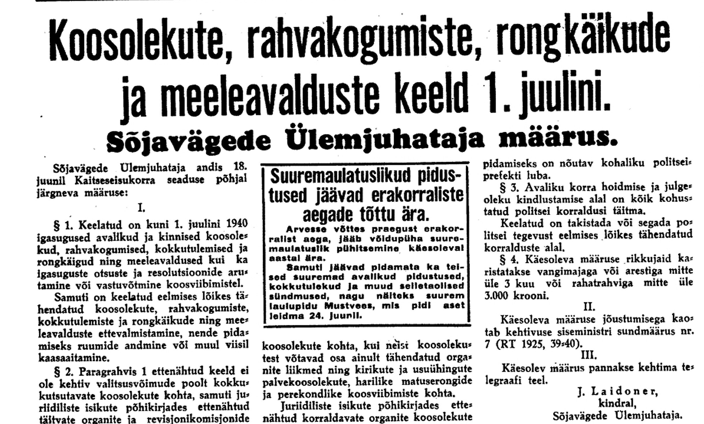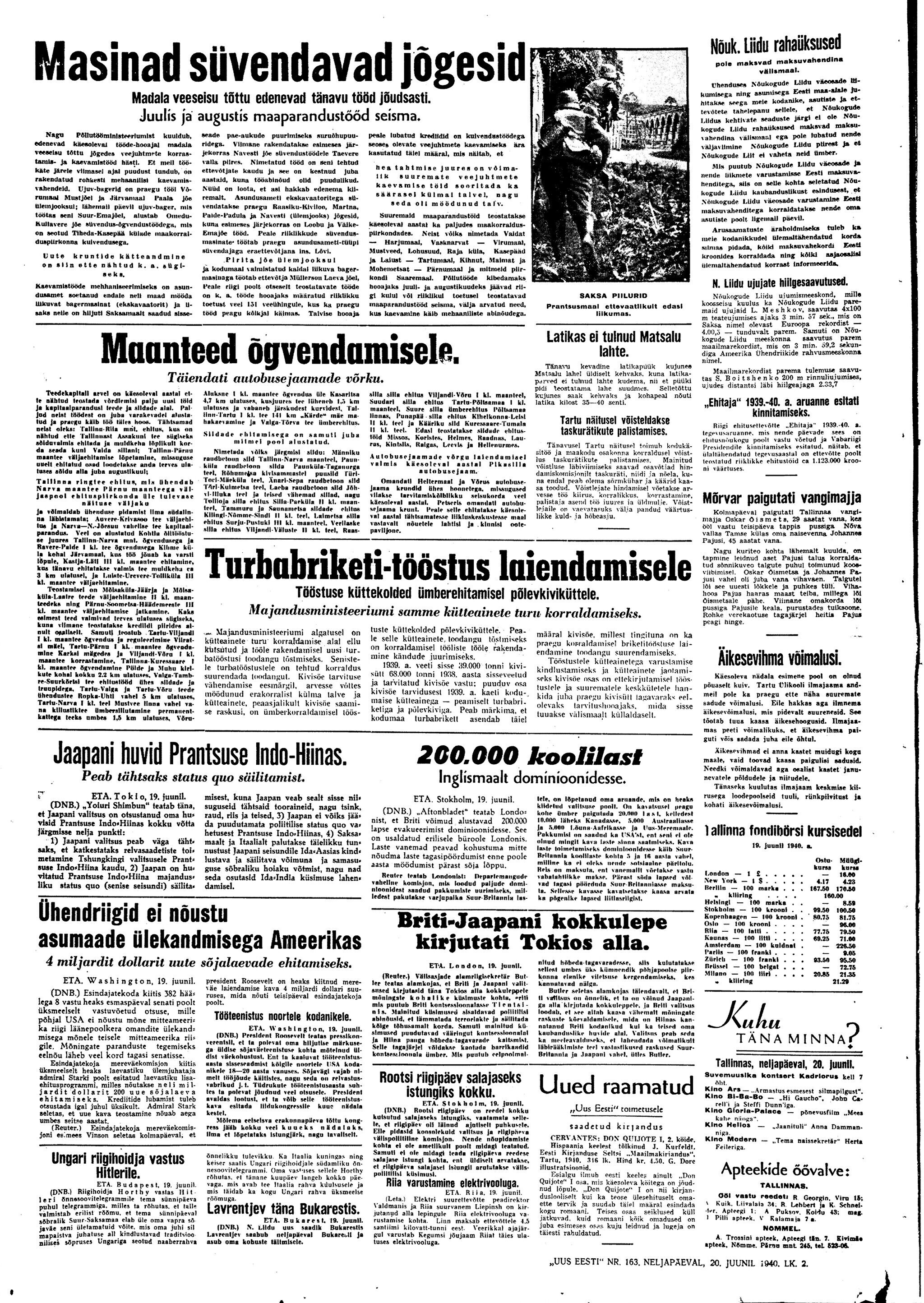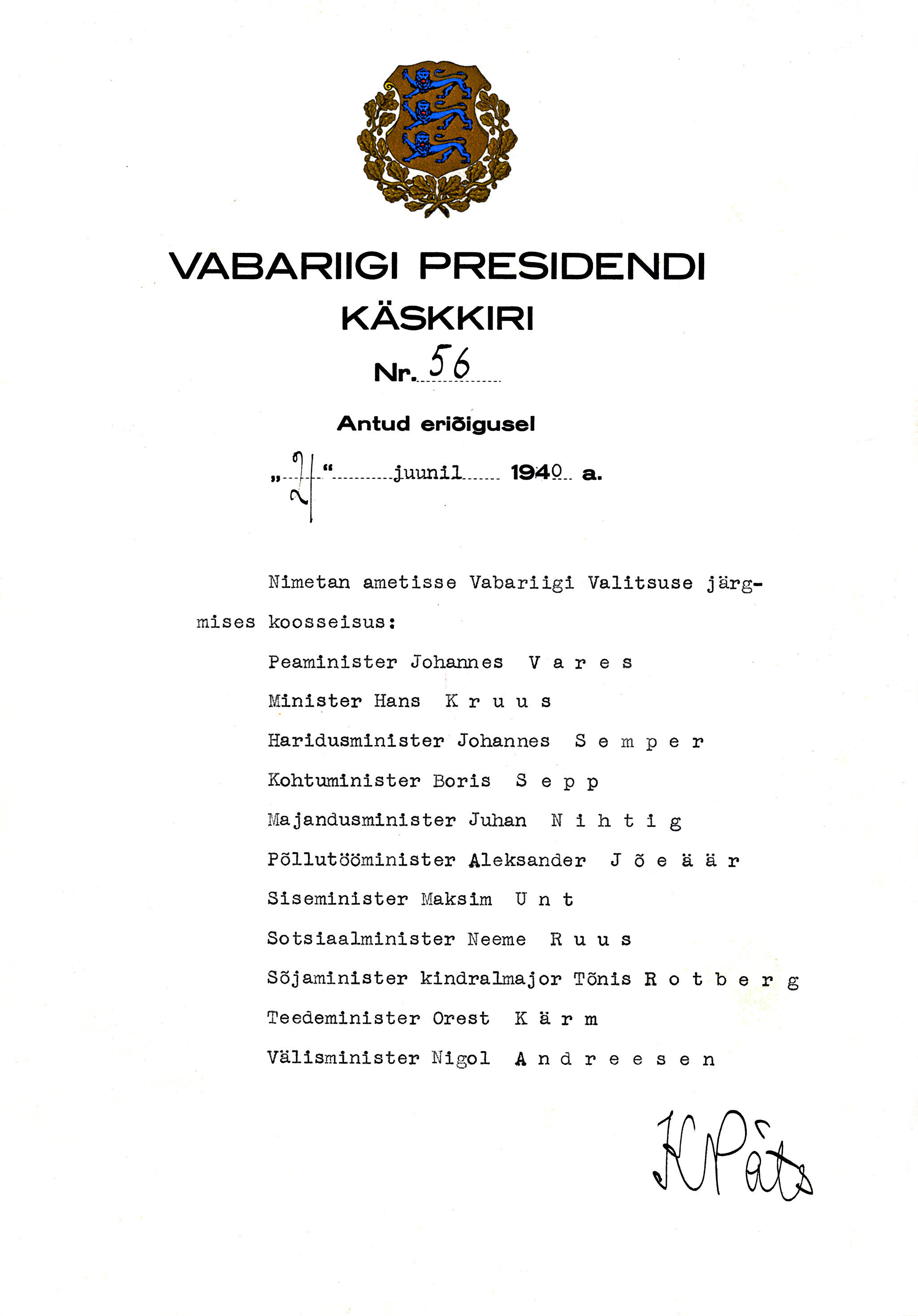 President osutab parlamendi kokkukutsumise mõtet, mis aga kahjuks maha laidetakse ([välisminister Ants] Piip, Jürima). Laidoner arvab, et Šdanov [Ždanov], kes uue Valitsuse kujundamise asjus Eestis viibib, otsib miitingult tuge võimalikkude loosungite näol, et nõuda rohkem punast värvi kujundavasse valitsusse.