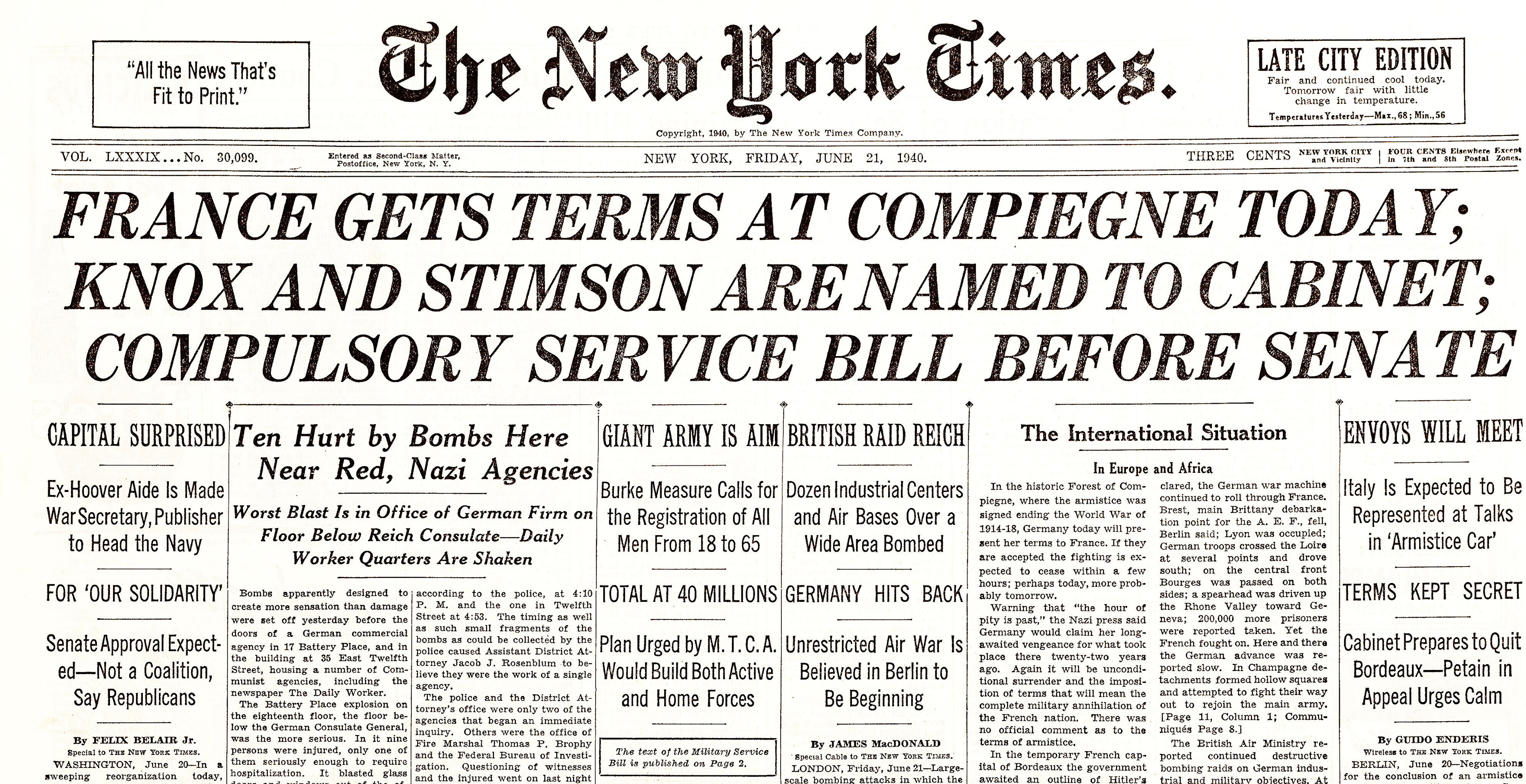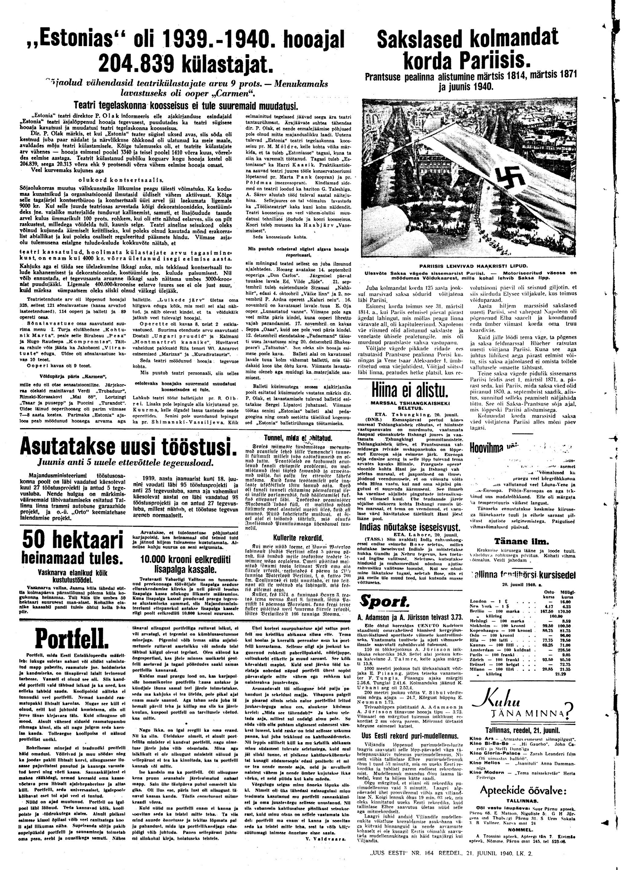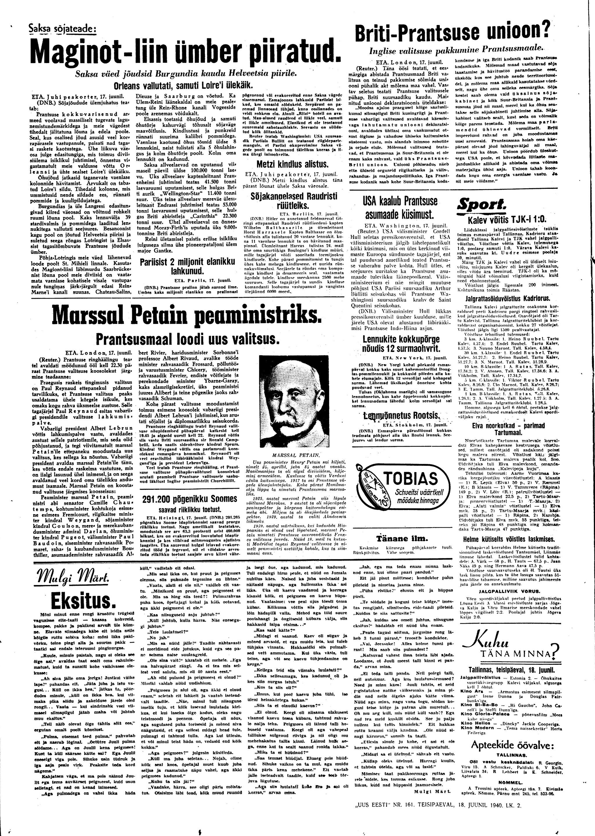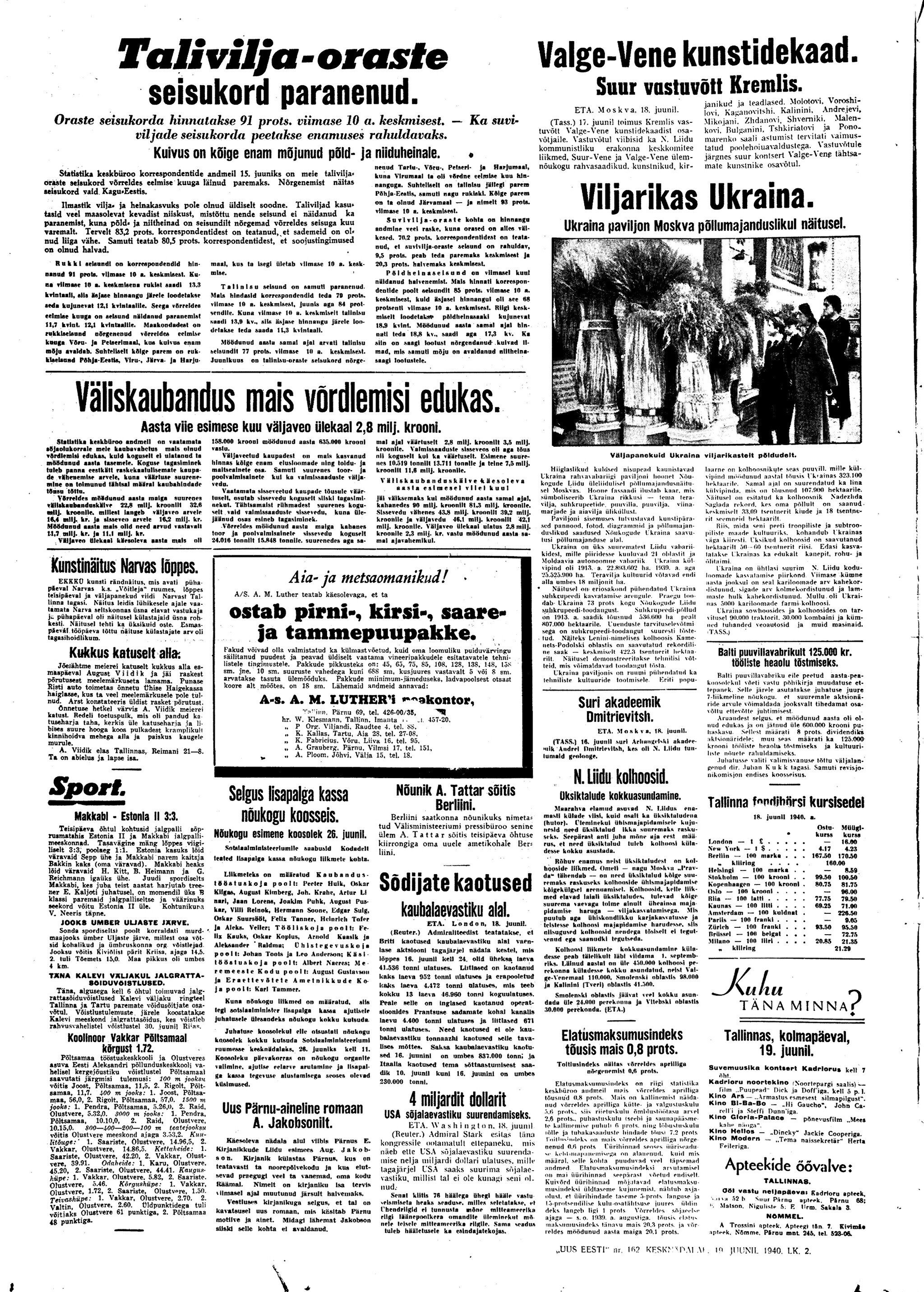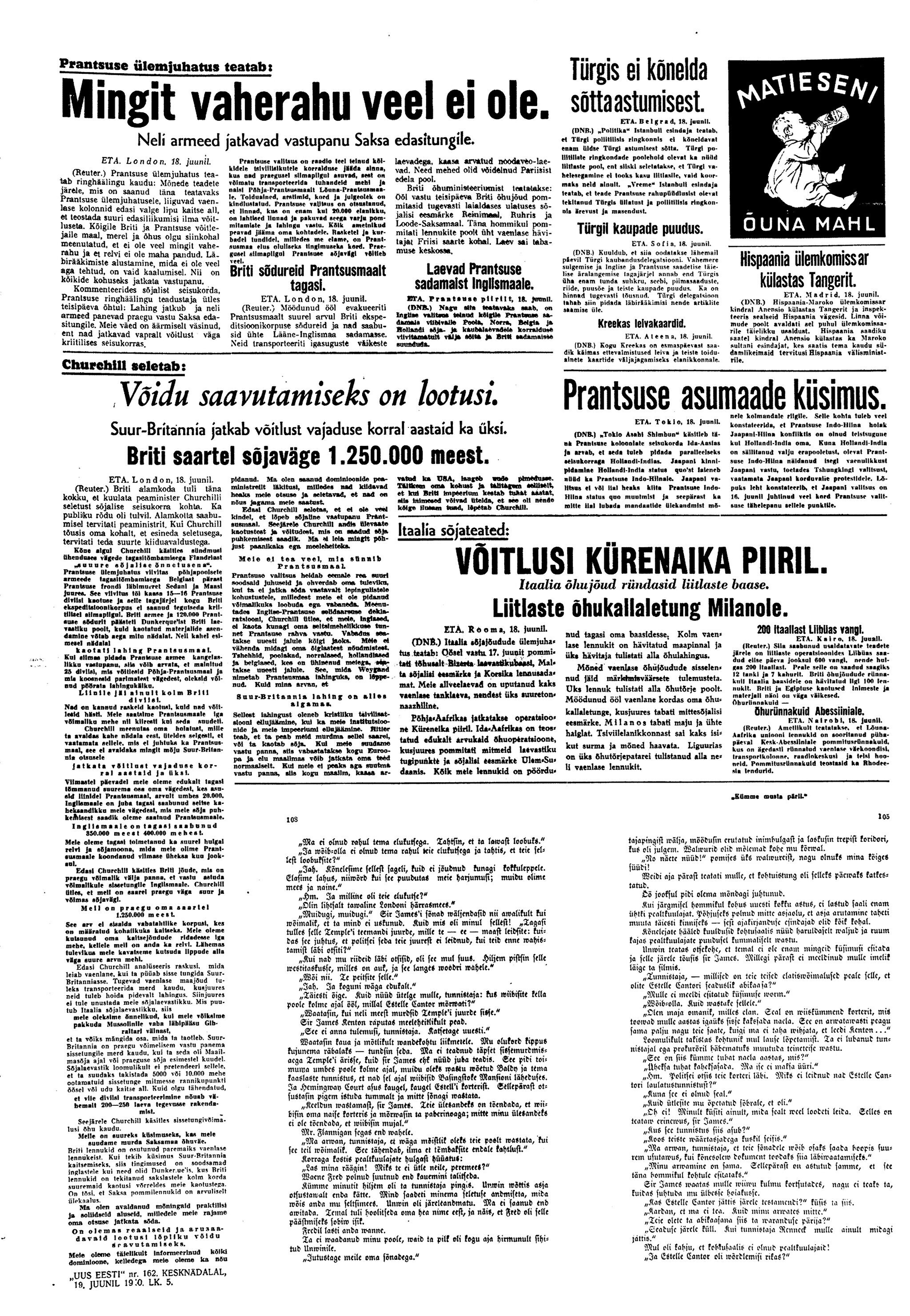 President osutab parlamendi kokkukutsumise mõtet, mis aga kahjuks maha laidetakse ([välisminister Ants] Piip, Jürima). Laidoner arvab, et Šdanov [Ždanov], kes uue Valitsuse kujundamise asjus Eestis viibib, otsib miitingult tuge võimalikkude loosungite näol, et nõuda rohkem punast värvi kujundavasse valitsusse.