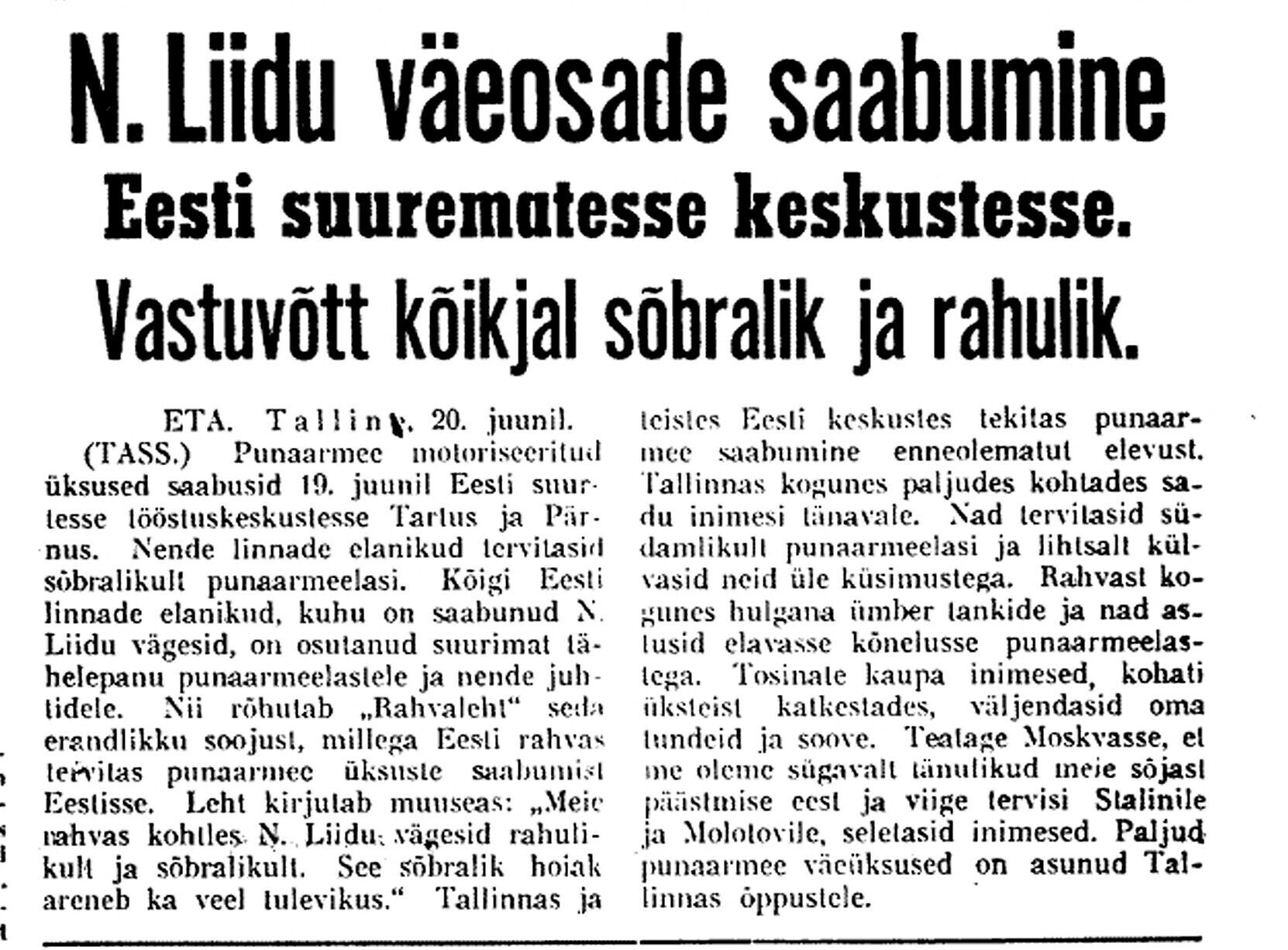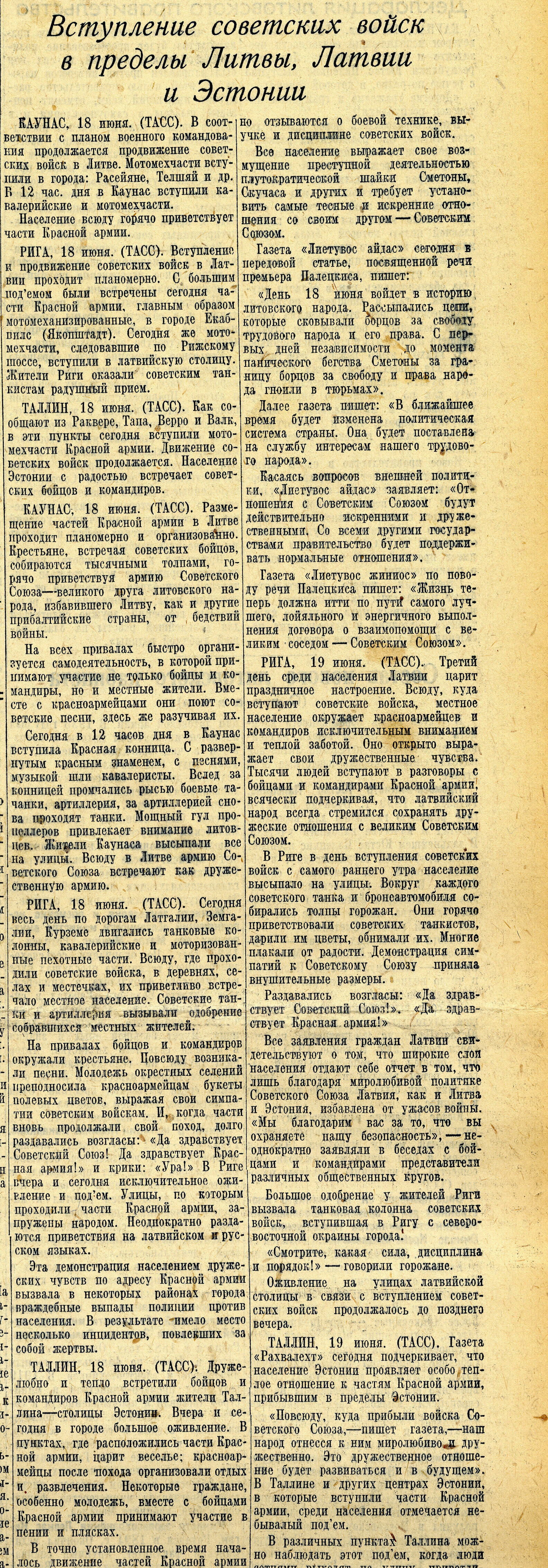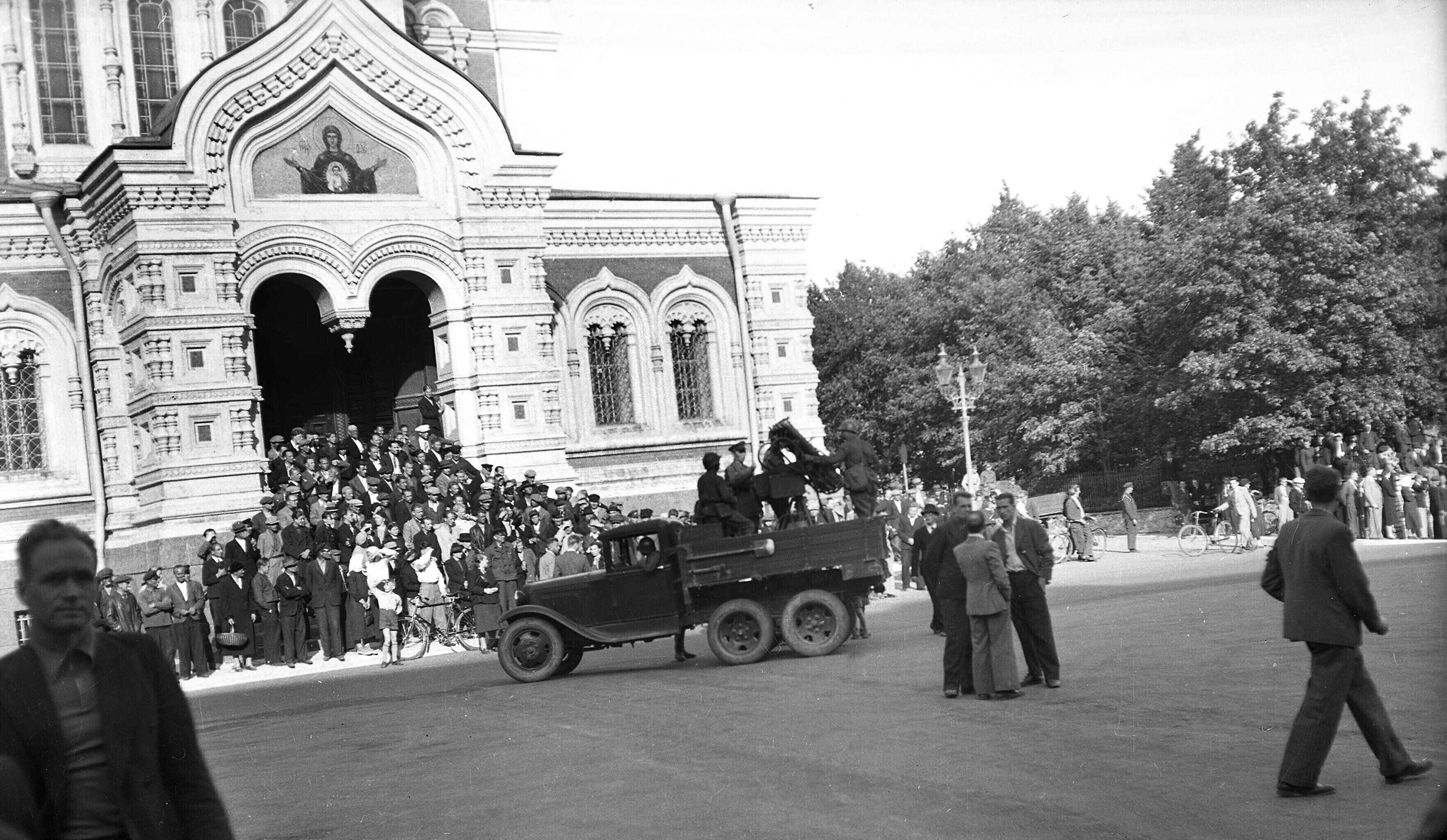 Meie nähes aga lütseumi sisse ei pääseda. Pärnu maanteed kodu liikudes sõidab sealt läbi Vene veoautosid, täis relvastatud Vene sõdureid, kes laulu löövad. Osal autodest on ka püssidega tsiviilelanikke. Rahvas, kes seisatama jäävad, on kurb, naised enamasti nutavad, ka lihtrõivaisse riietatud naised.
