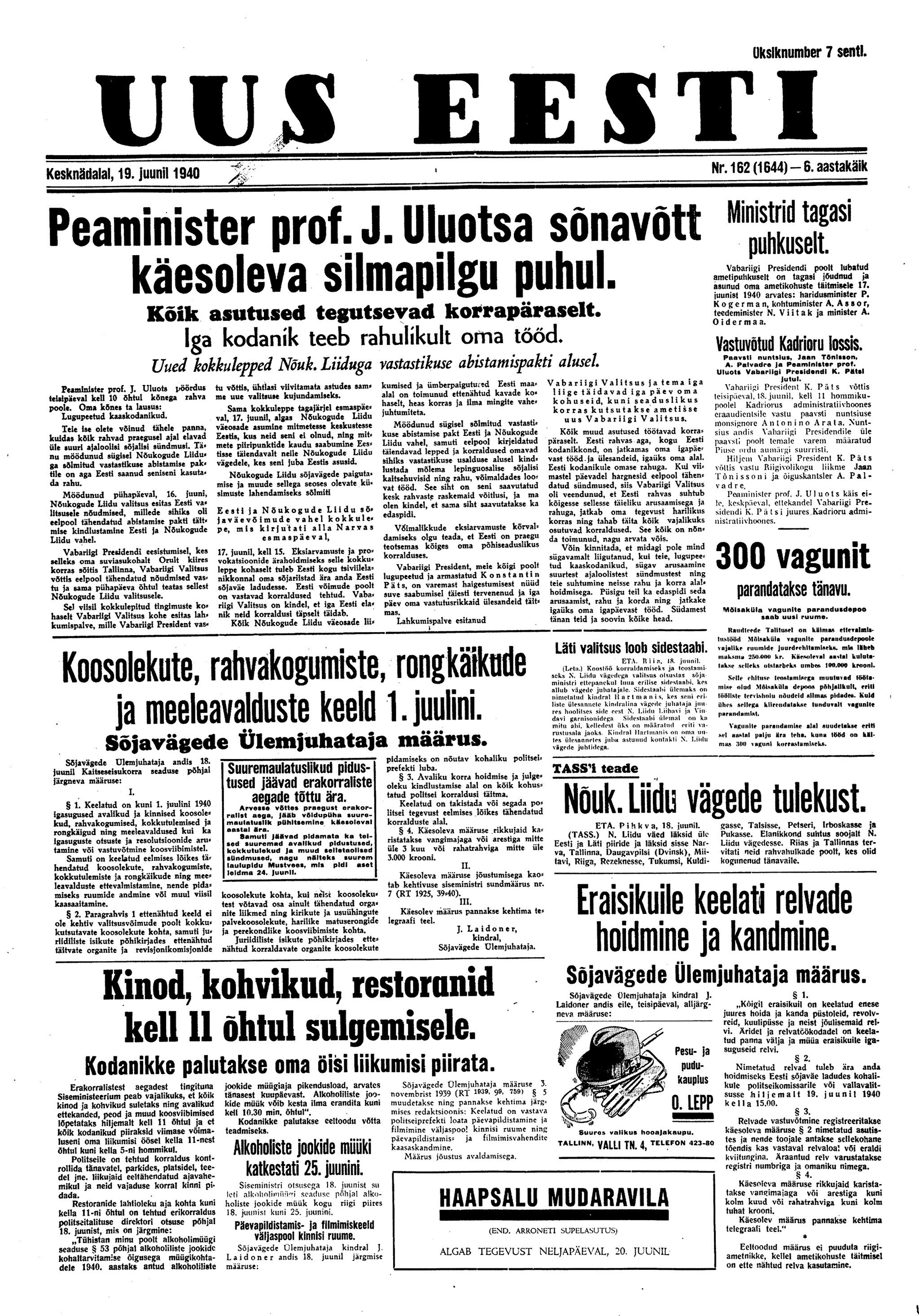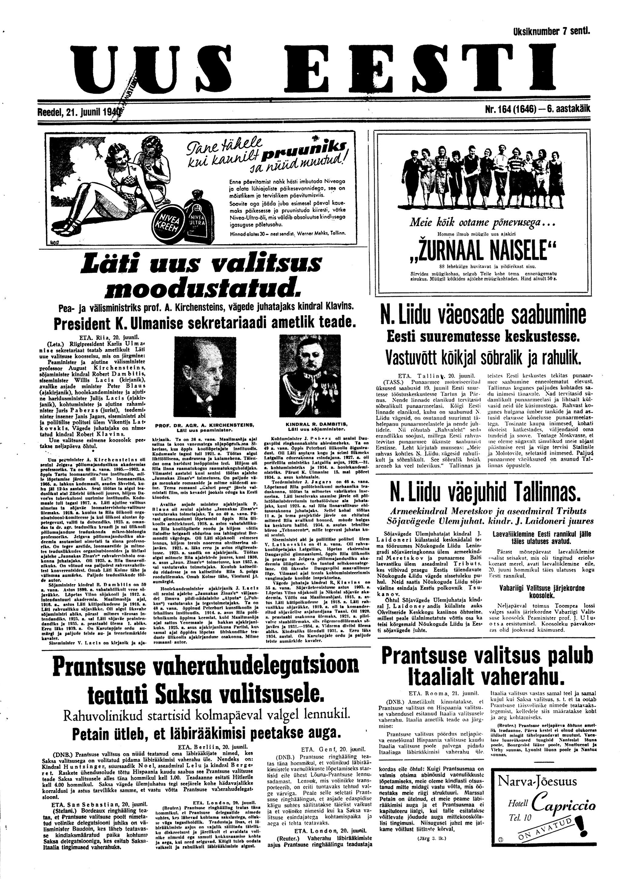 21. juunil korraldati Tallinnas "valitsuse vahetamiseks" miiting ja demonstratsioon, demonstrantide kolonne saatsid Punaarmee soomusmasinad. Toompea rõdult karjuti maha peaminister Uluots ja Kadriorus ei lastud rääkida president Pätsil. Demonstrandid vabastasid Tallinna Keskvanglast nn poliitvange, võtsid üle politseijaoskondi, Riigi Ringhäälingu ja ajalehe Uus Eesti toimetuse.