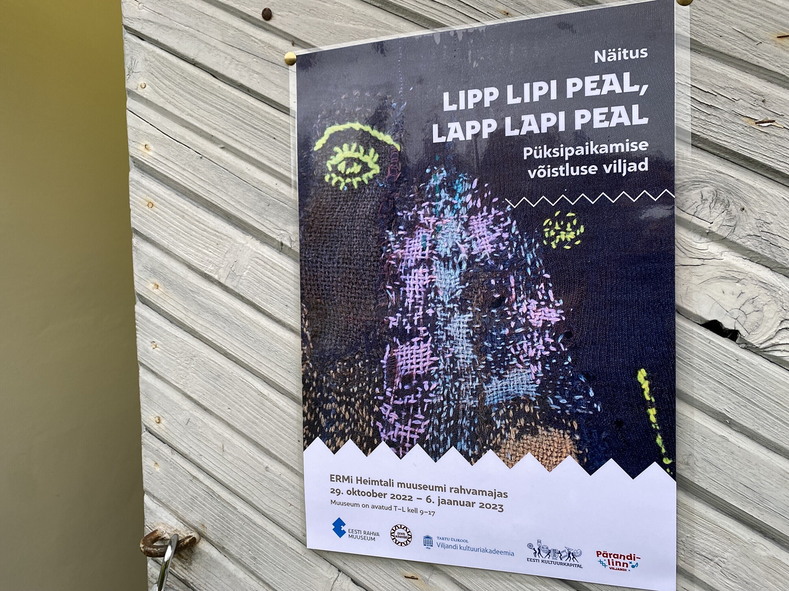 "Lipp lipi peal, lapp lapi peal" on Viljandimaal Heimtali vanas rahvamajas avatud näitus nüüdisrahvarõivaks saanud teksapükste paikamise võimalustest. Selle asemel et kulunud teksapaar minema visata, võib need isikupäraselt korda teha ja saata uuele kasutusringile.