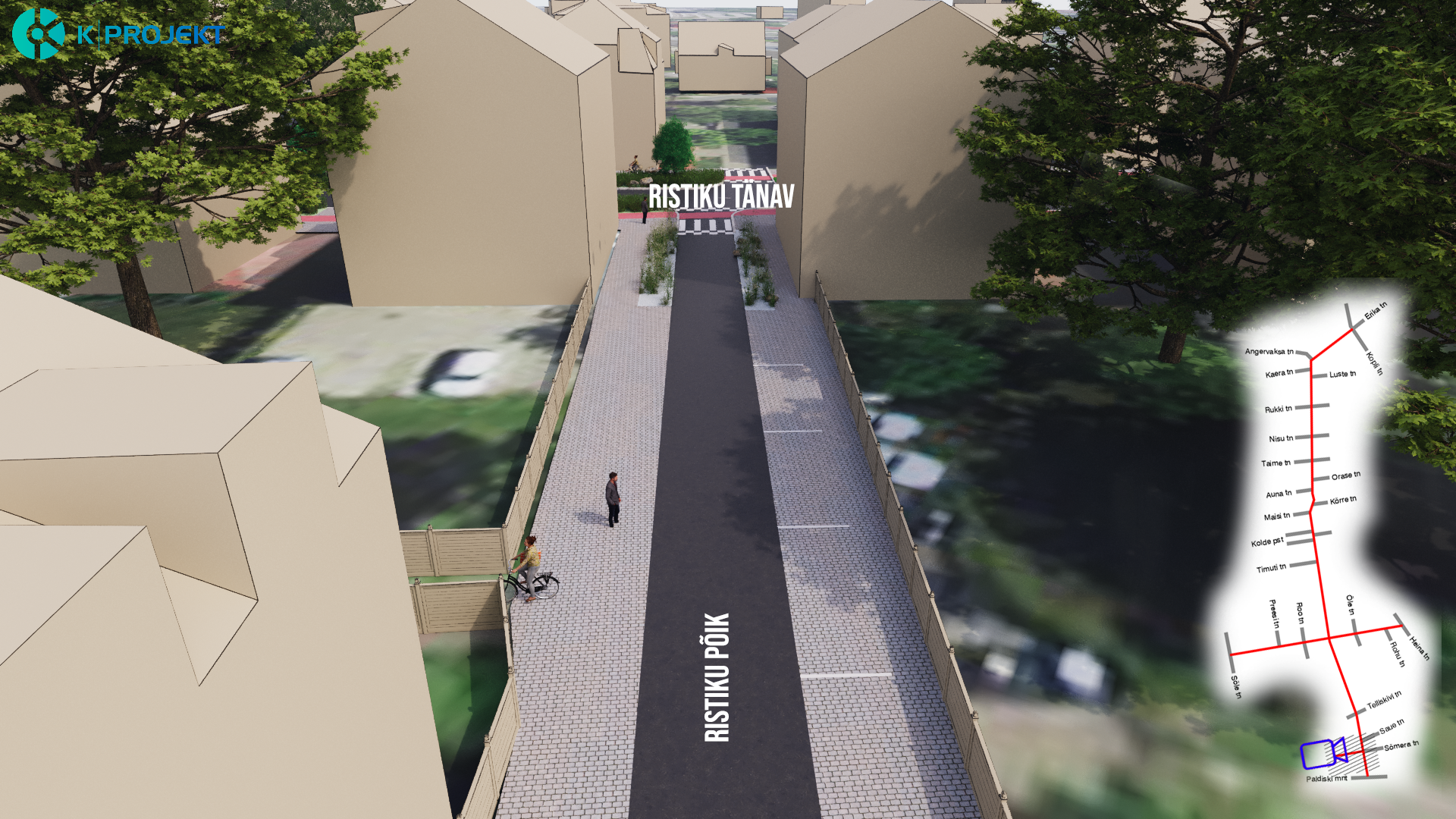 Ristiku tänava kõnniteed on kavandatud kahe ja kolme meetri laiused, kitsamates ja erinevate takistustega kohtades on laius ka alla kahe meetri. Ristiku tänavale on ette nähtud ühesuunalised rattateed mõlemale poole teed. Ühesuunalise jalgrattatee laius on 1,75, kitsamates kohtades on laius 1,5 meetrit. Rattatee, kõnnitee ja sõidutee on teineteisest kõrguslikult eraldatud.