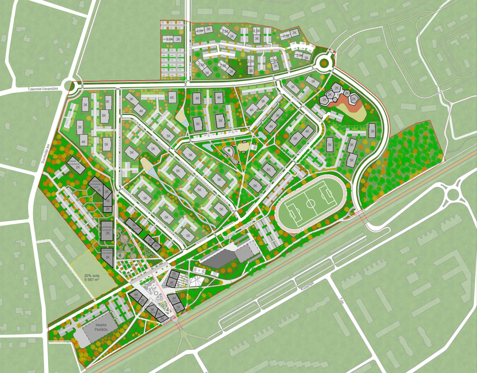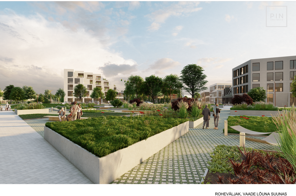 Uude rajooni rajatakse keskväljak koos kultuurimaja, tervisekeskuse, büroohoonete ja äridega. Avalikud ja ärihooned on kavandatud paralleelselt raudteega, kus asuvad kauplus ja kool. Lasteaed on viidud planeeringuala keskele. Lisaks keskväljakule rajatakse roheväljak.