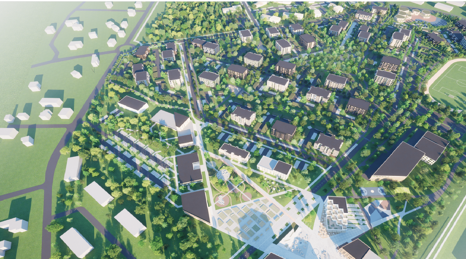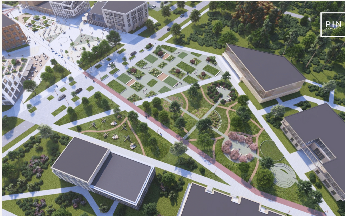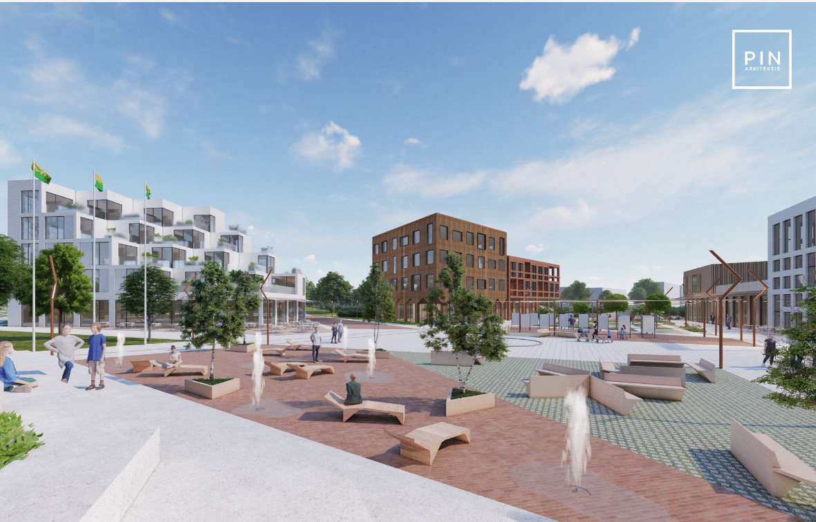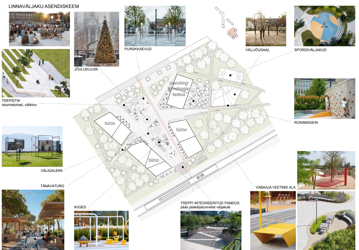 Raudtee pool asuvat linnaväljaku serva ääristavad esimese korruse äripindadega ja kohvikutega büroohooned, kohalikele elanikele mõeldud koostöötamisruumidega töö- ja tehnoloogiakeskus. Põhjapoolse roheväljaku ümber paiknevad kultuurihoone/kinomaja, huvikoolidega noortekeskus, tervisekeskus ja ujula ning kaks üürikorterite hoonet, selgub võidutööst. Kõrgeimad, viiekorruselised hooned asuvad planeeringu järgi keskusel lähedal. Alale on planeeritud ka kergliiklusteed.