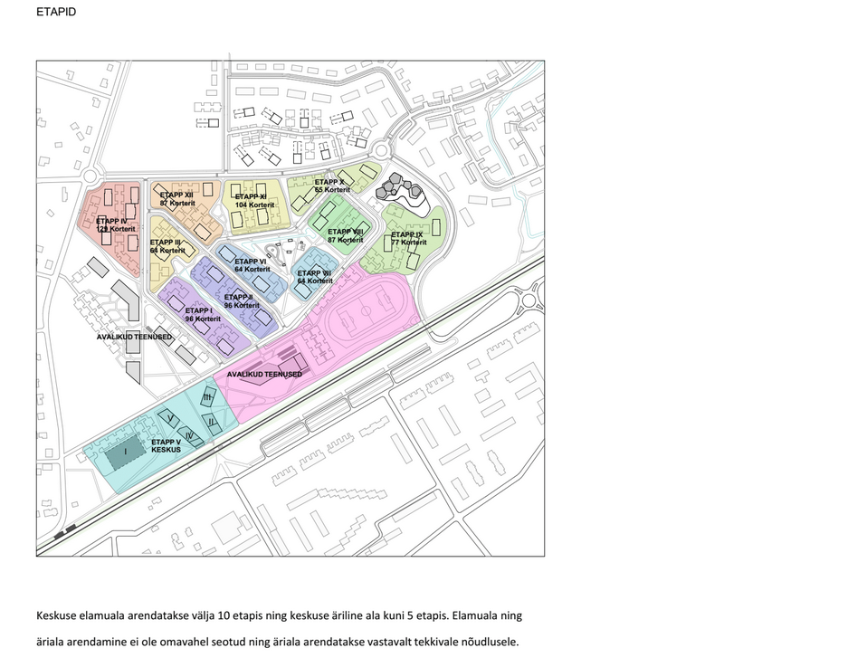 Planeeringu järgi rajatakse uus keskusala kümnes etapis. Esimene etapp saab olema raudteeäärne keskusala ja 96 korteri ehitus.