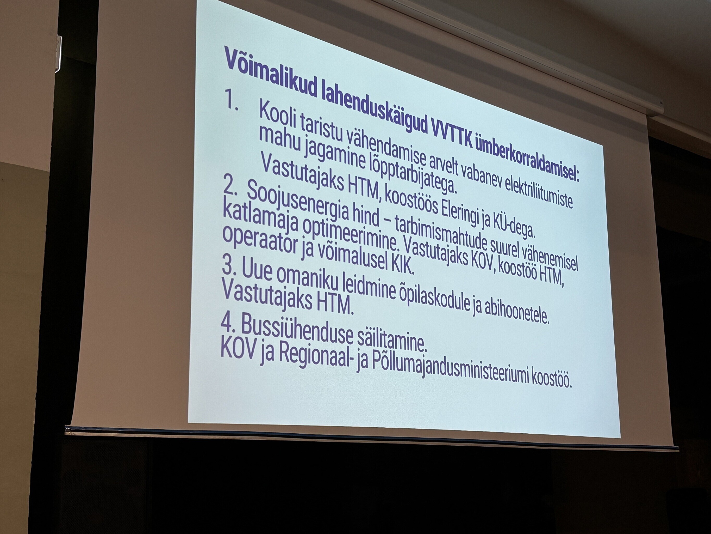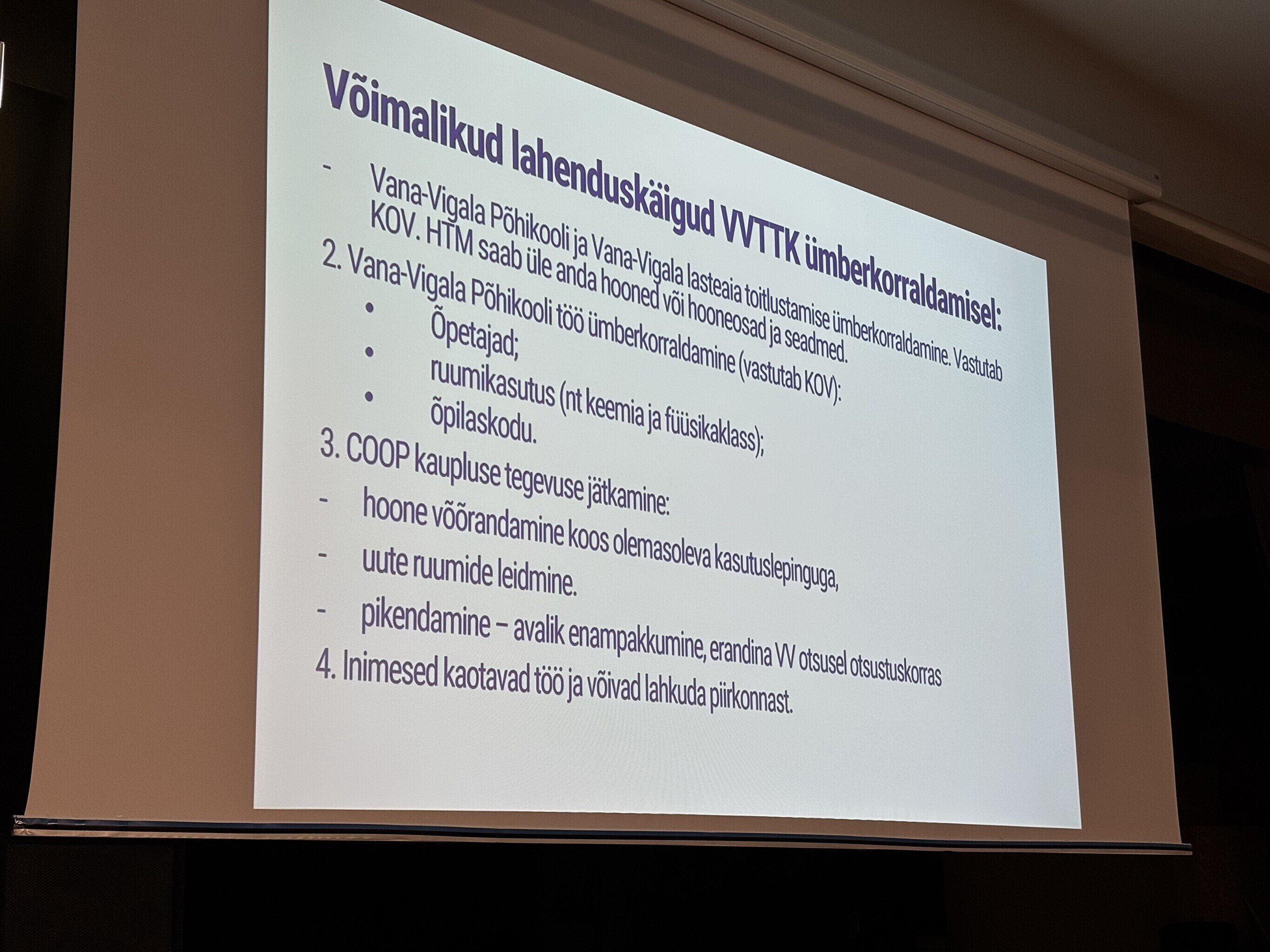 Kui haridusministeeriumi kutseharidusvaldkonna juht Triin Laasi-Õige rääkis hommikul peamiselt Vana-Vigala kutsekooli tegevuse täielikust lõpetamisest, amortiseerunud peahoone lammutamisest ja õpilaskodu müümisest, siis õhtuks ta leebus ja pakkus välja, et on teisigi võimalusi.