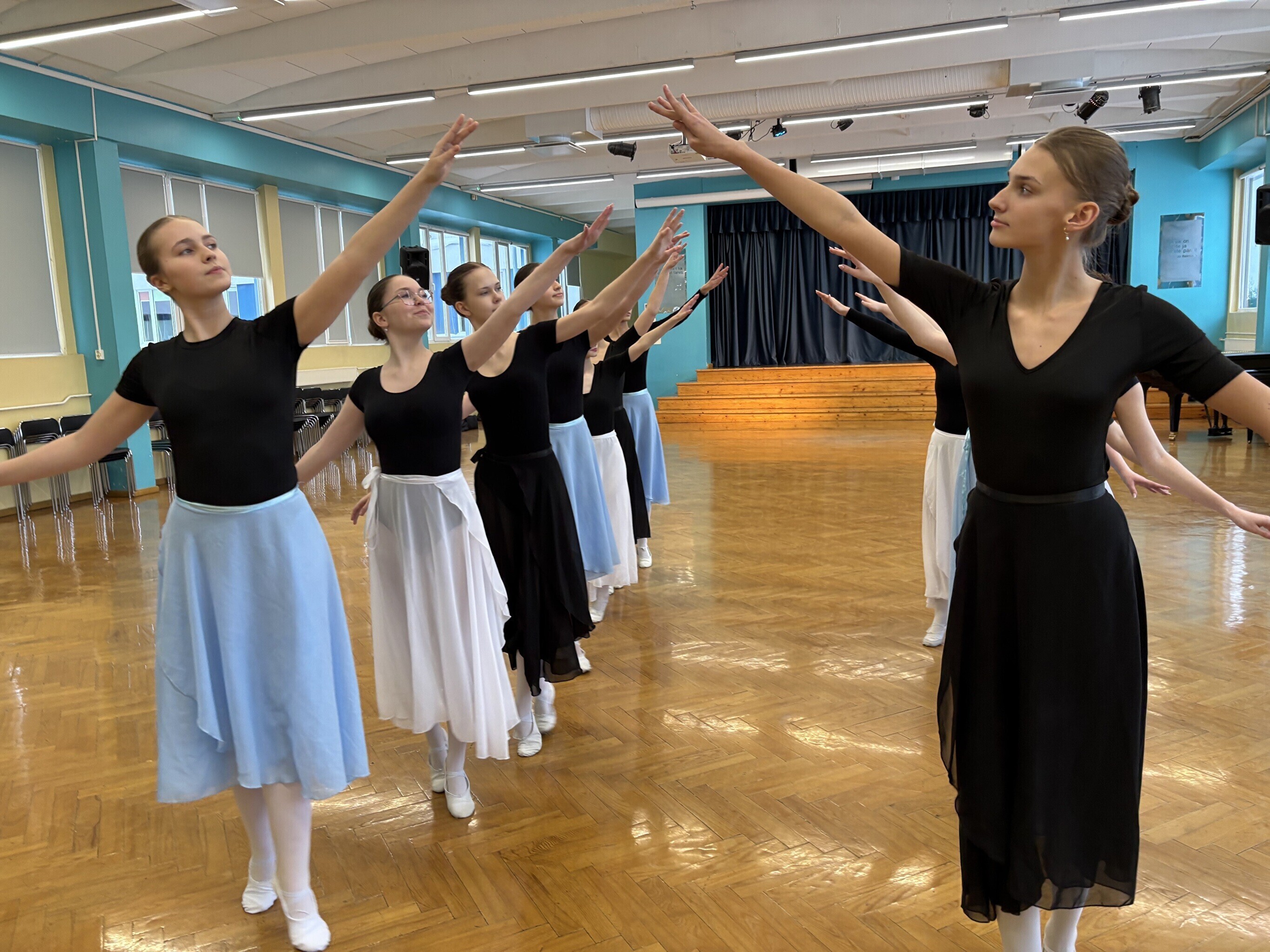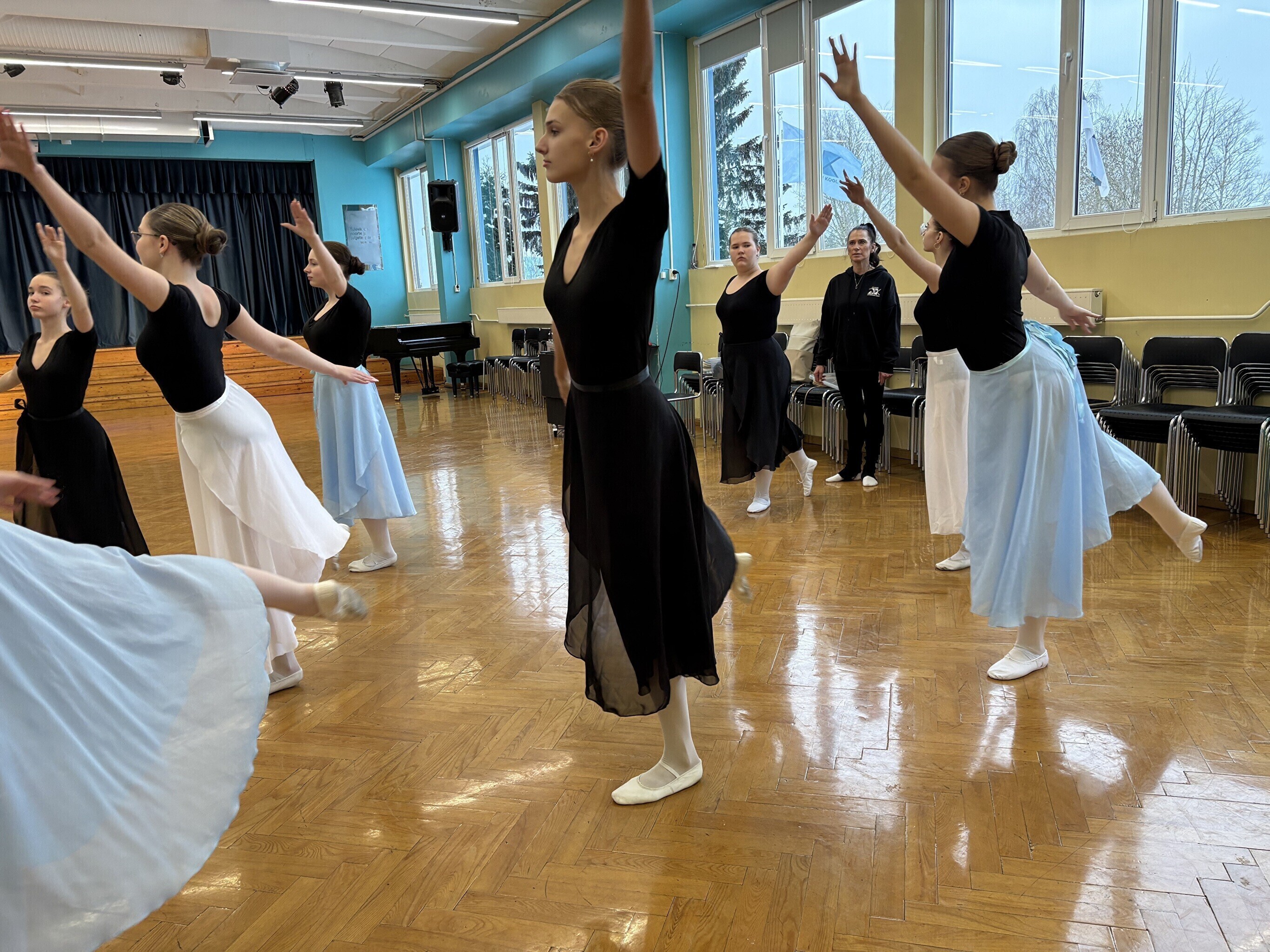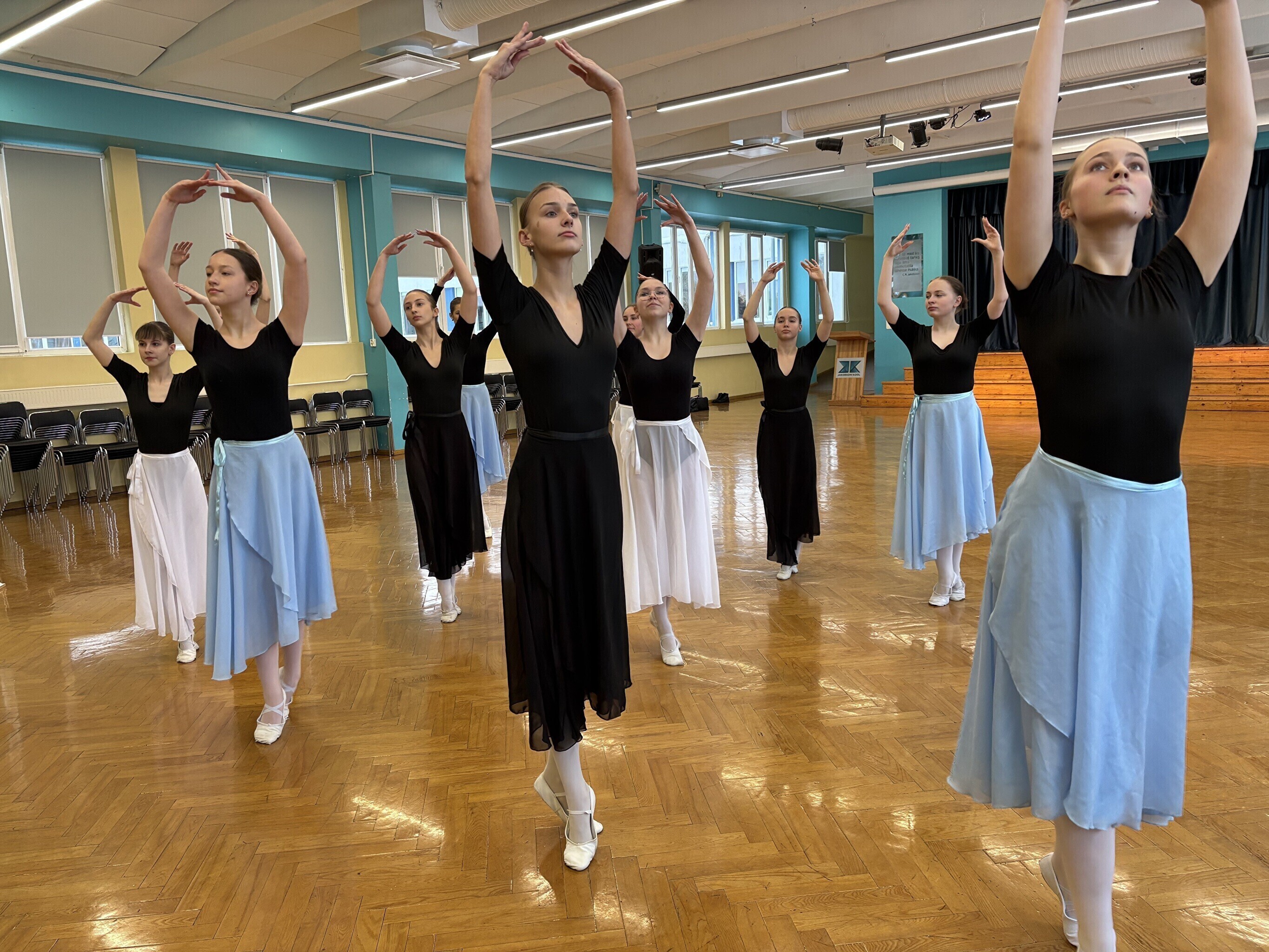 Jakobsoni kooli balletistuudios, kus täna harjutasid viienda ja kaheksanda klassi õpilased, lööb kaasa 120 noort. Kõige nooremad on kolme- kuni kuueaastased, vanemate rühm tegutseb hoopis Viljandi gümnaasiumi juures.