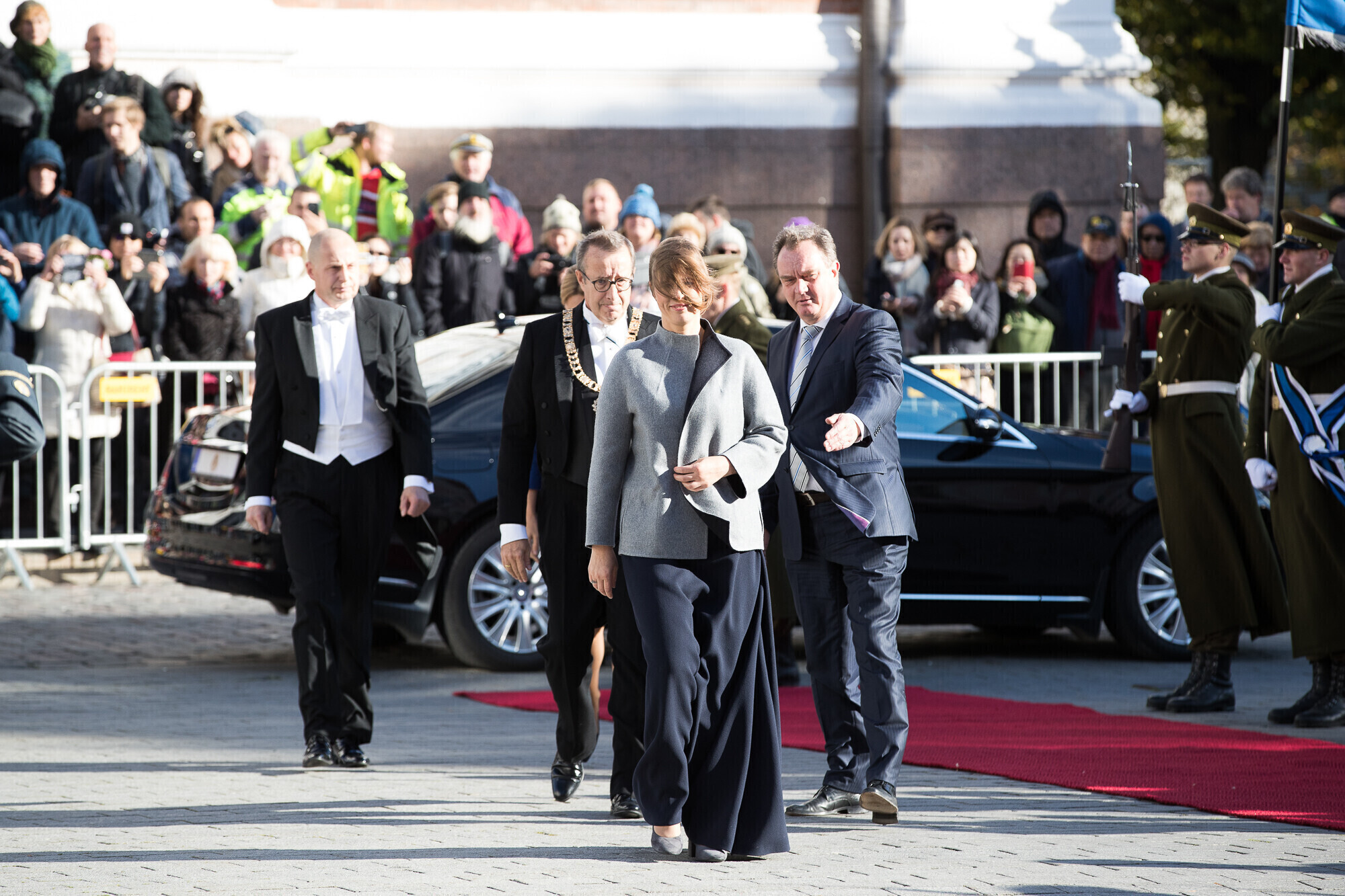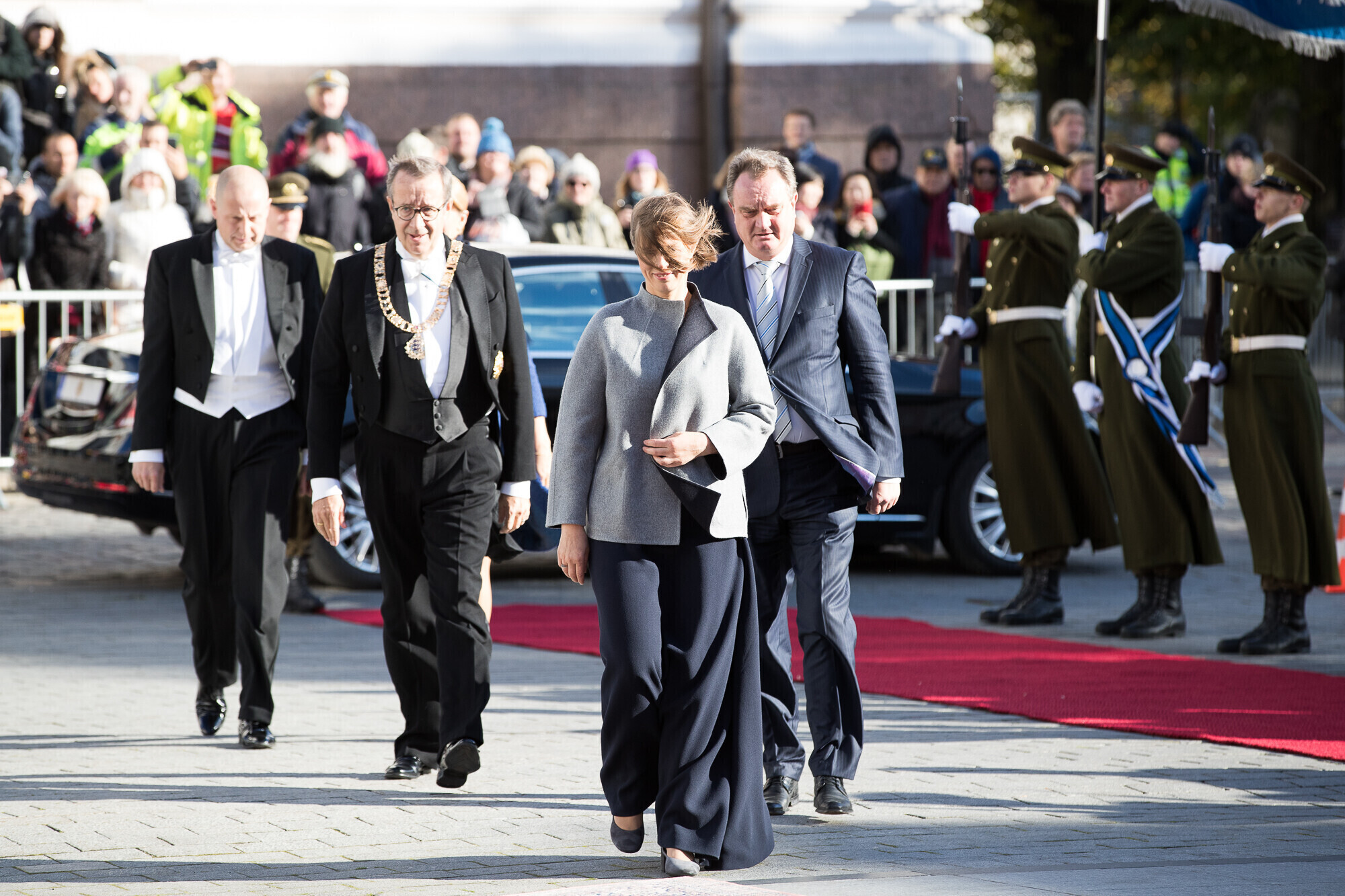 Kell 14.40 saabusid presidendid riigikogu hoone esisele platsile, kus presidente tervitasid Vahipataljoni aukompaniid.