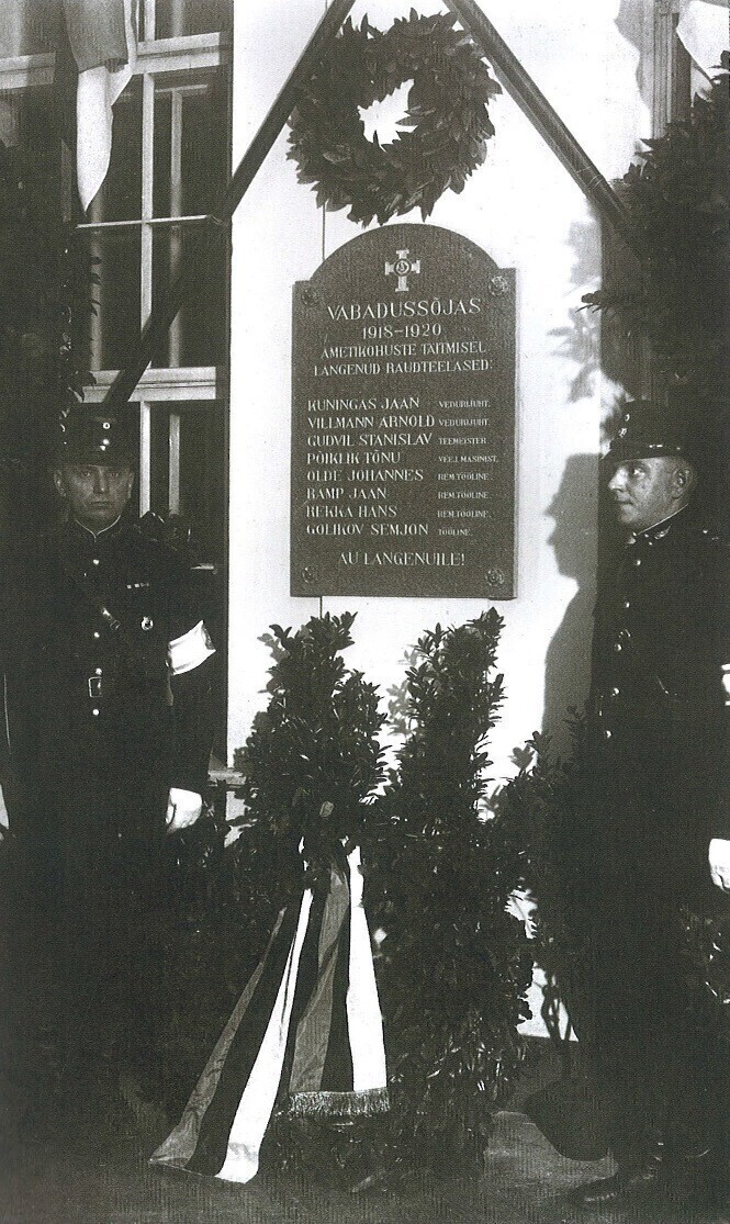 Mälestustahvli paigaldamist kavandasid raudteelased juba 1933. aasta lõpus. Tahvli Vabadussõjas langenud raudteelaste mälestuseks avas 17. novembril 1934. aastal Raudteelaste Kodus pidulikul aktusel kaitseväe ülemjuhataja kindral Johan Laidoner. Üritusest võttis osa ka teedeminister kolonel (hiljem kindralmajor) Otto Sternbeck.