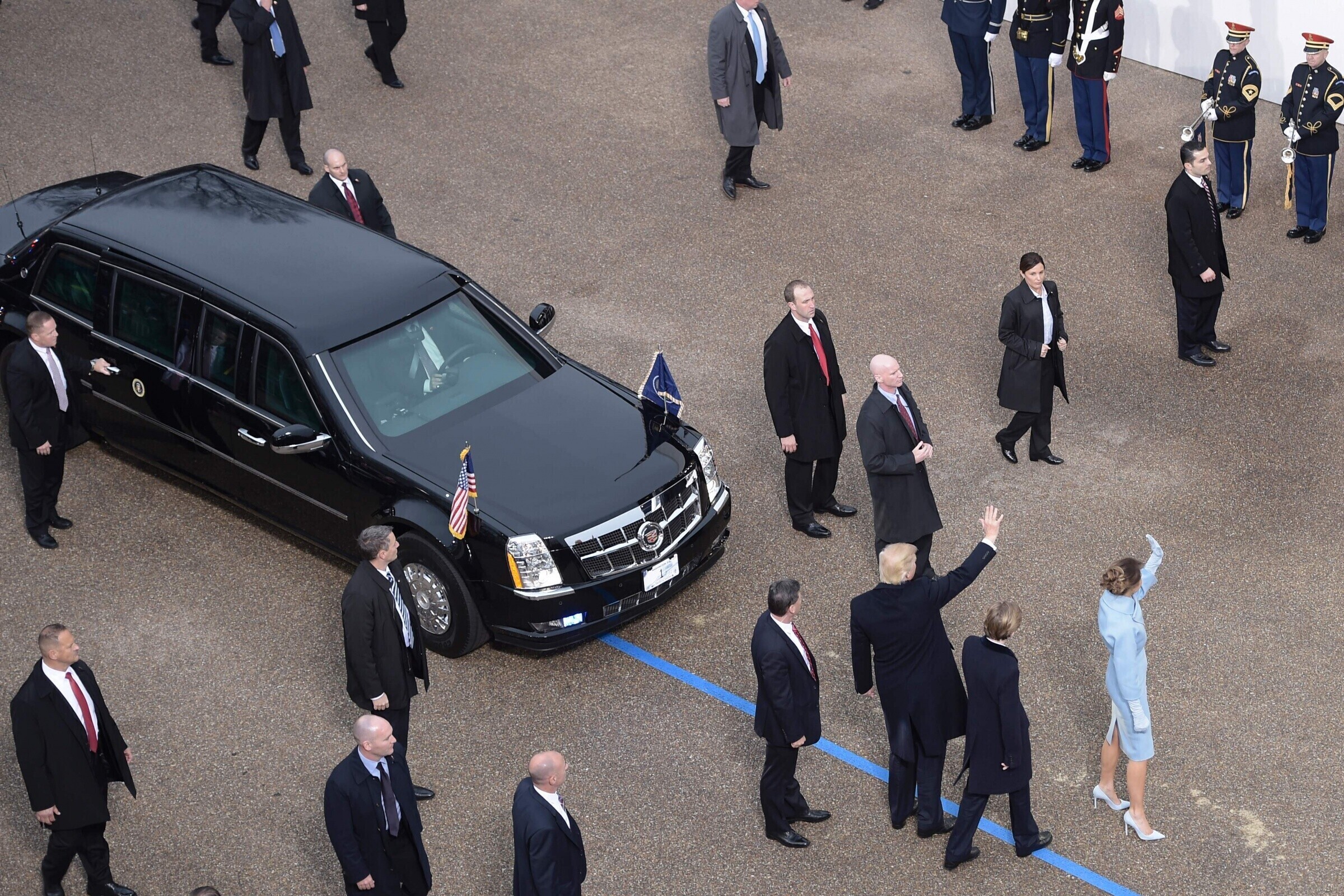 Trump liikus paraadil limusiiniga, mida turvas hulk Salateenistuse agente.