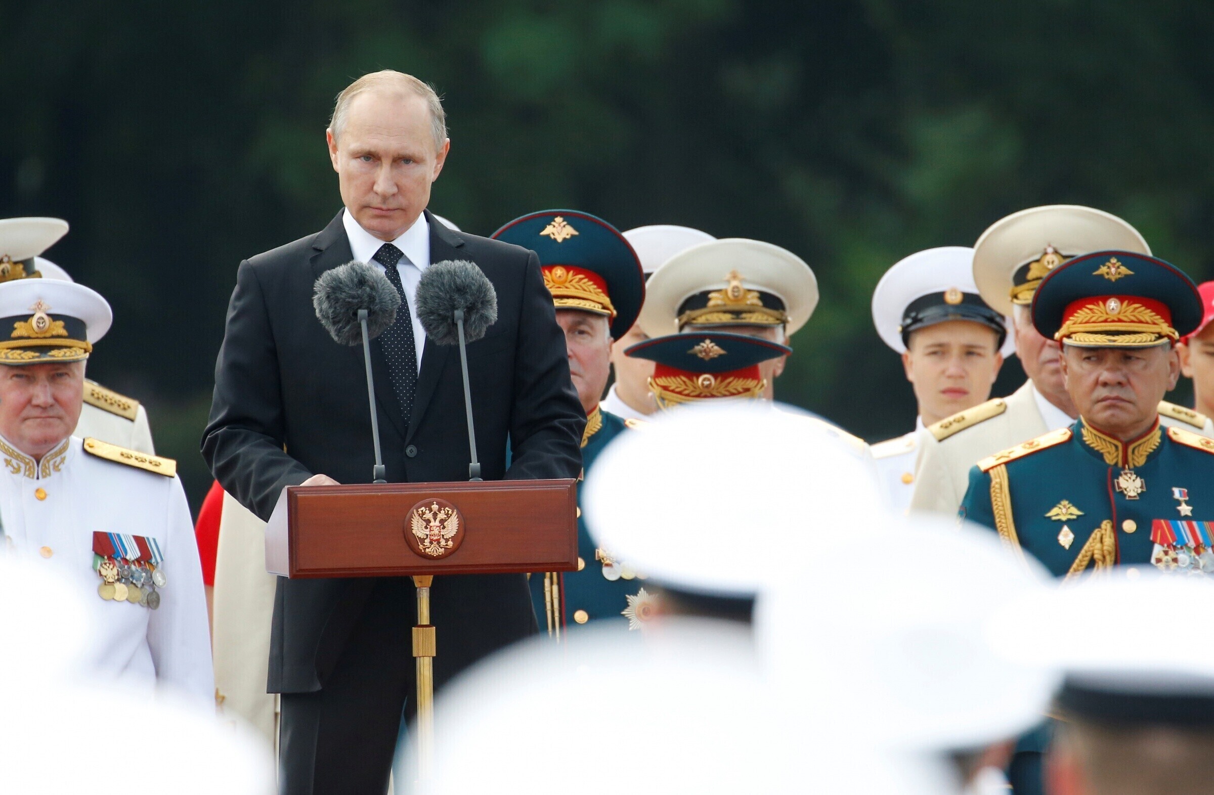 "Täna ei vii merevägi läbi üksnes oma tavapäraseid ülesandeid, vaid tuleb toime ka uute väljakutsetega. Ta on oluline osa võitluses terrorismi ja piraatluse vastu. Tänaste mereväelaste lapsed ja lapselapsed võivad nende üle uhked olla, ma olen selles kindel. Nende eeskujulikku ettevalmistust, tõhusust ja distsipliini kinnitavad nii õppused kui lahingoperatsioonid. Aitäh kõigile, kes teid kodus ootavad ja oma armastusega soojendavad," lausus Putin oma kõnes.