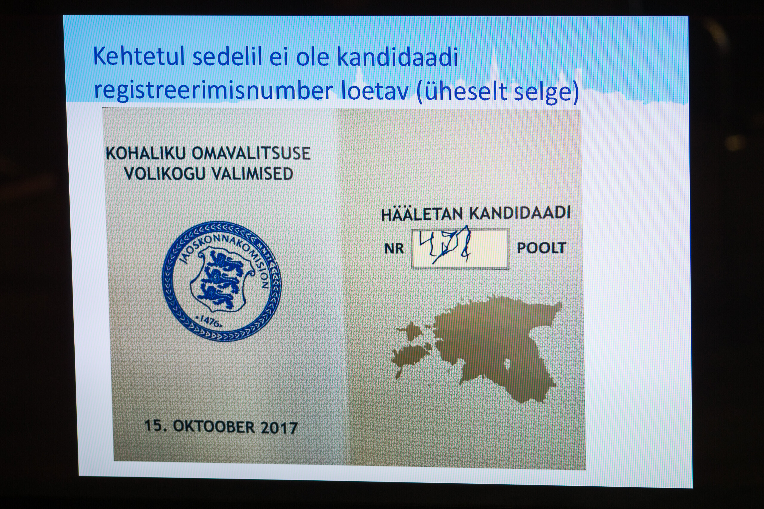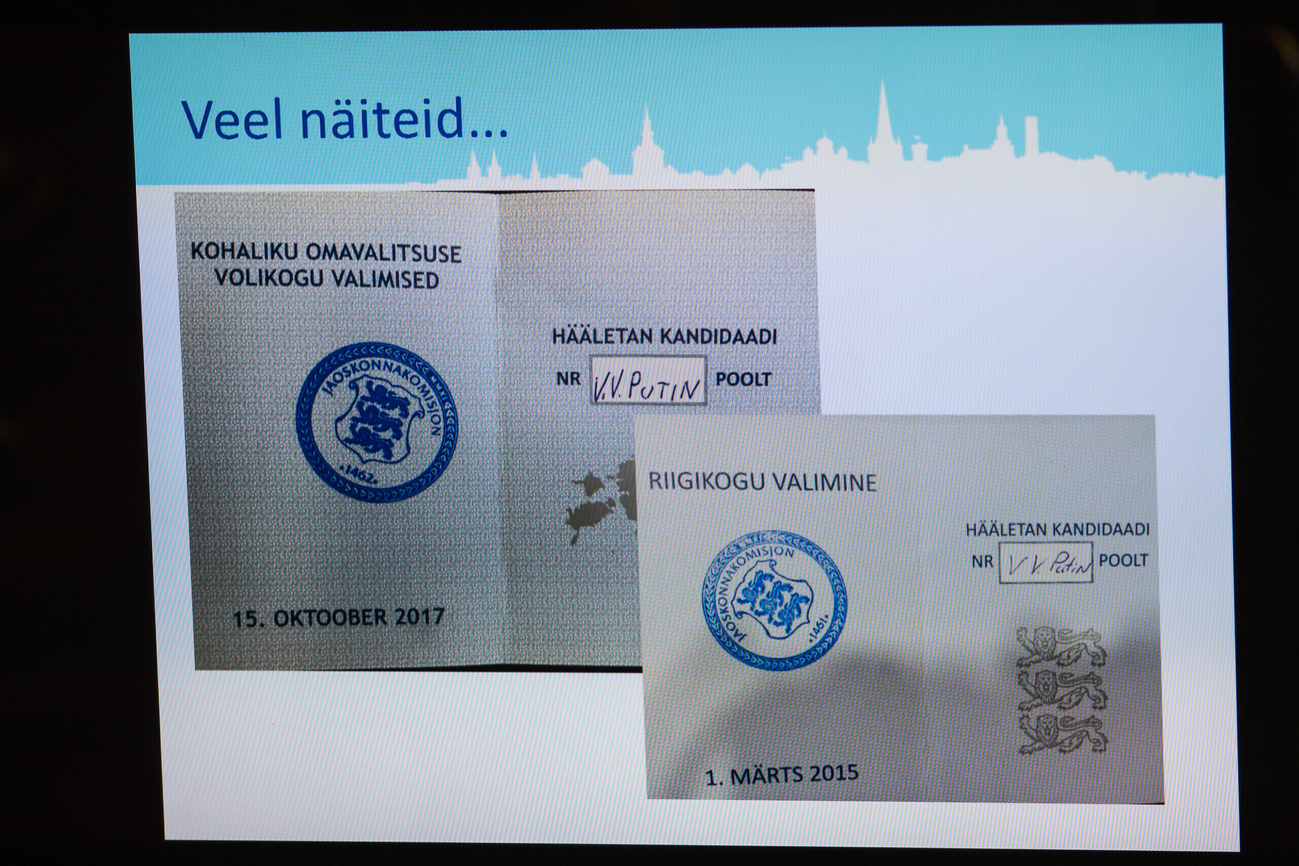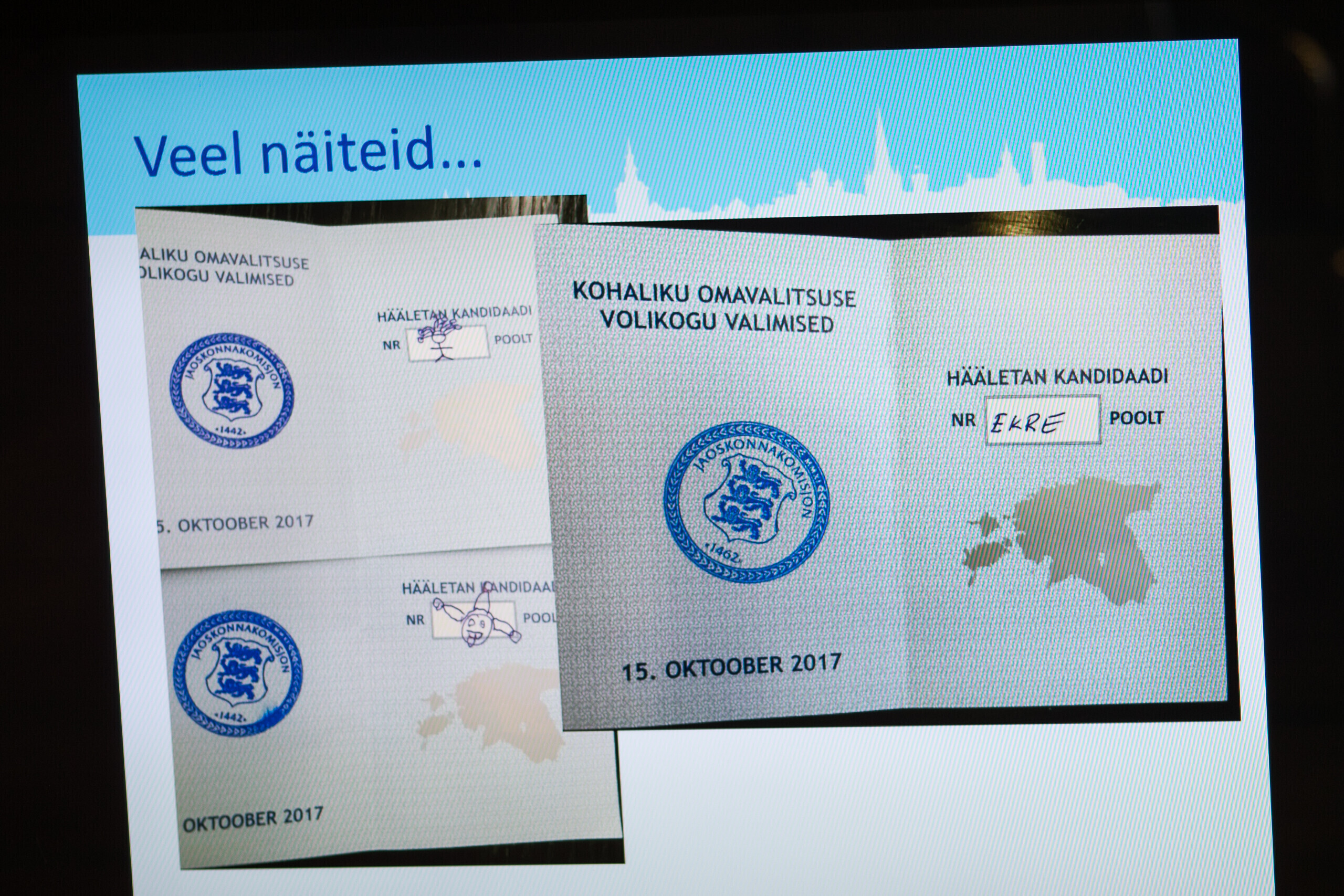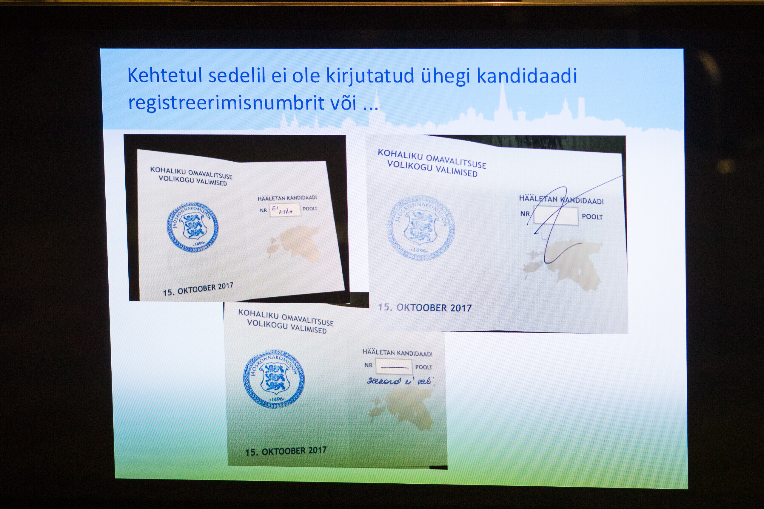 Tallinna valimiskomisjoni esimees Toomas Sepp näitas täna linnavalitsuse istungi järgsel pressikonverentsil häältelugemisel silma jäänud rikutud valimissedeleid.