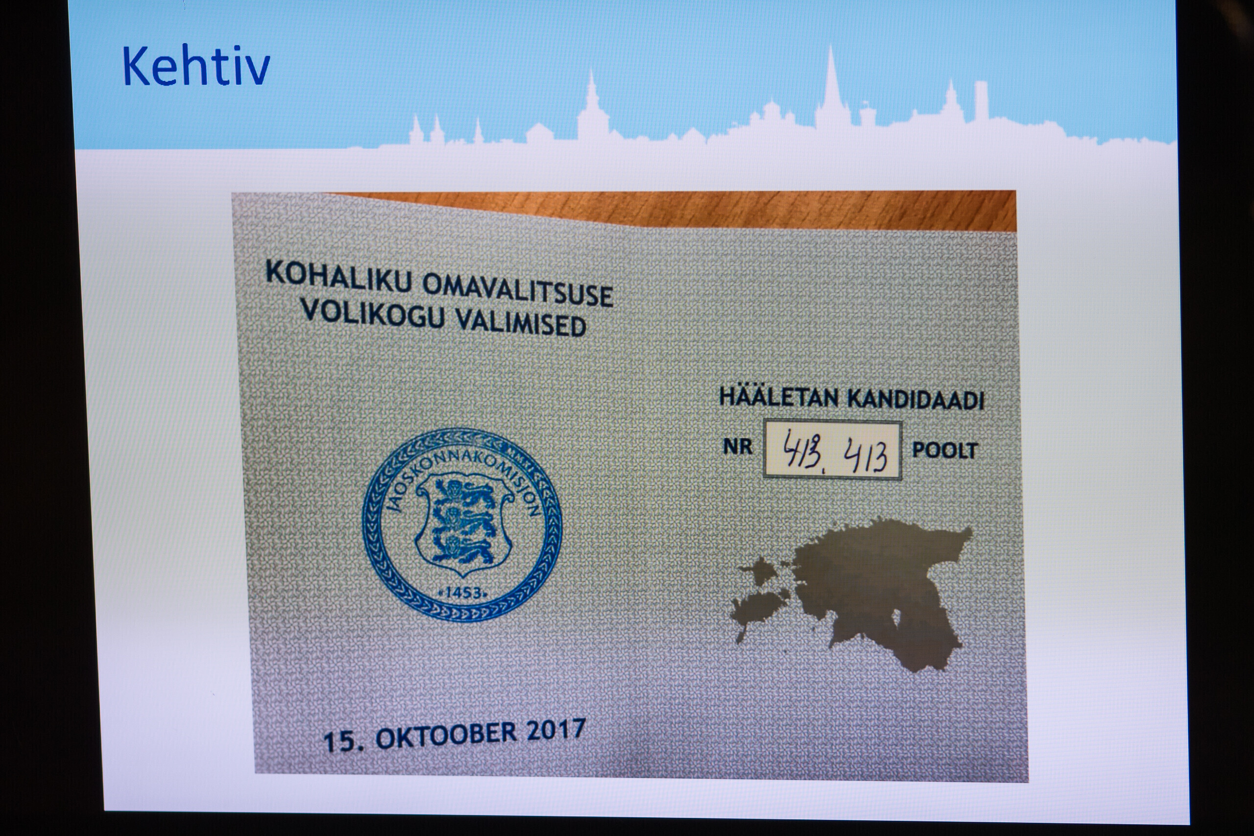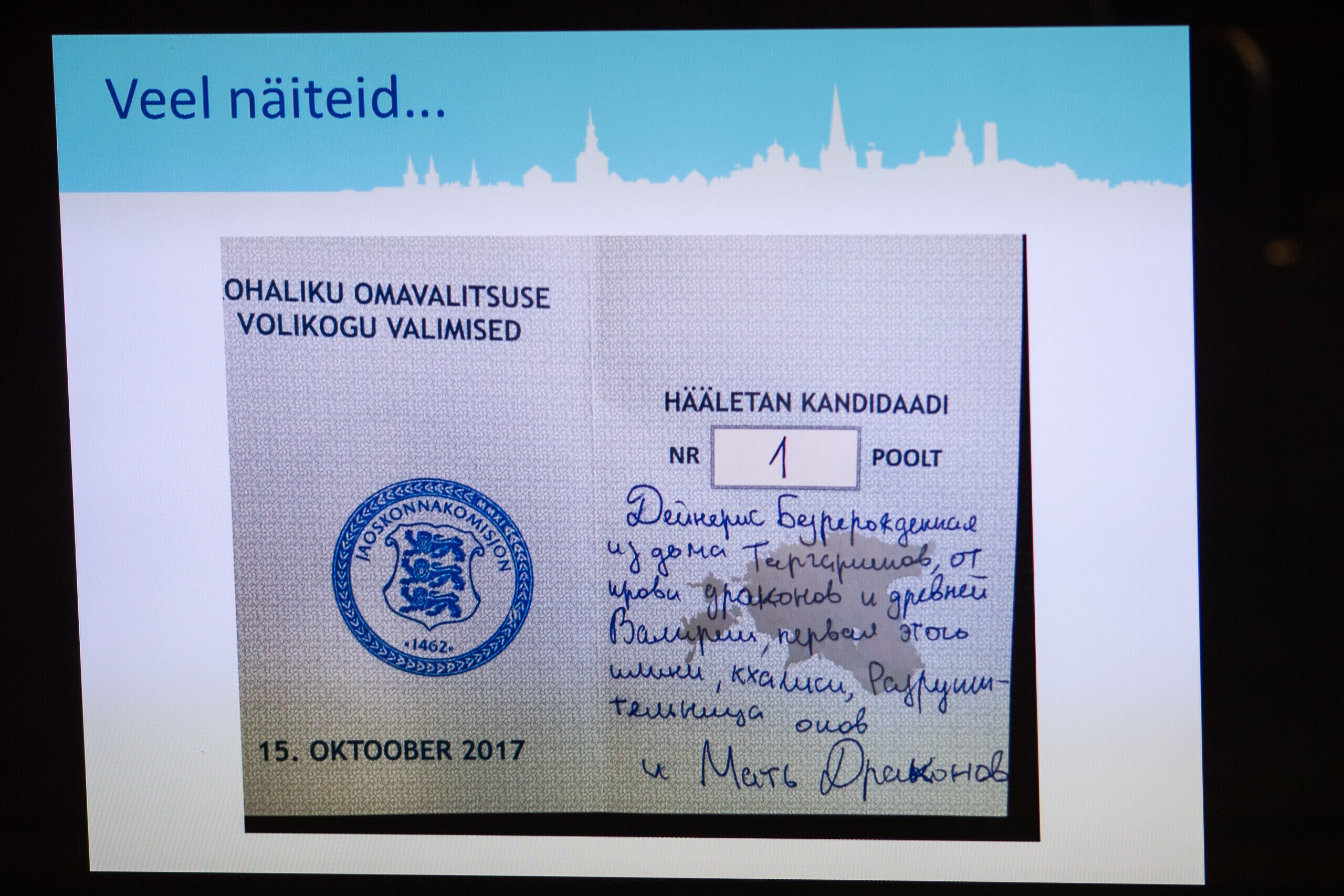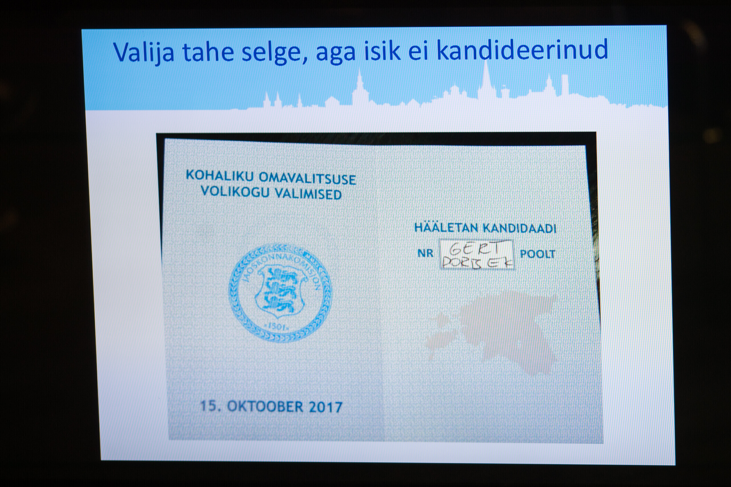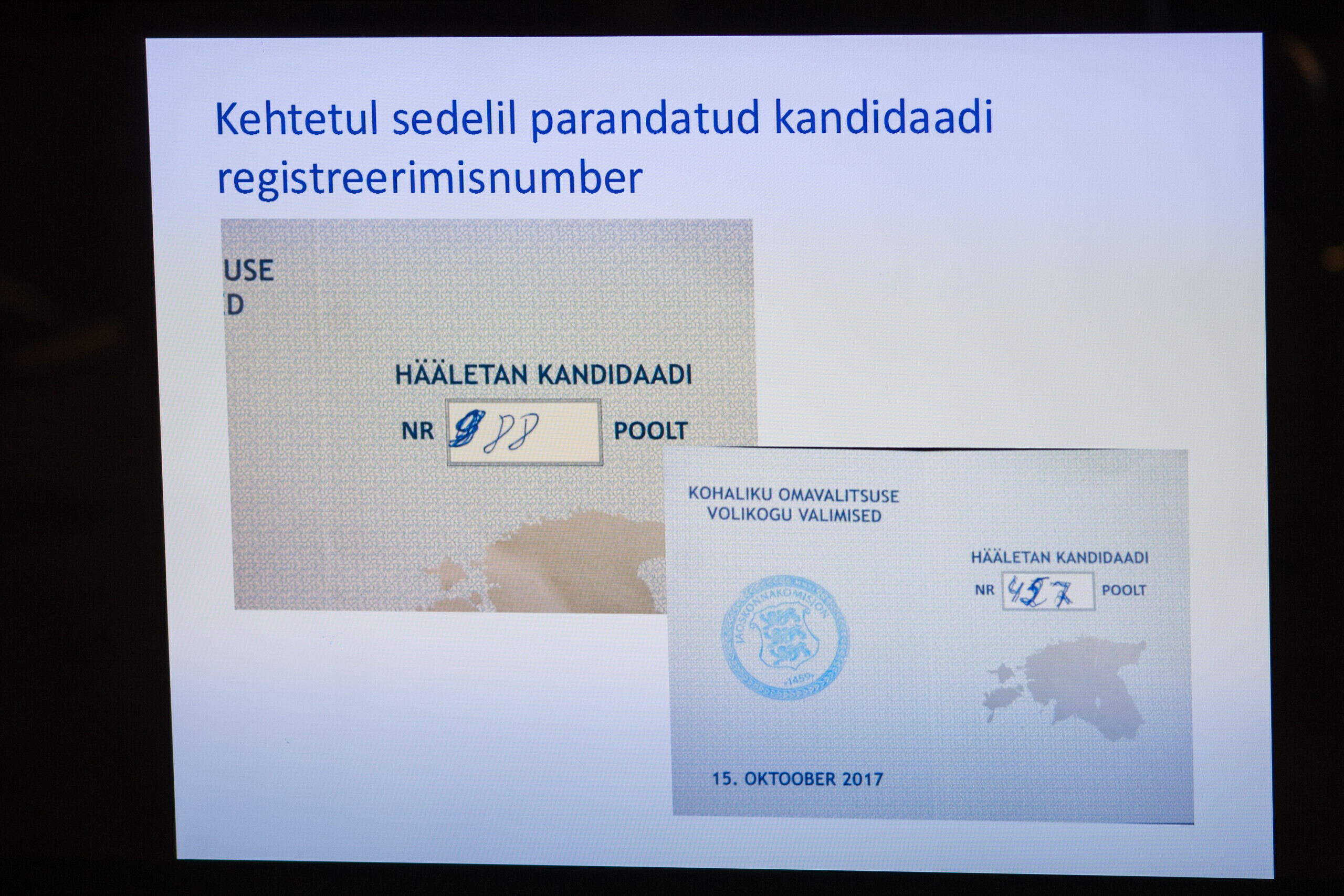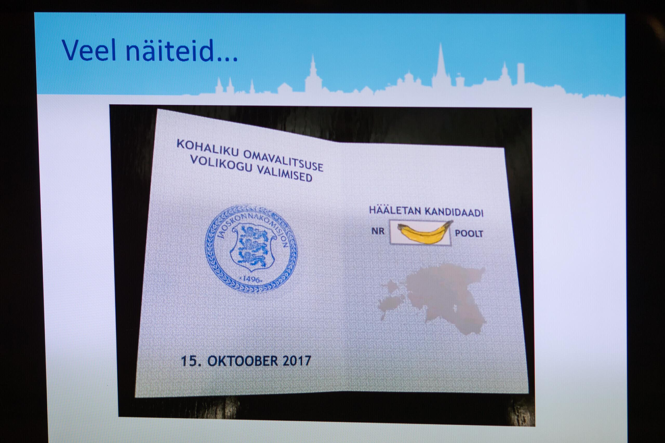 Tallinna valimiskomisjoni esimees Toomas Sepp näitas täna linnavalitsuse istungi järgsel pressikonverentsil häältelugemisel silma jäänud rikutud valimissedeleid.