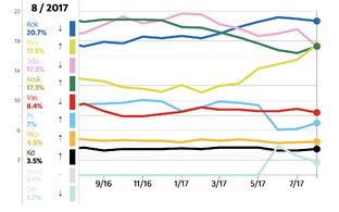 Kolmandale kohale on tõusnud peaminister Juha Sipilä partei Keskerakond, kelle toetus kasvas kuuga 1,6 protsendipunkti 17,4 protsendini.