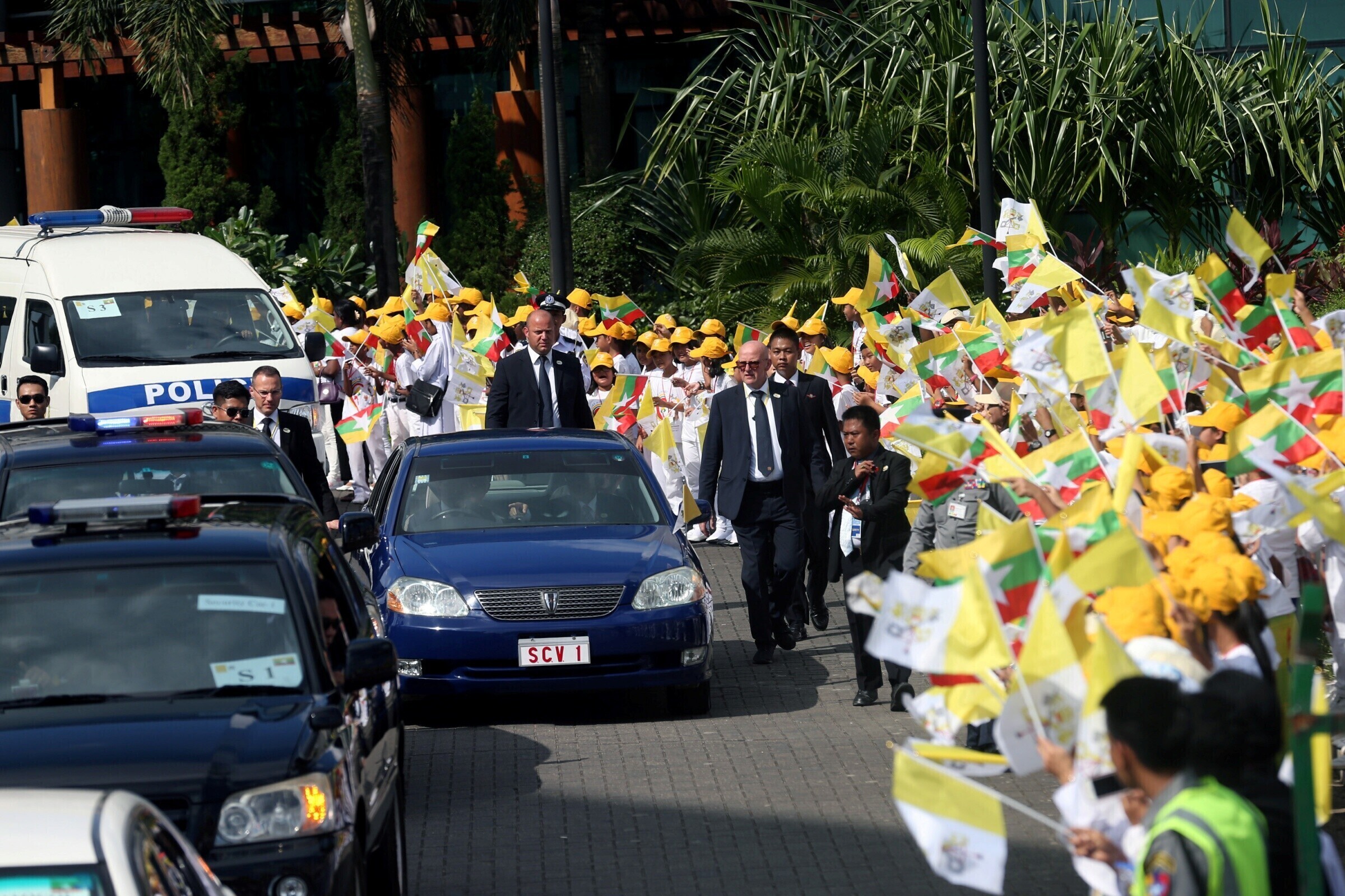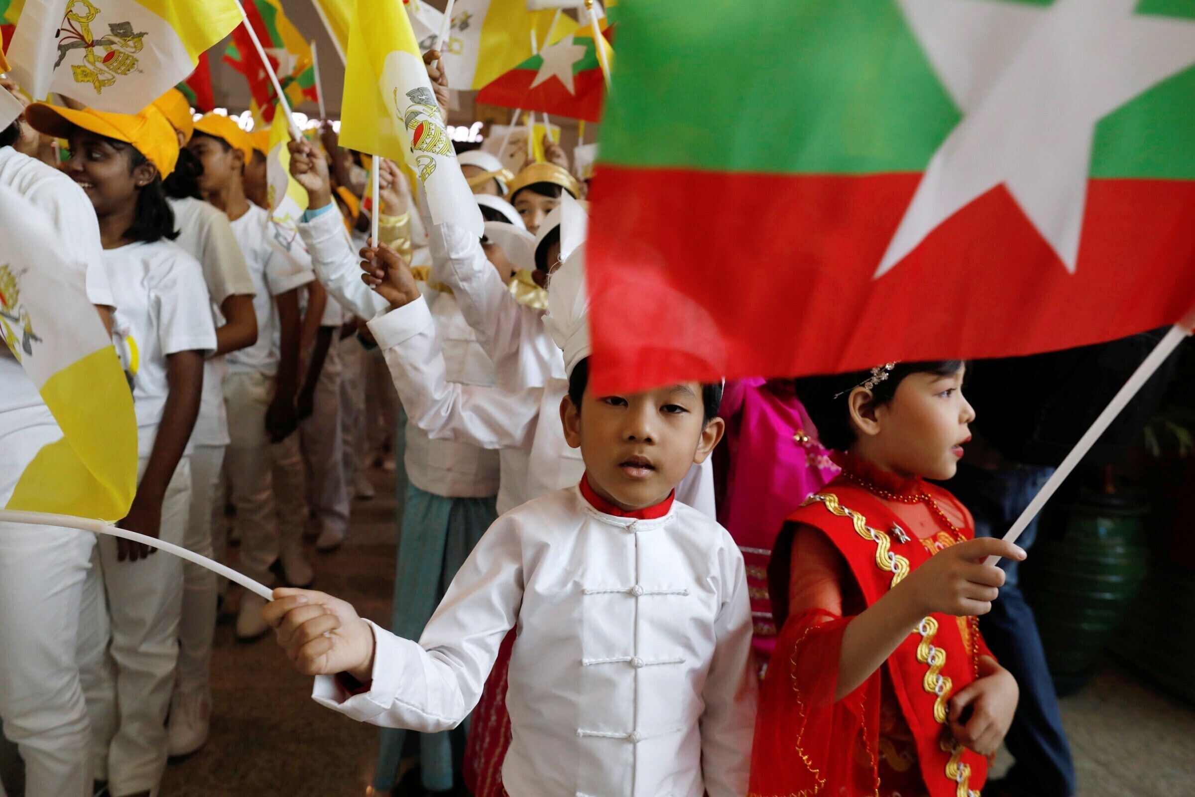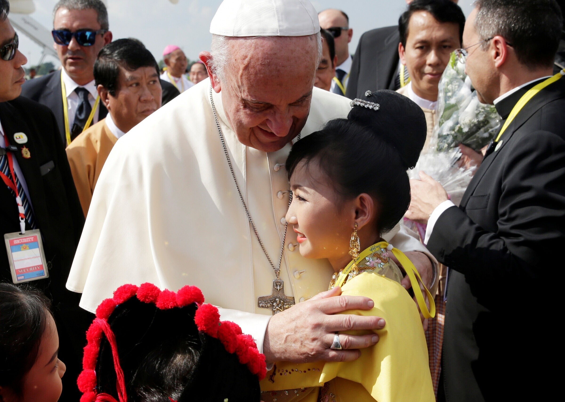 Etnilised vähemusrahvad tervitasid paavsti Yangoni lennujaamas ja lapsed kinkisid talle lilli, vahendas Reuters.