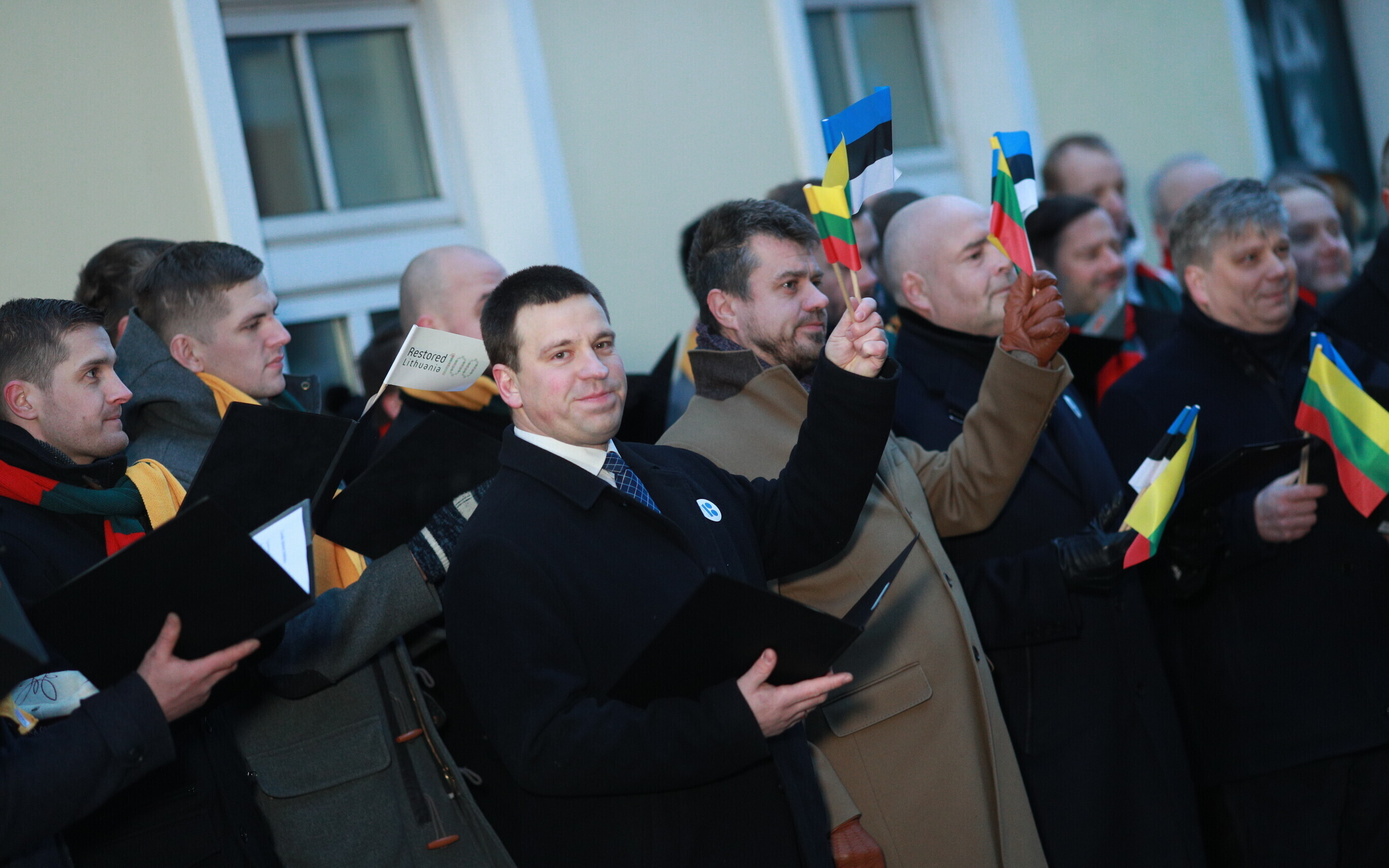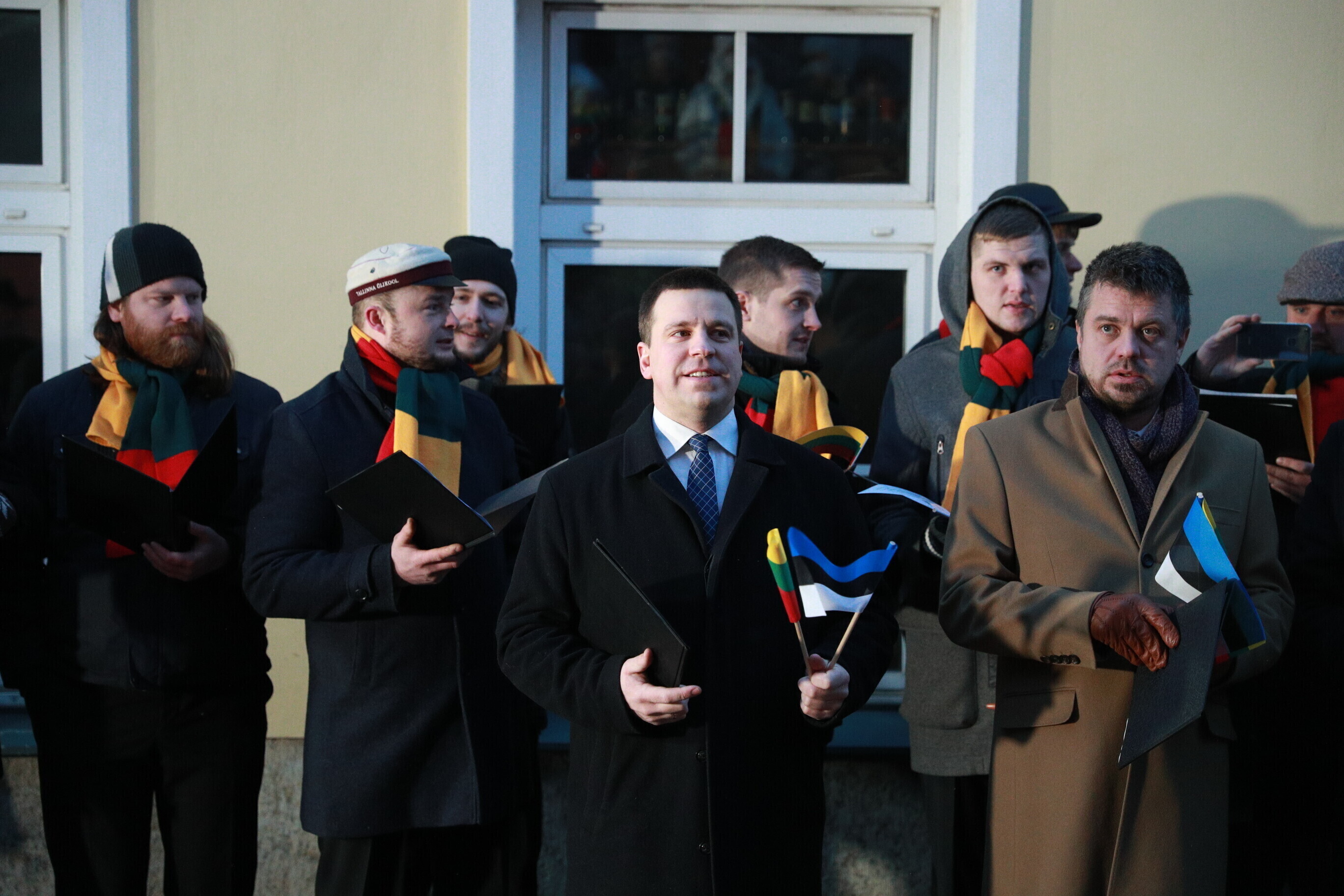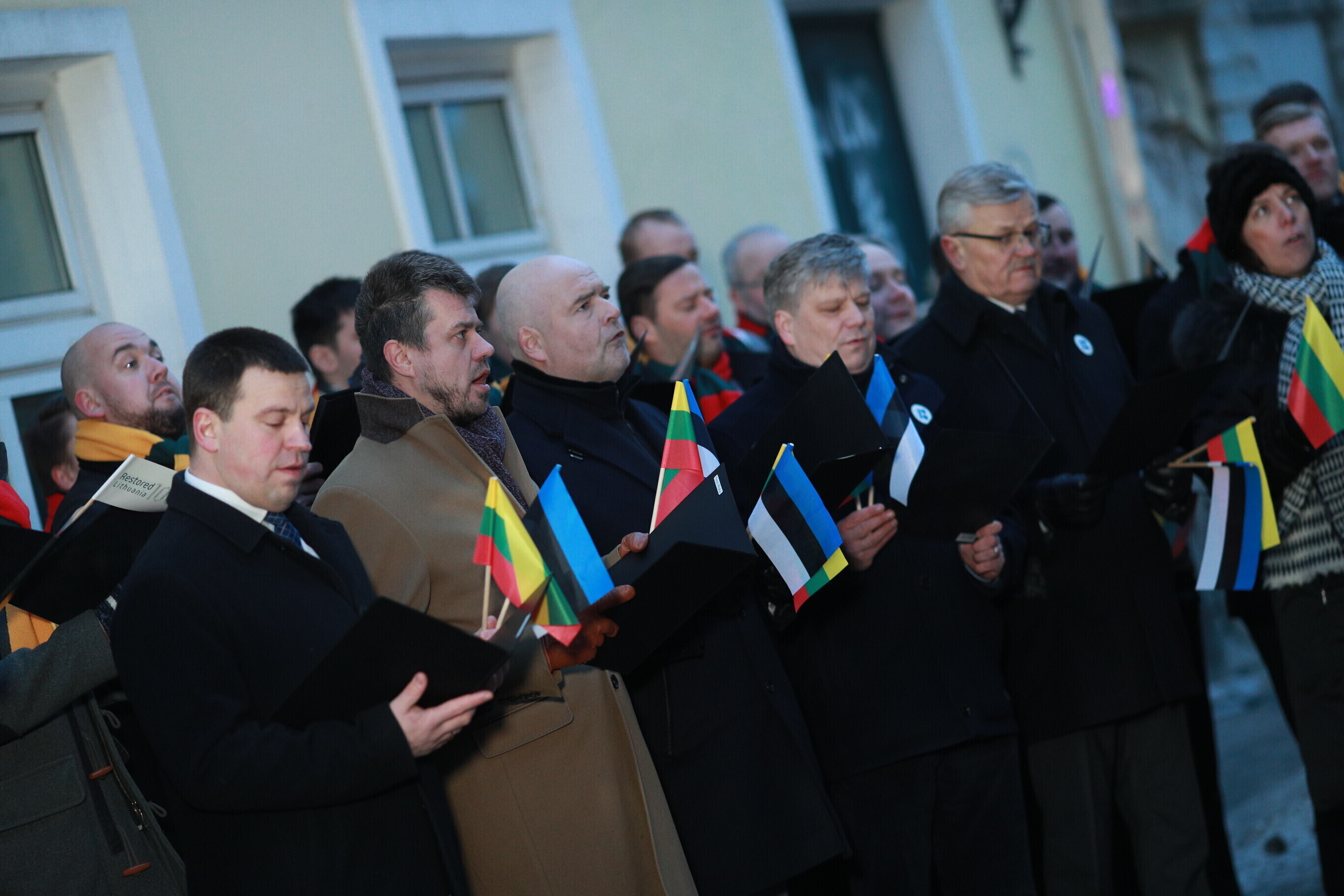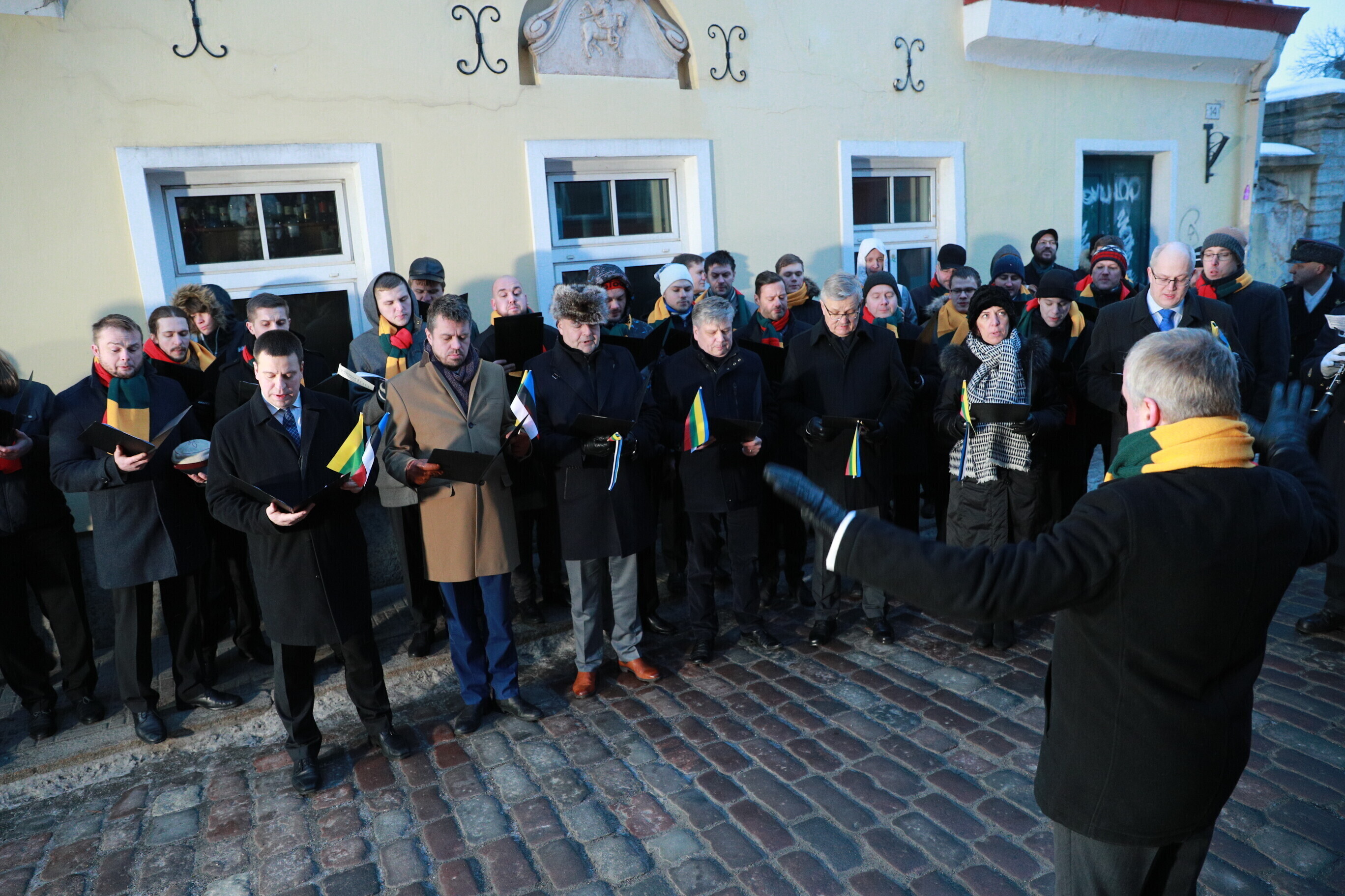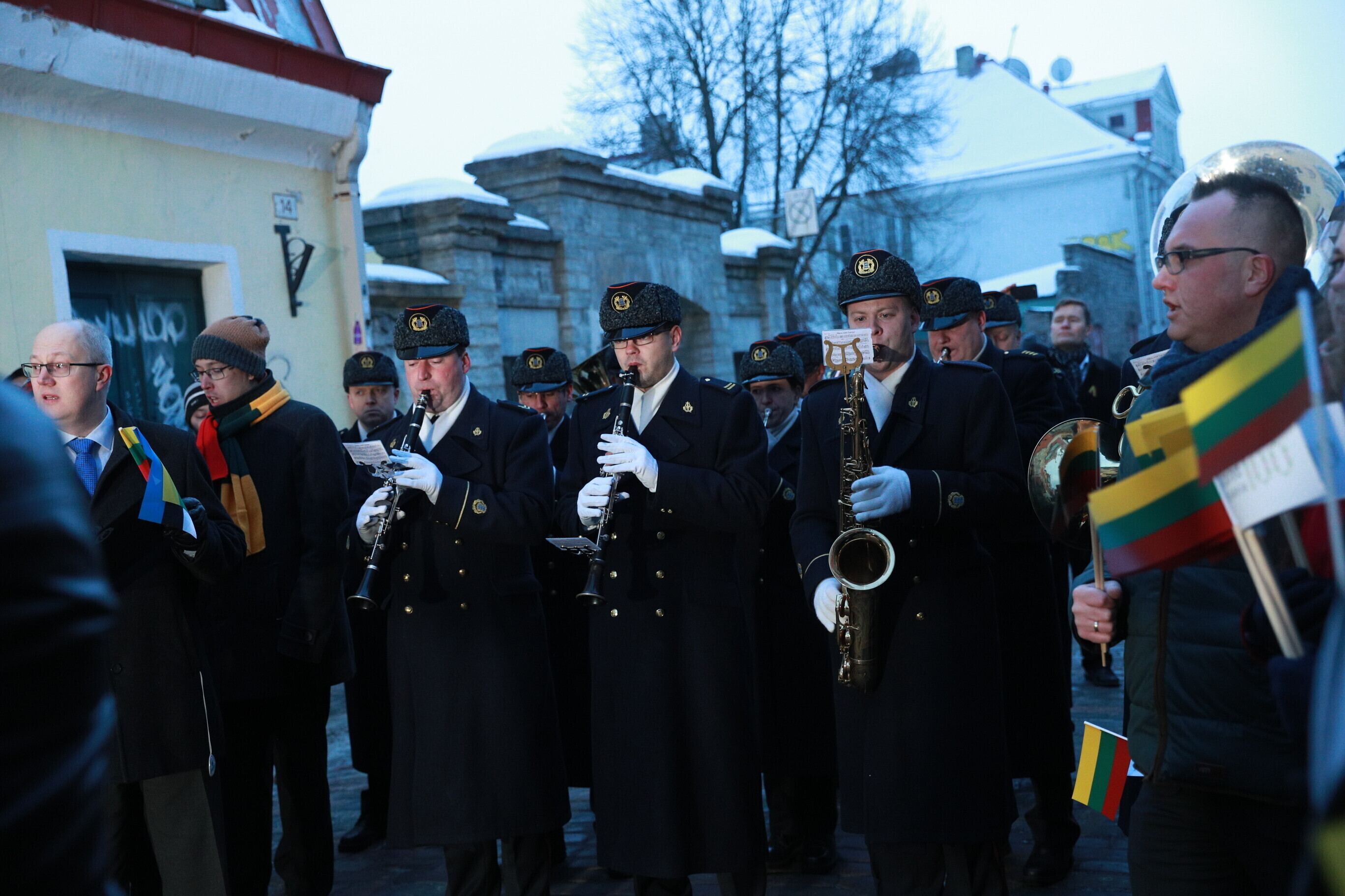 Leedu vabariigi 100. aastapäeva puhul esitasid valitsuse liikmed ja Eestis elavad leedulased kell kaheksa Tallinnas Leedu suursaatkonna juures Leedu hümni.