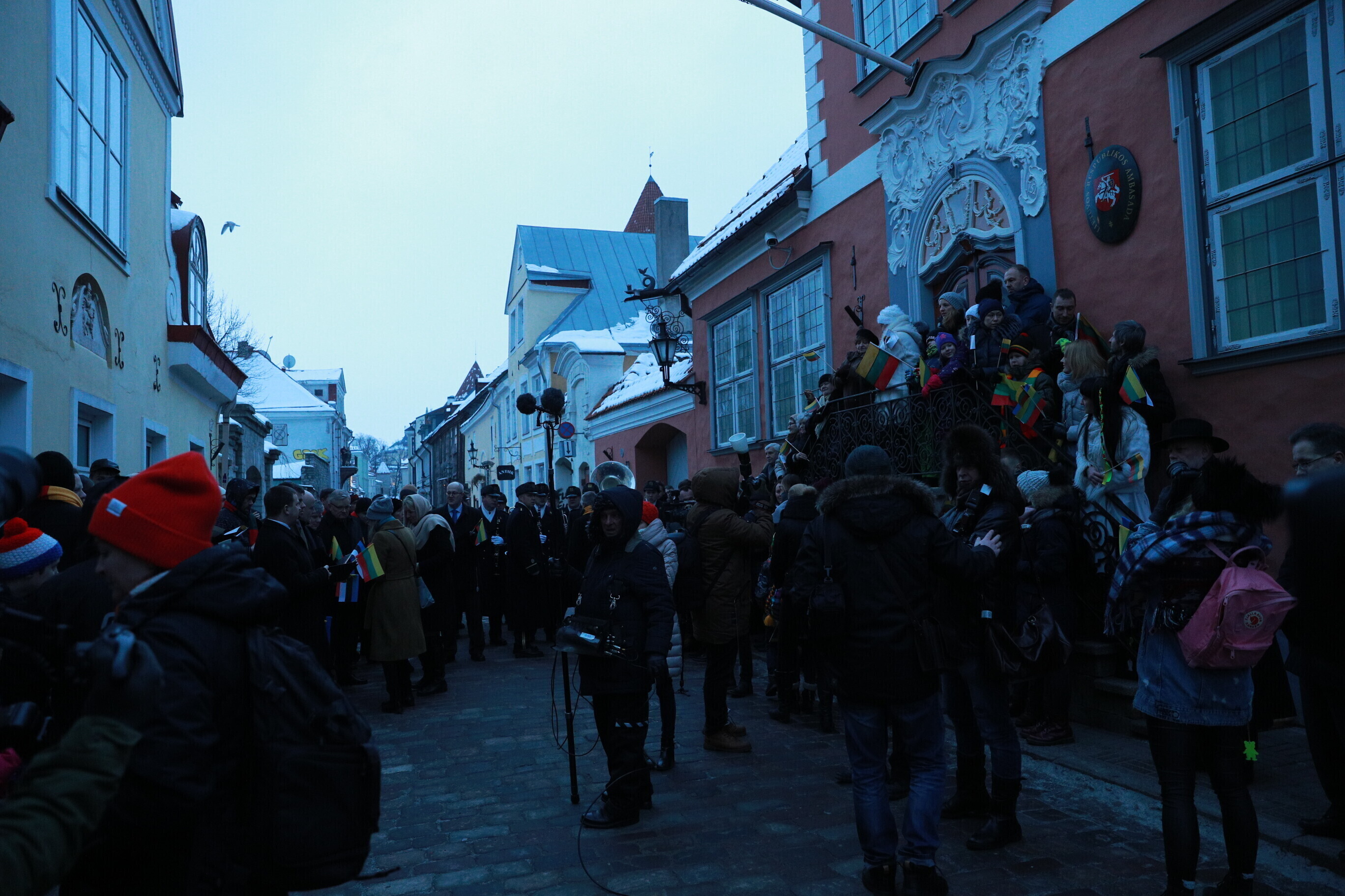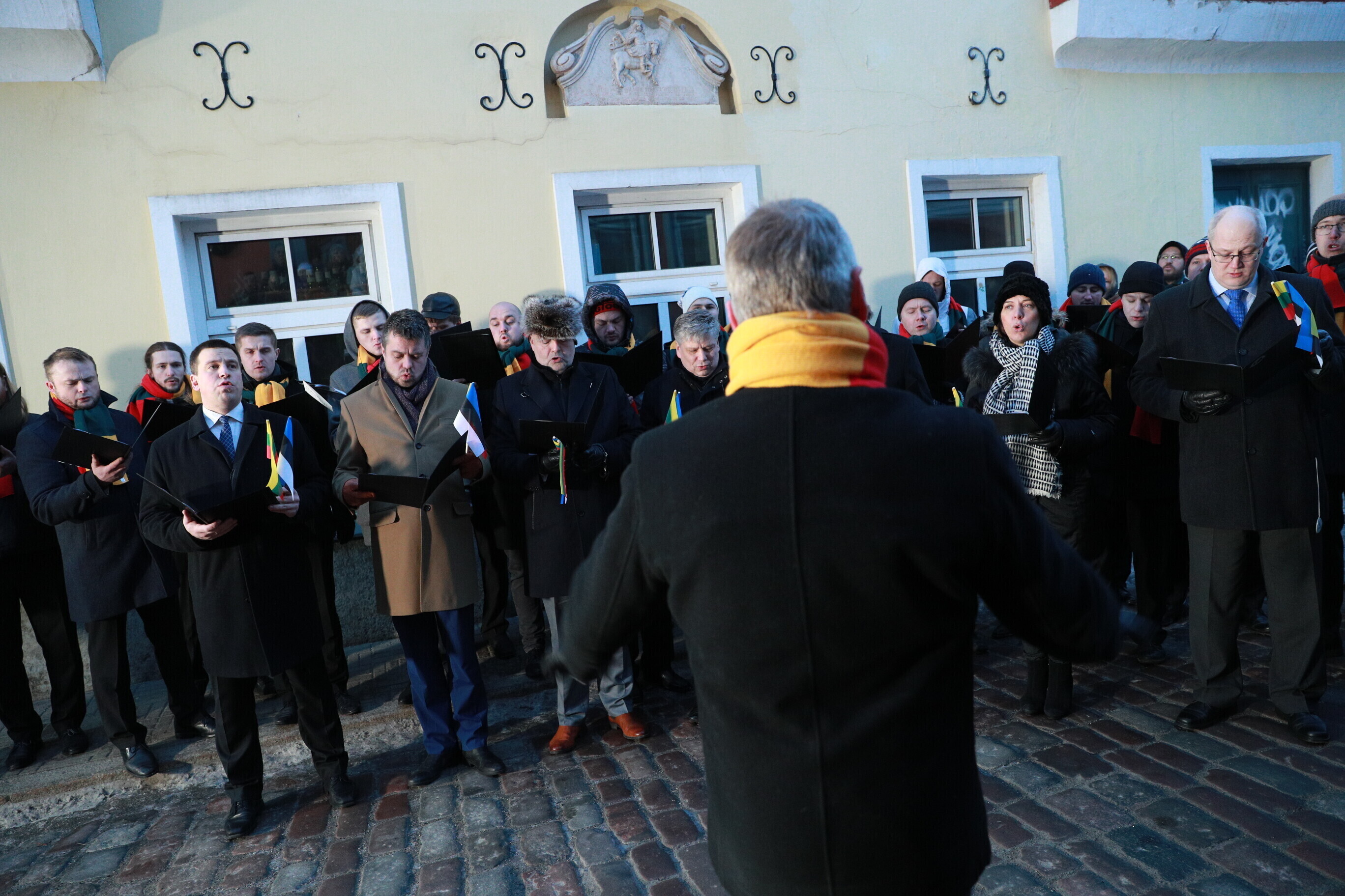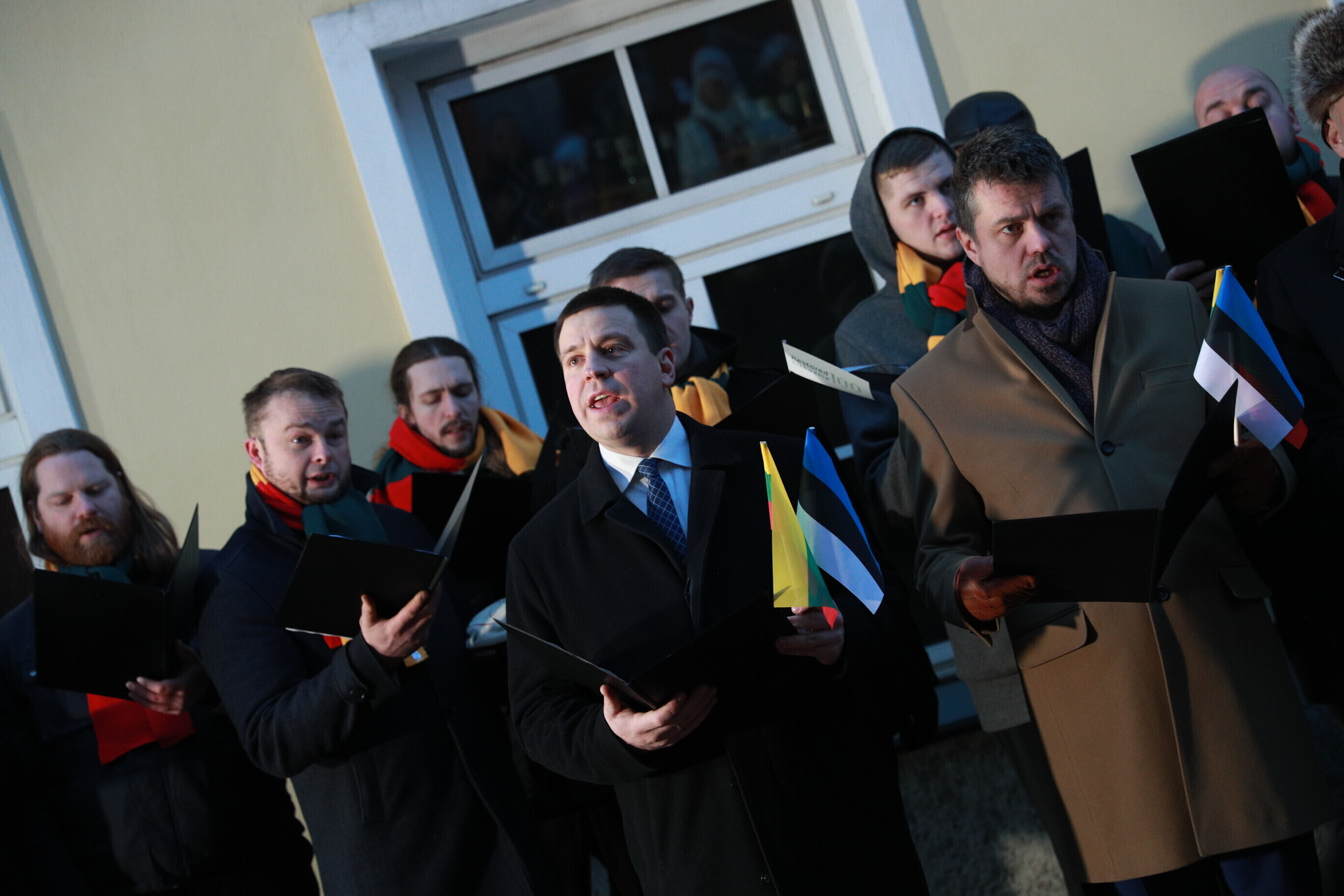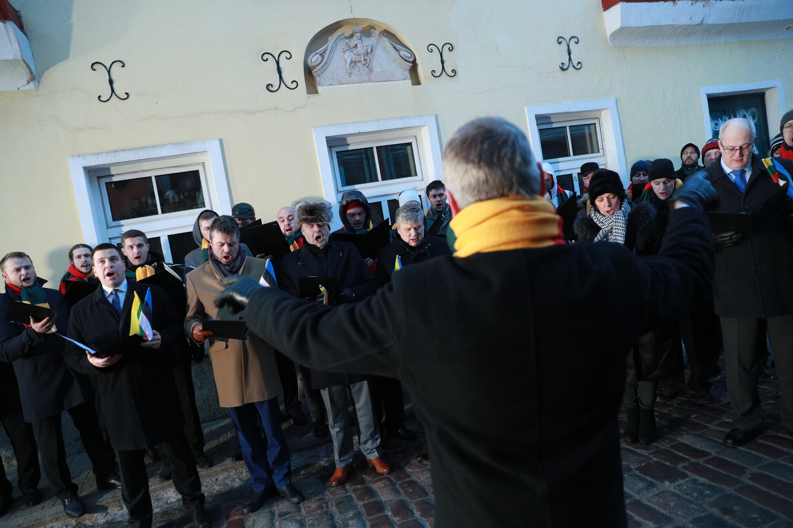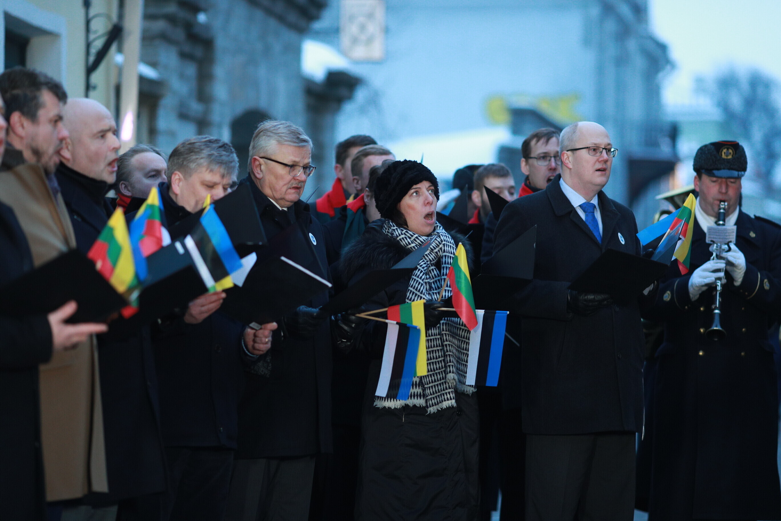 Leedu vabariigi 100. aastapäeva puhul esitasid valitsuse liikmed ja Eestis elavad leedulased kell kaheksa Tallinnas Leedu suursaatkonna juures Leedu hümni.