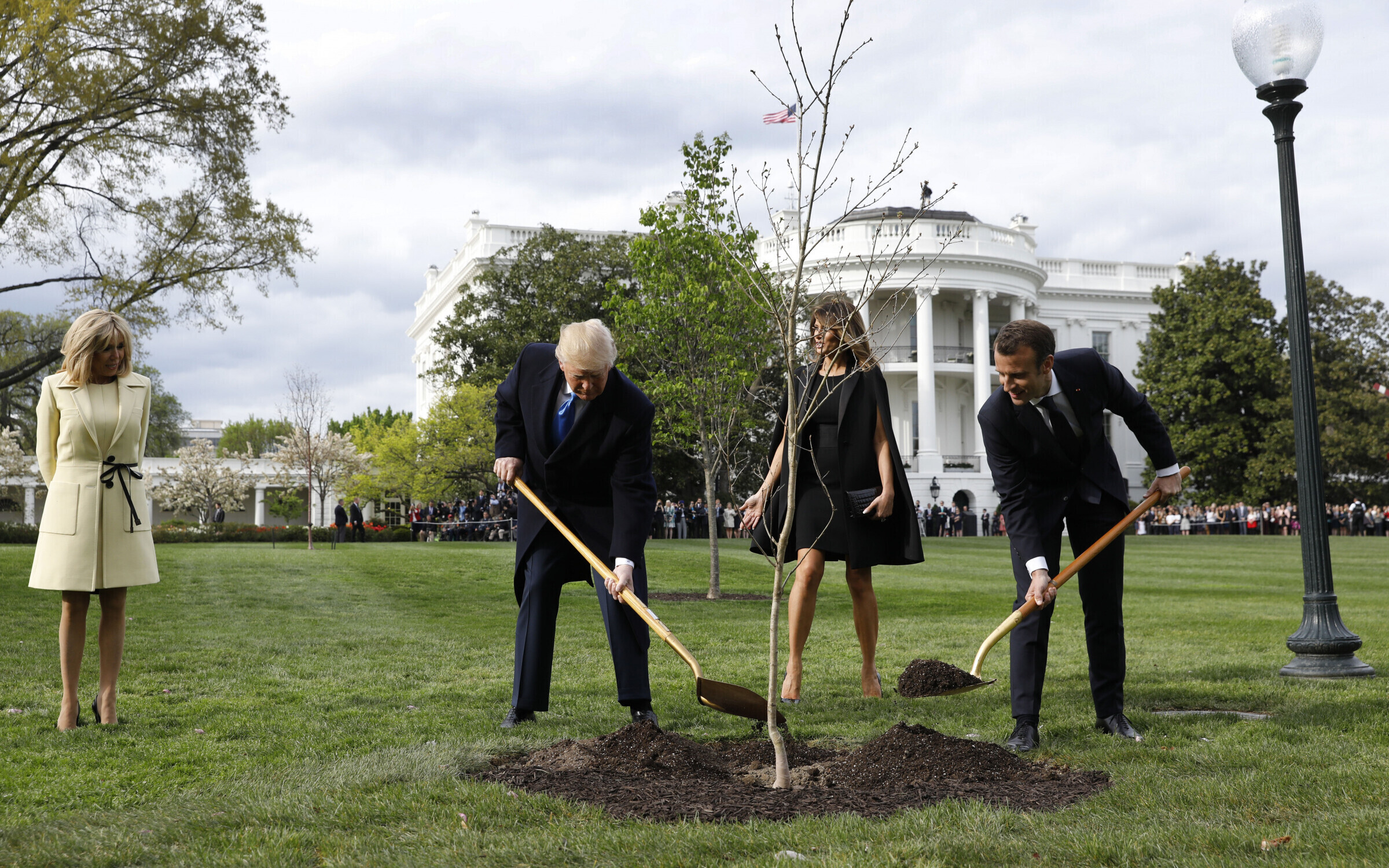 MOMENTS AGO: President Trump, first lady Melania Trump welcome French president Emmanuel Macron, his wife to the White House. Visit begins with planting of tree –– a gift from France. https://t.co/aX8thrHWDN pic.twitter.com/7ZrWTeUQmK