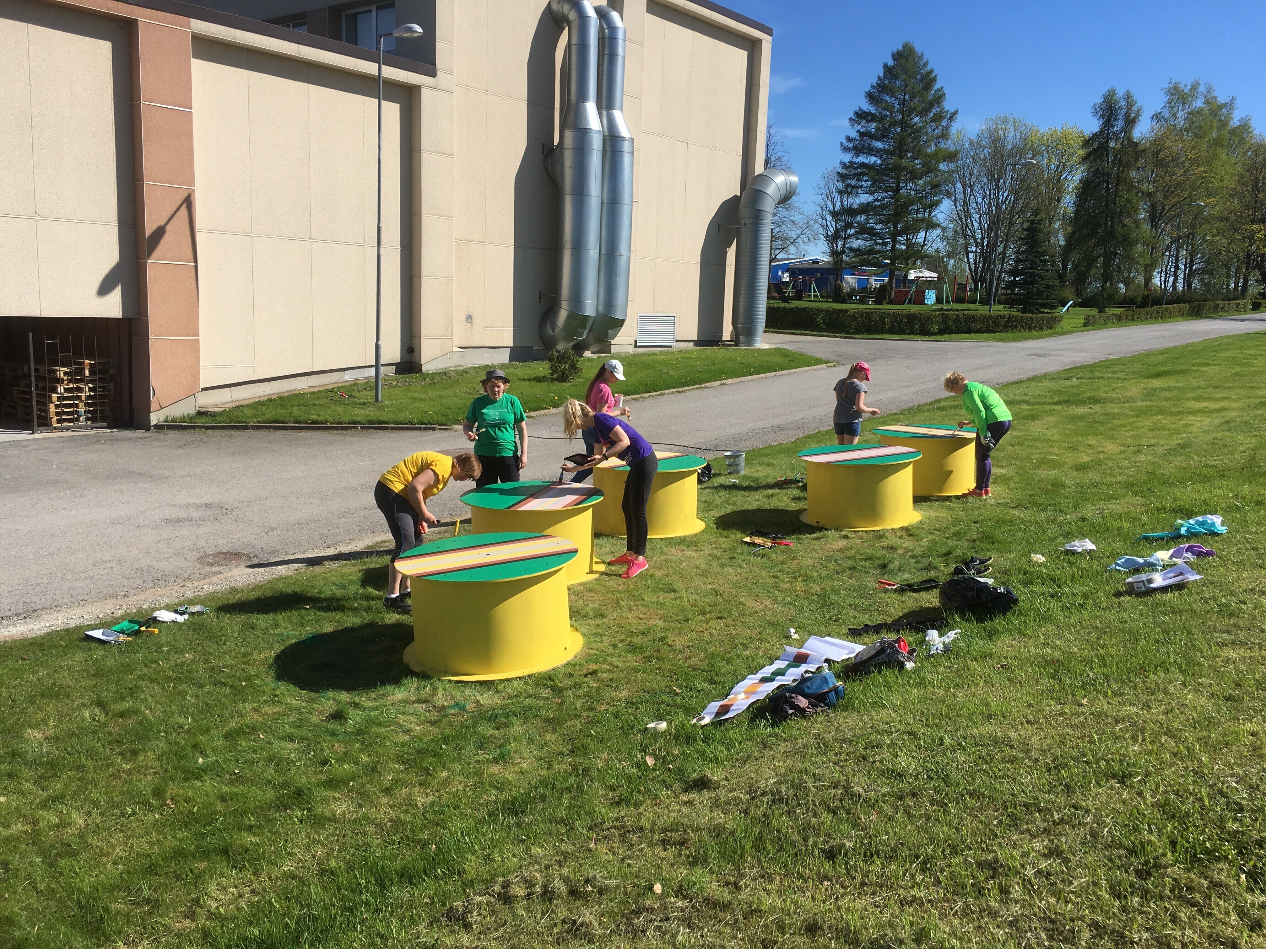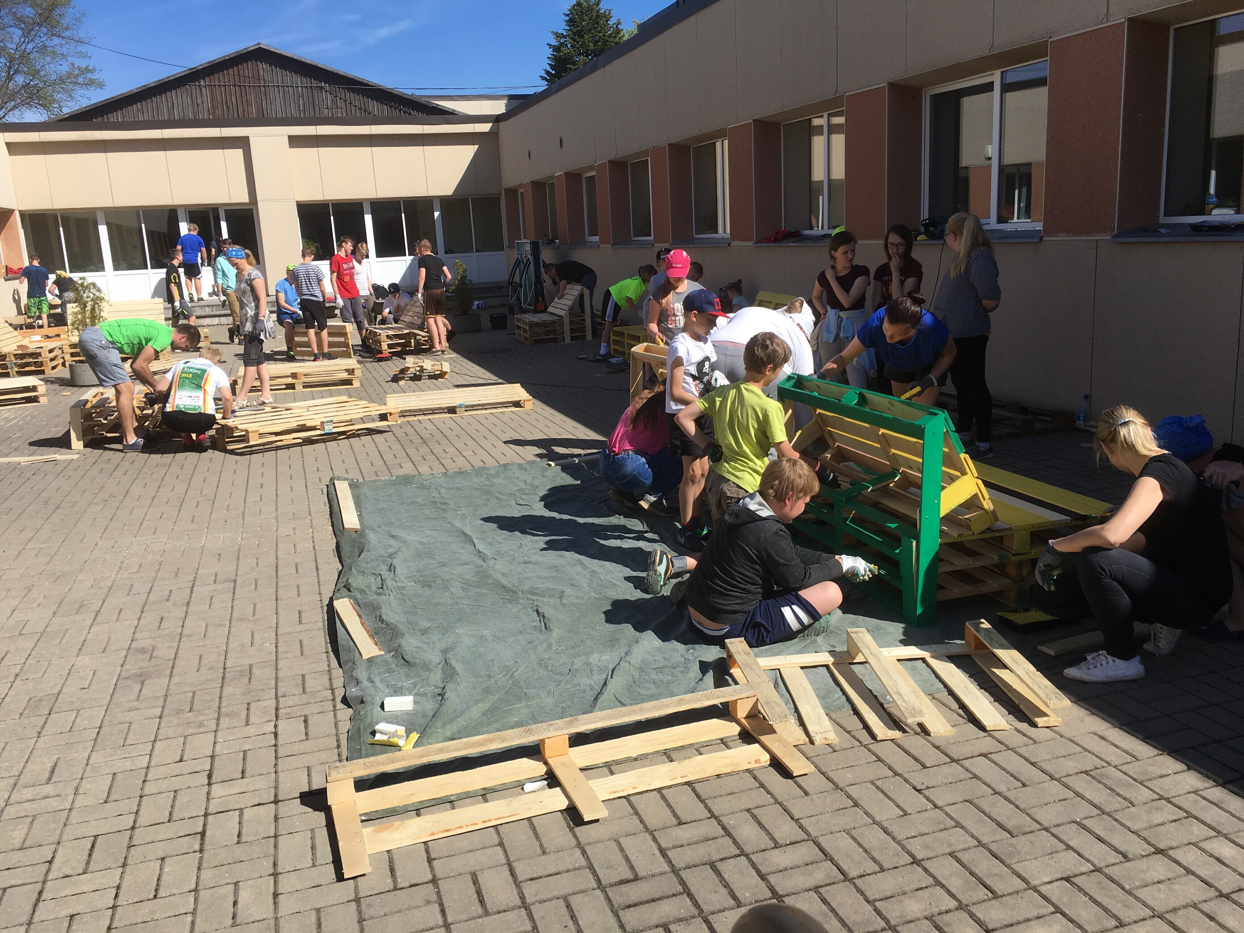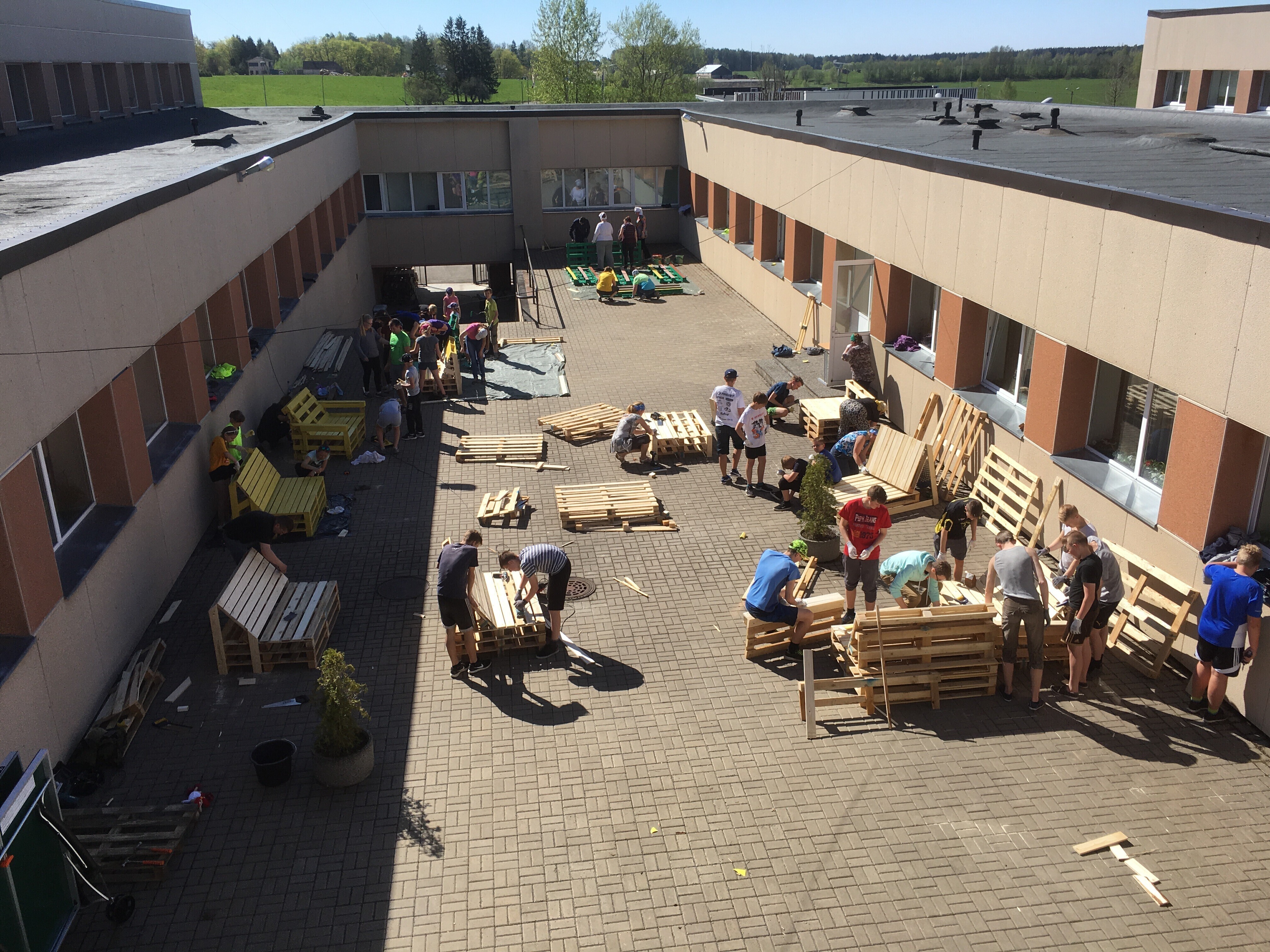 Ida-Virumaal Alutaguse vallas asuvas Iisaku gümnaasiumis toimunud talgupäeval meisterdasid õpilased lapsevanemate ja õpetajate abiga kooli hoovi euroalustest ja vanadest kaablirullidest mööbli.