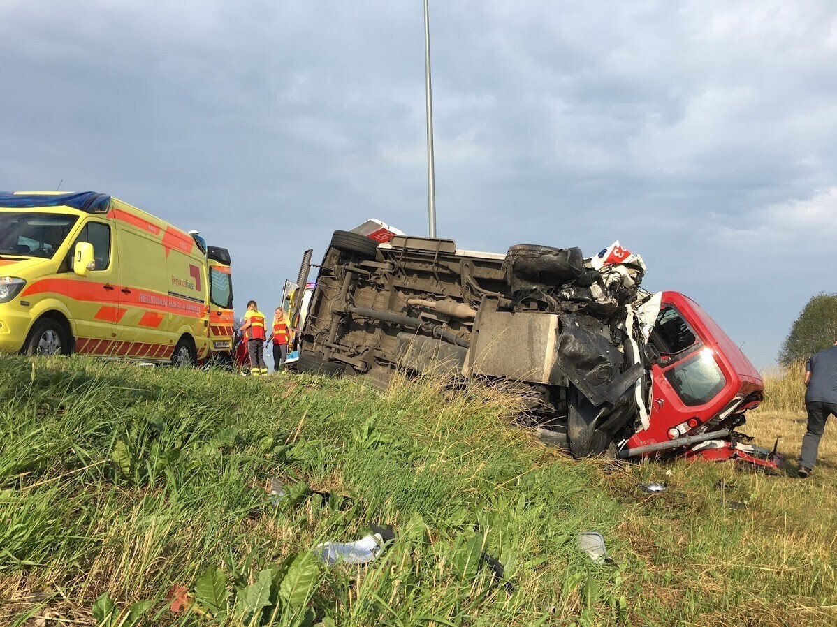 Kiirabiauto paiskus õnnetuse tagajärjel küljele, sõiduauto paiskus kraavi.