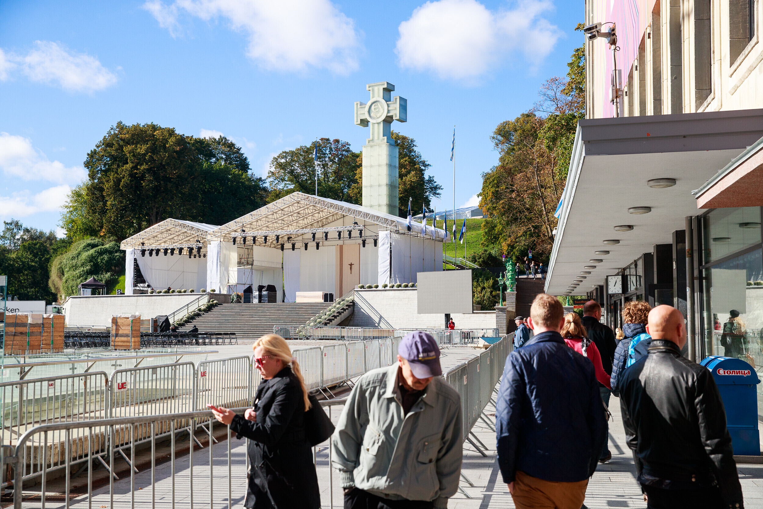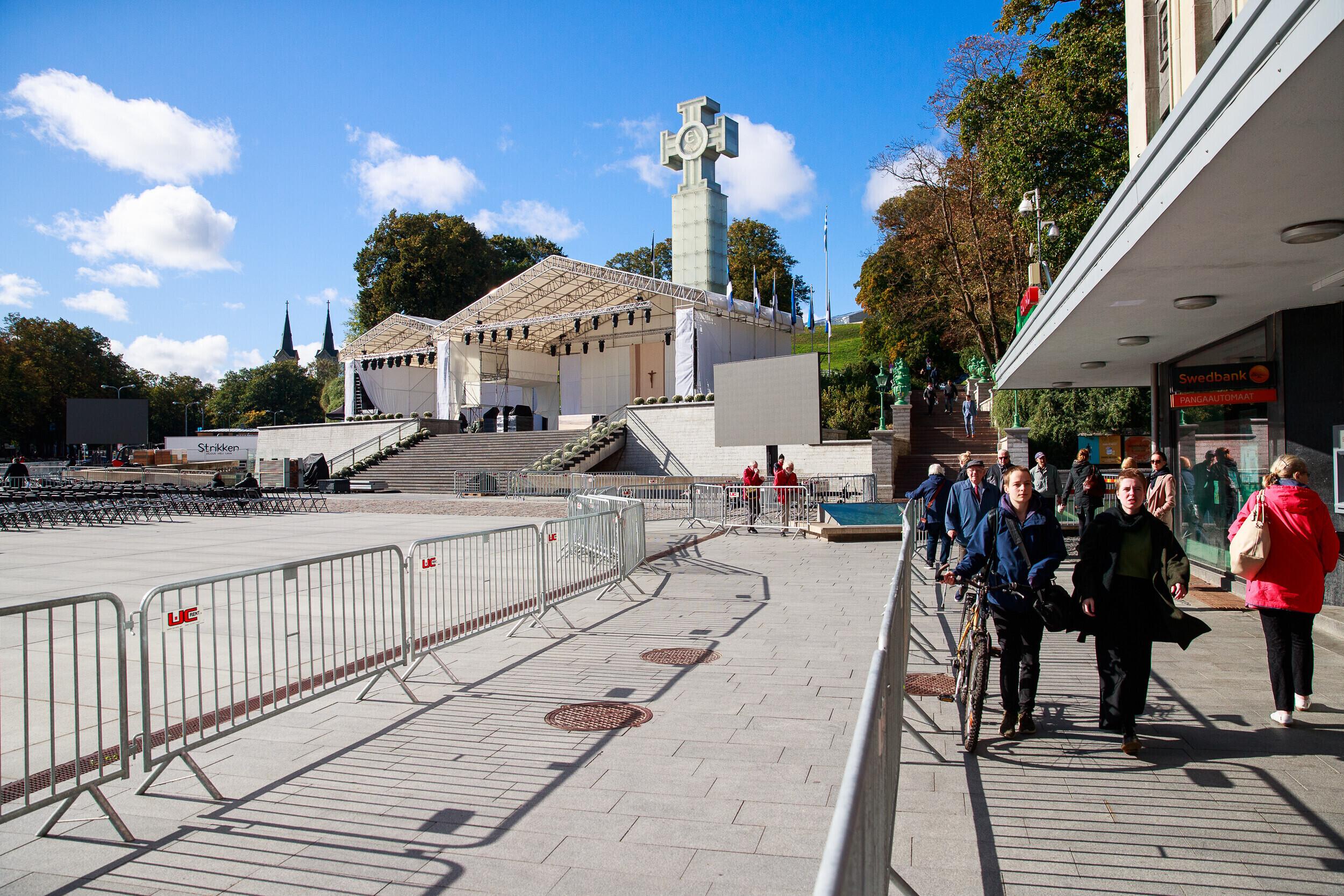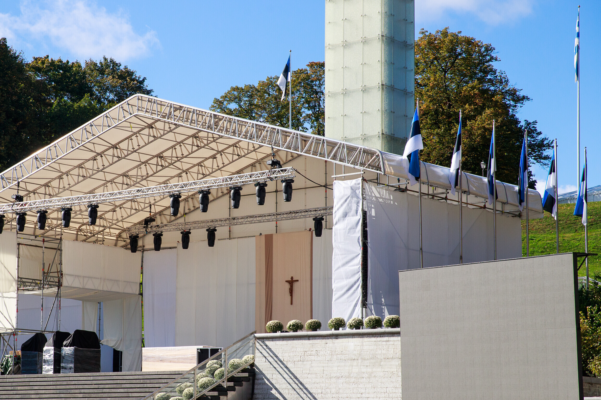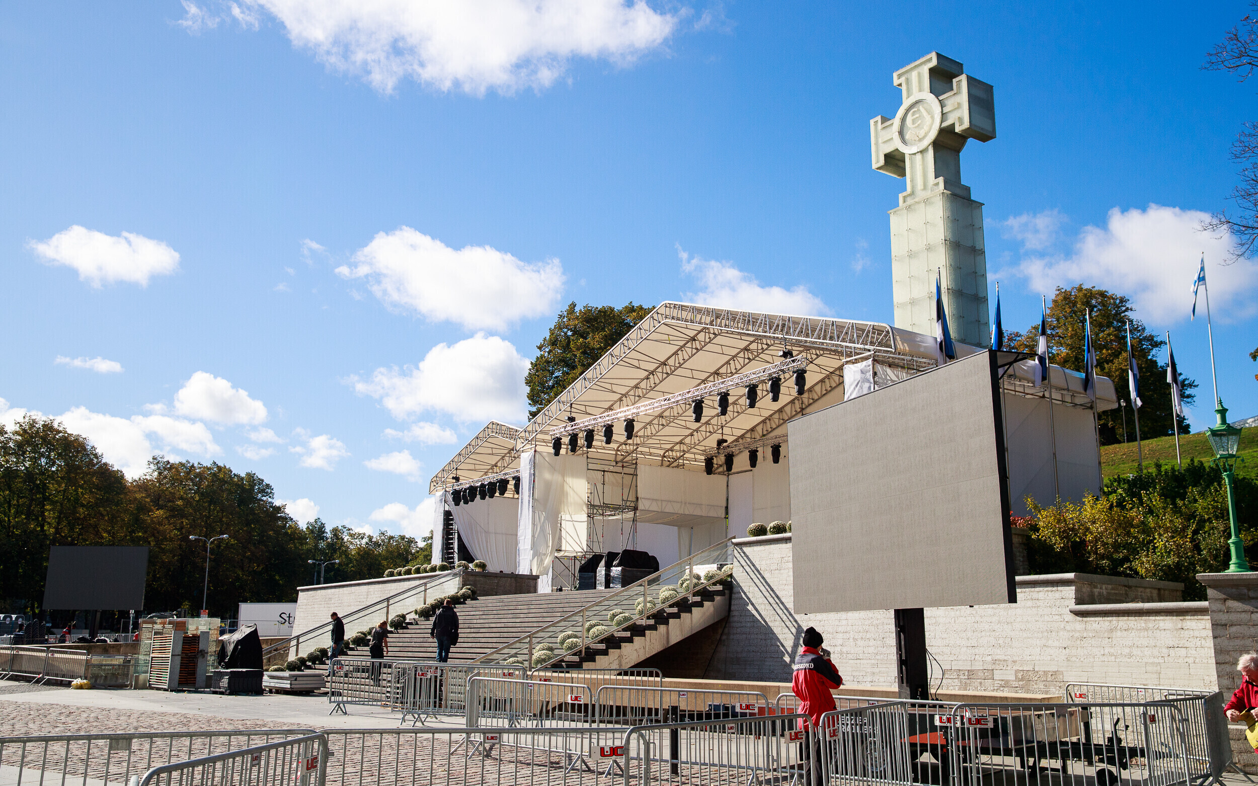 Tallinnas Vabaduse väljakul askeldasid esmaspäeval töömehed, kes seadsid platsi valmis teisipäevaseks paavst Franciscuse külaskäiguks ja pühaks missaks.