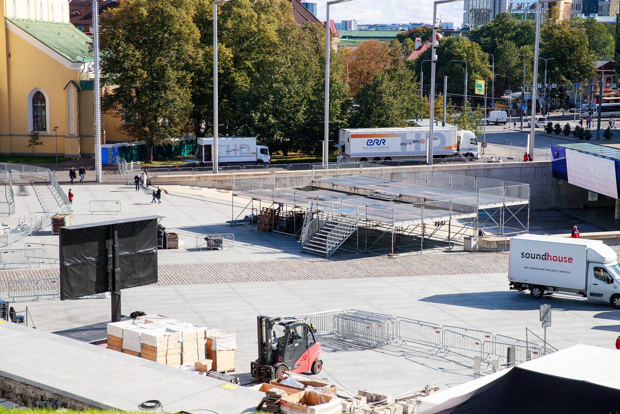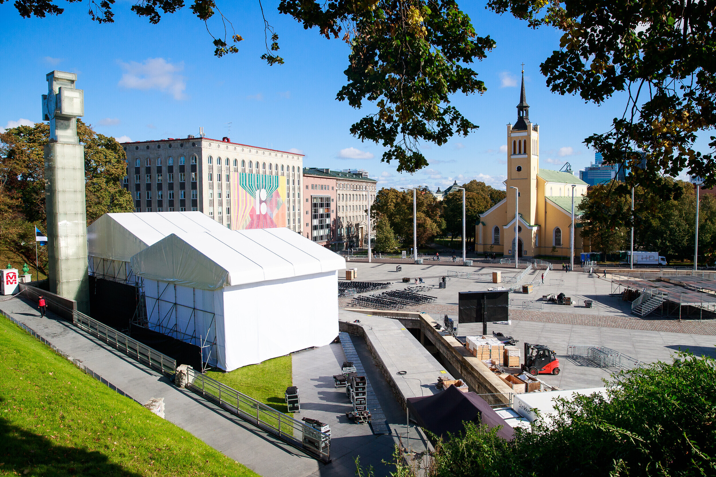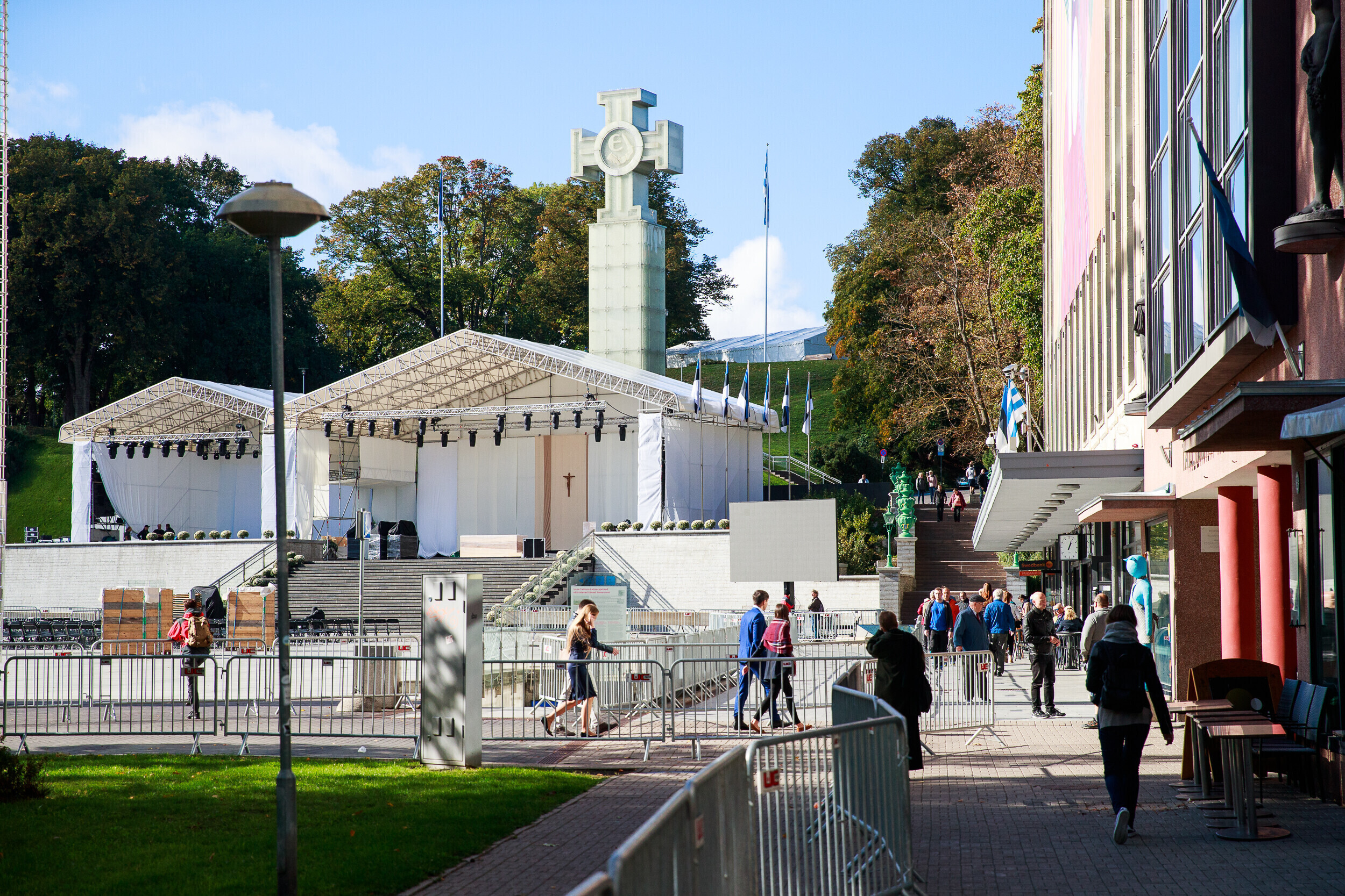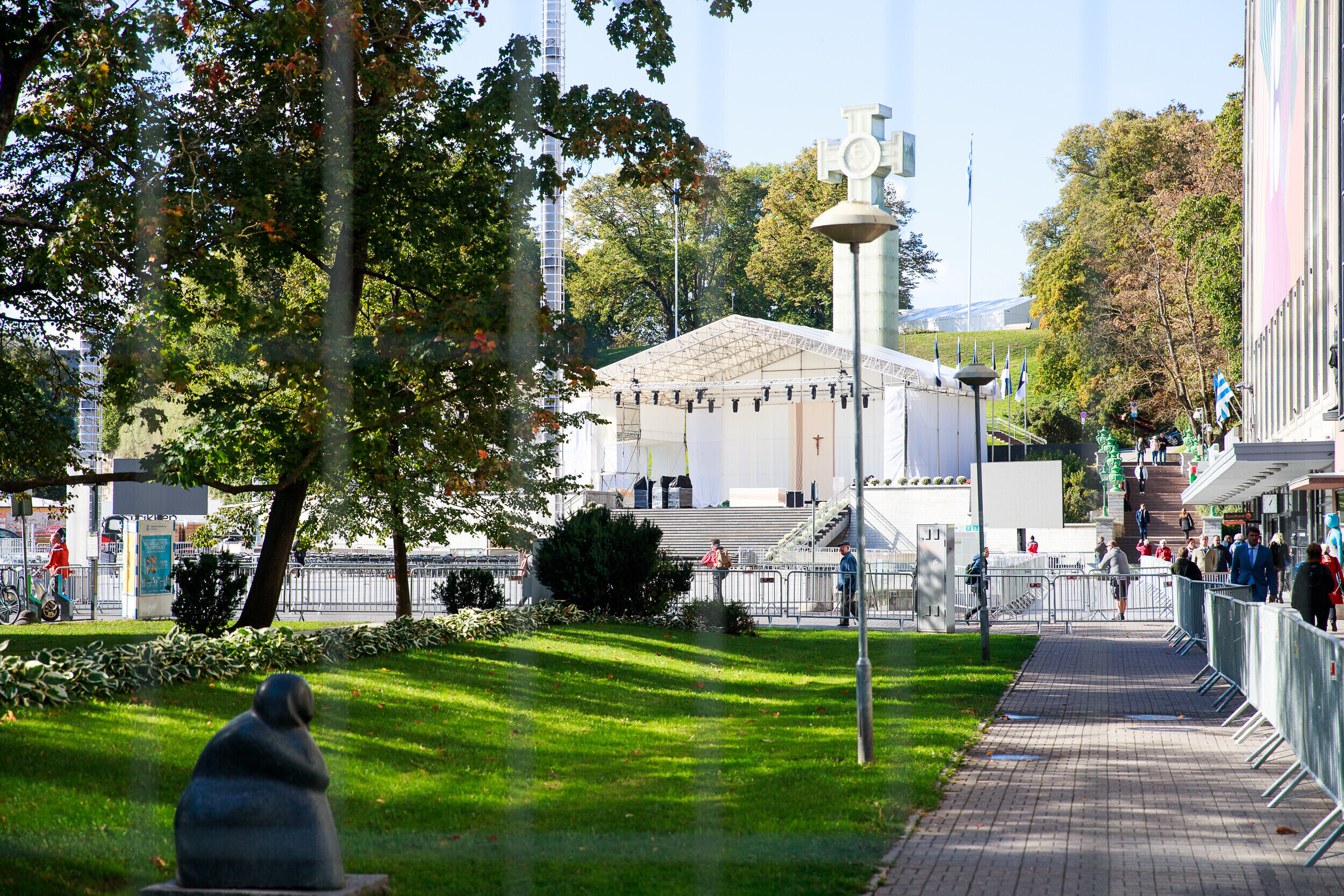 Tallinnas Vabaduse väljakul askeldasid esmaspäeval töömehed, kes seadsid platsi valmis teisipäevaseks paavst Franciscuse külaskäiguks ja pühaks missaks.