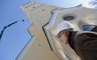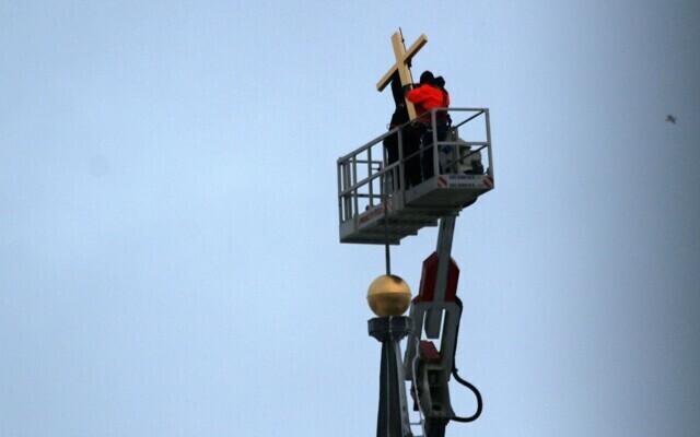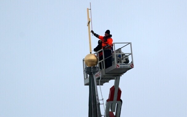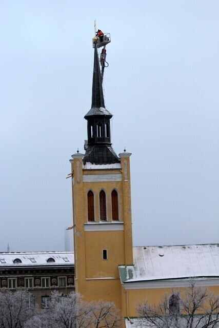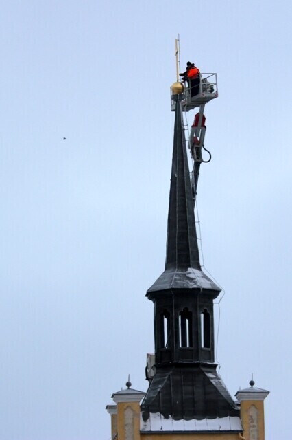 Tallinna Jaani kiriku torni jõudis neljapäeva hommikul kullatud rist ja selle alla kullatud muna.