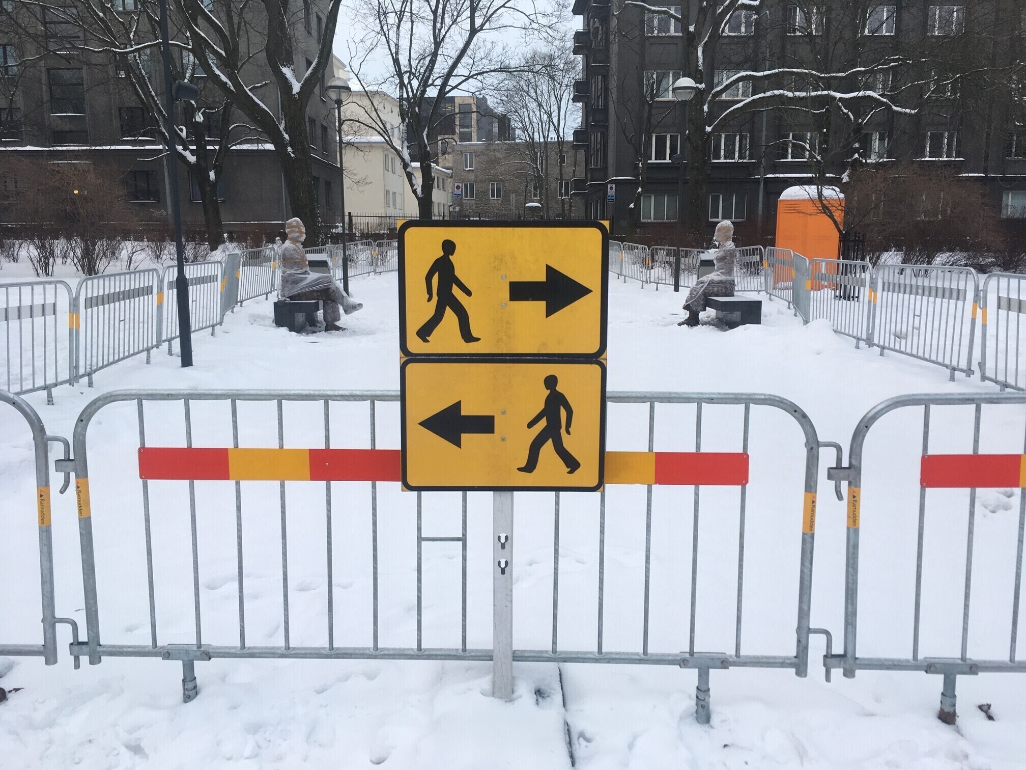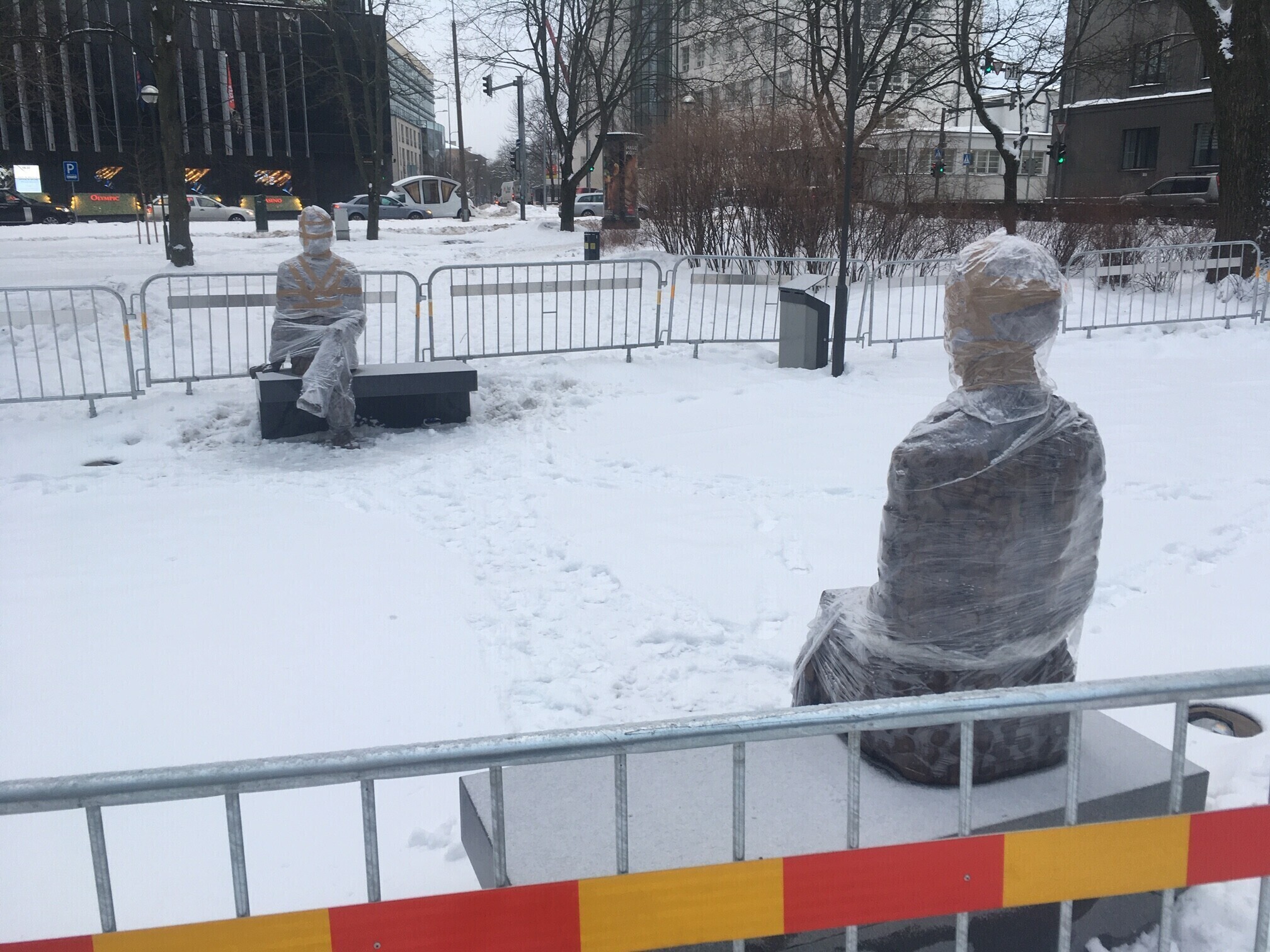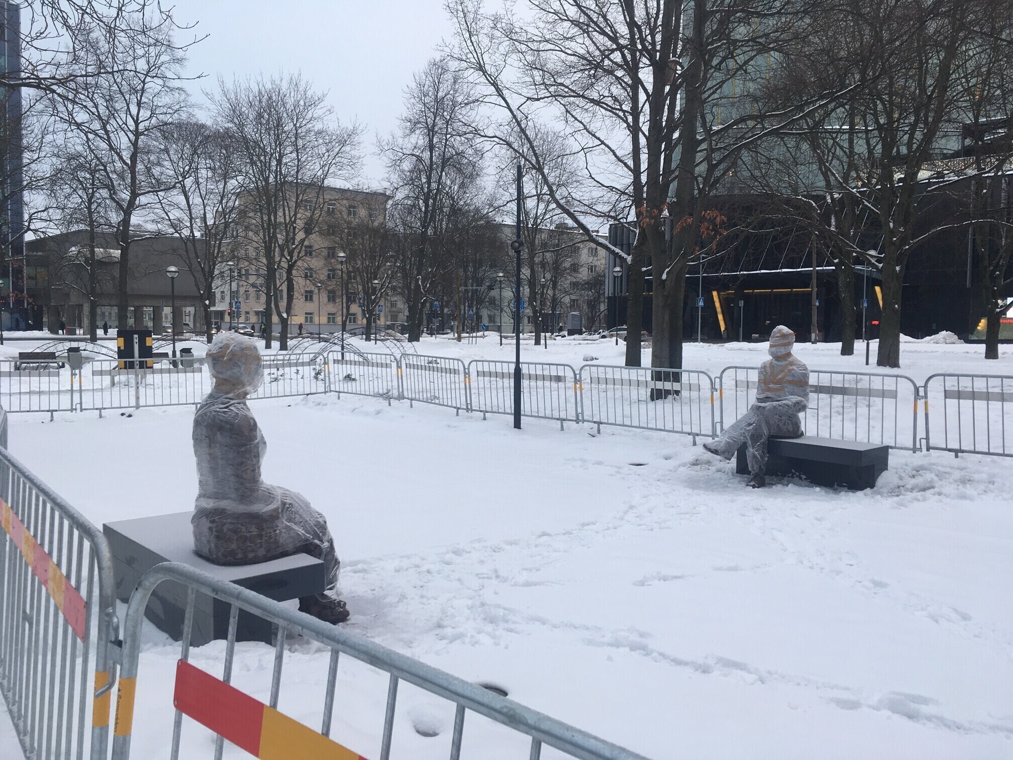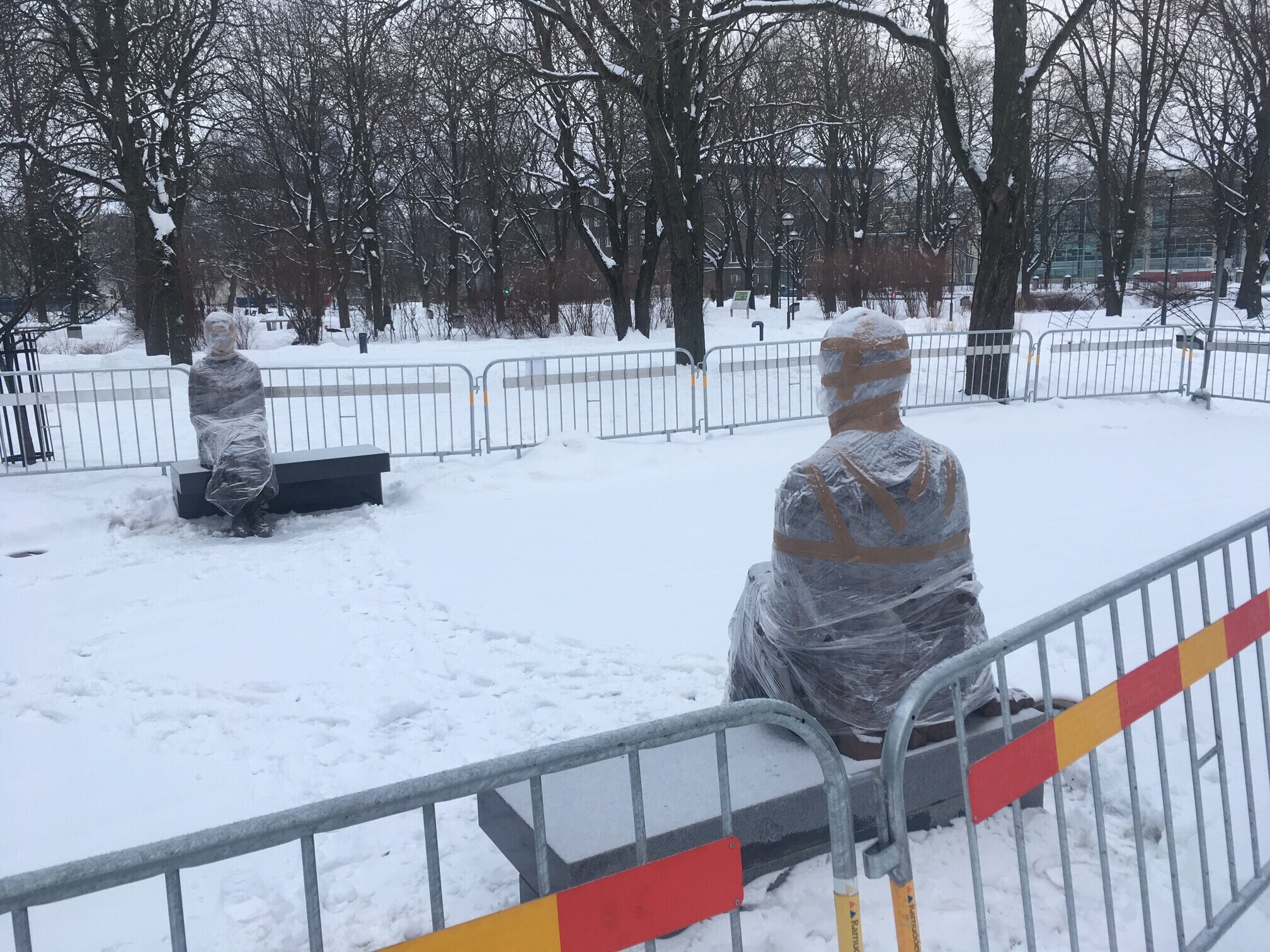 Tallinnas Politseiaia pargi pinkidel ootavad kilesse mässituna avamist Tallinna ja Eesti ajalukku sügava jälje jätnud abielupaari Voldemar ja Elfriede Lenderi kujud.