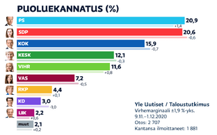 19,6 protsendiga on jätkuvalt esikohal Põlissoomlased, kes kerkisid sinna kohe pärast kevadisi valimisi. 16,8 protsenti valijatest annaks hääle aga Koonderakonnale. Mõlema opositsioonipartei toetus paistab olevat suhteliselt stabiilne.