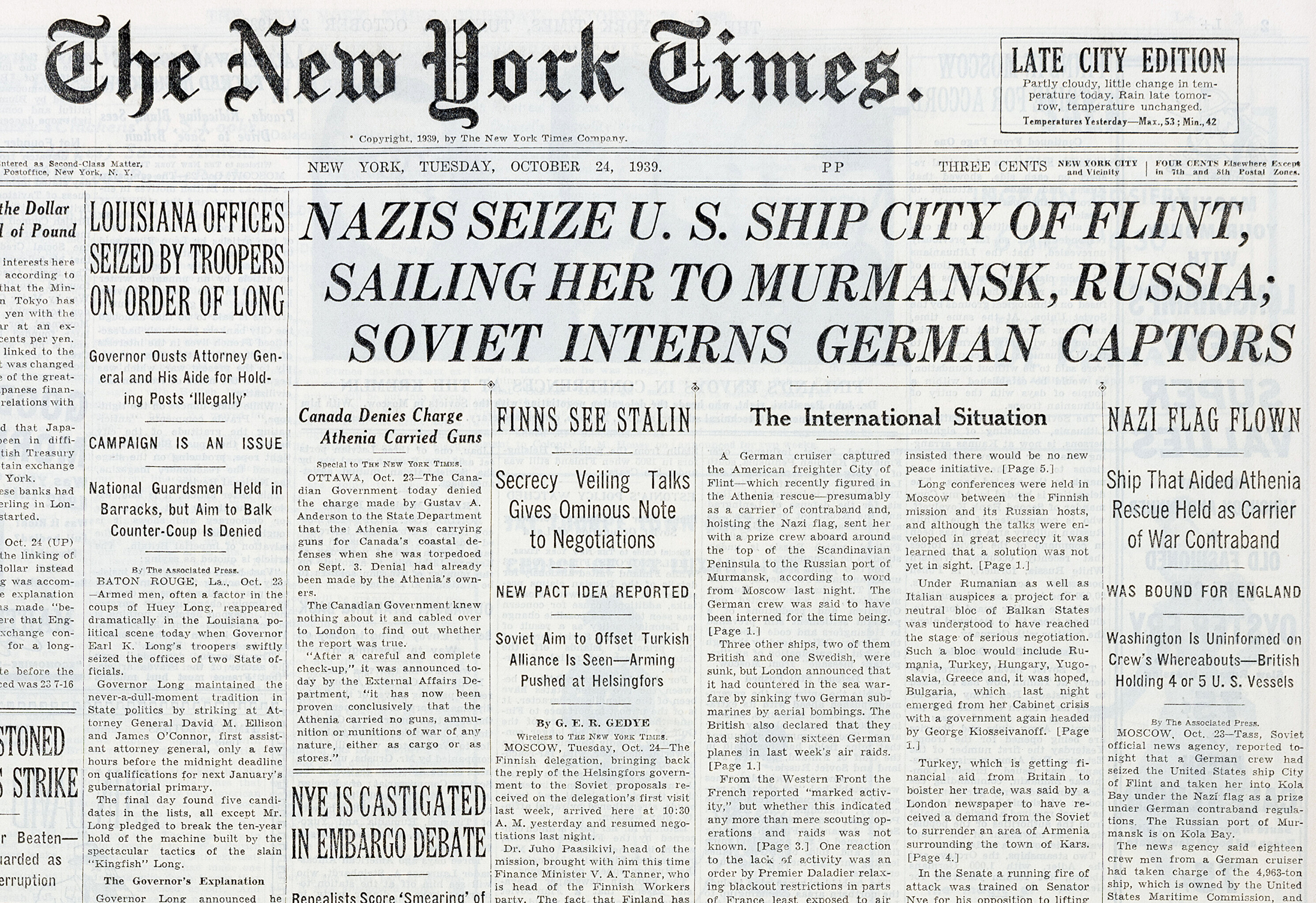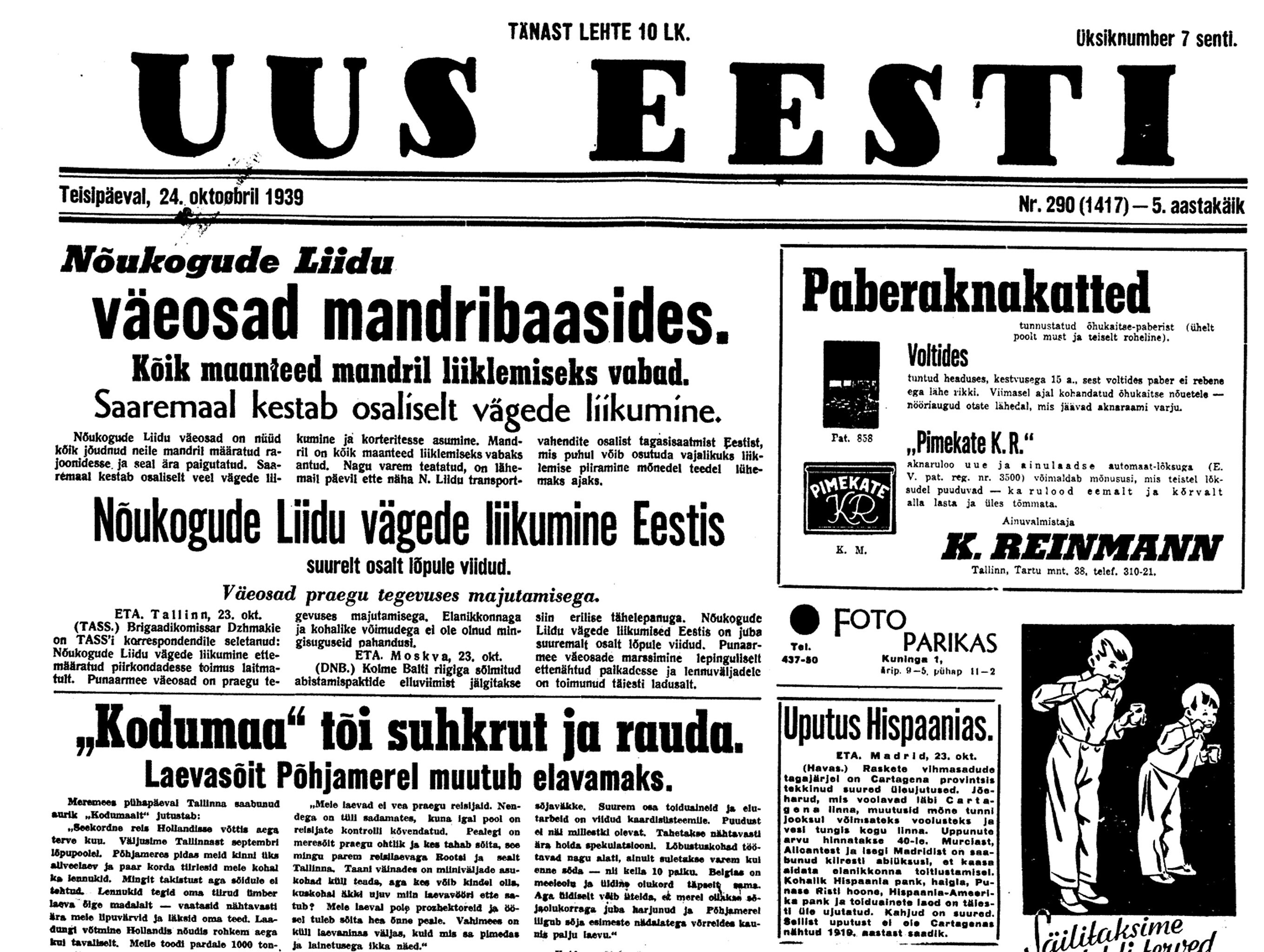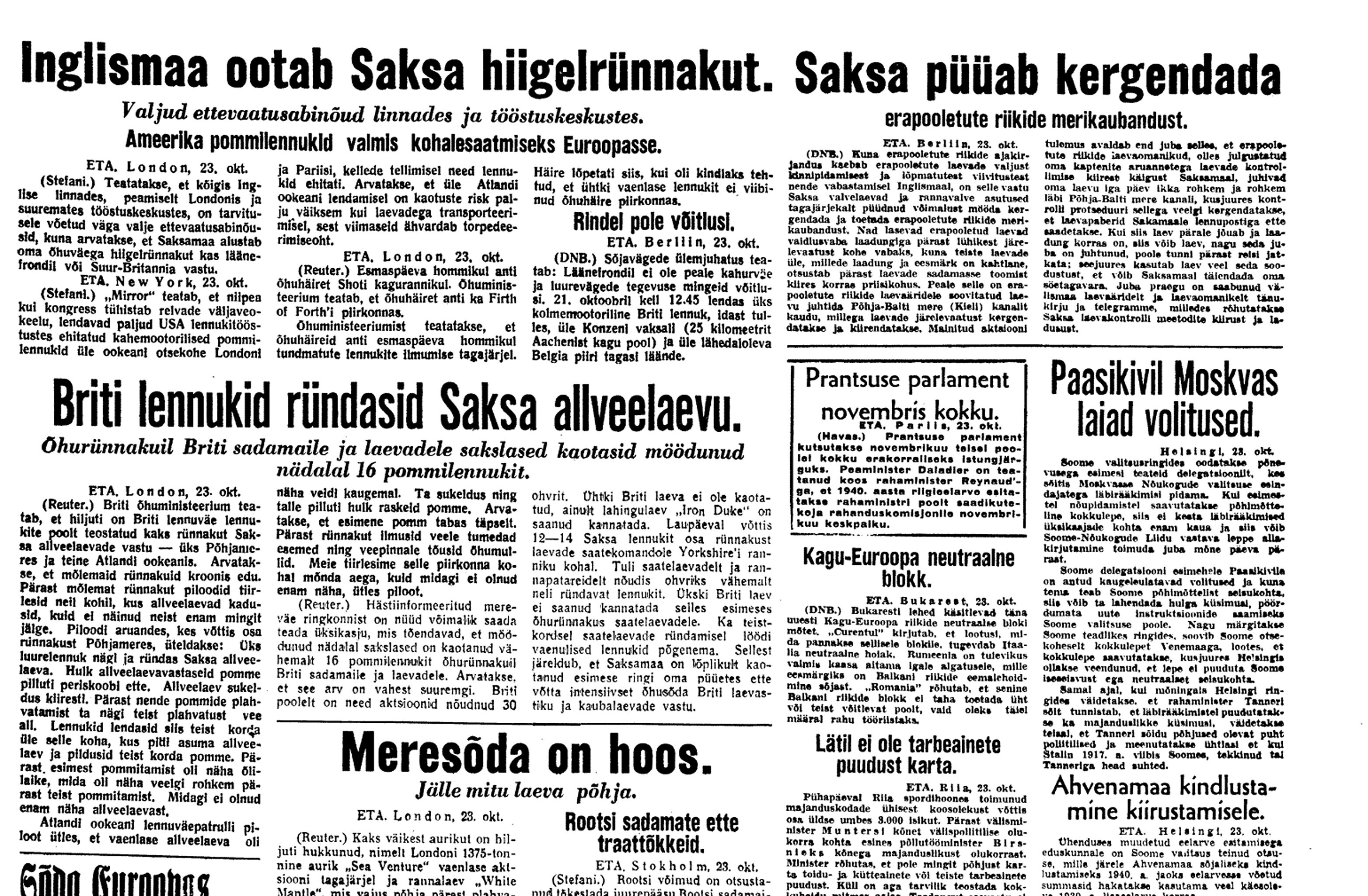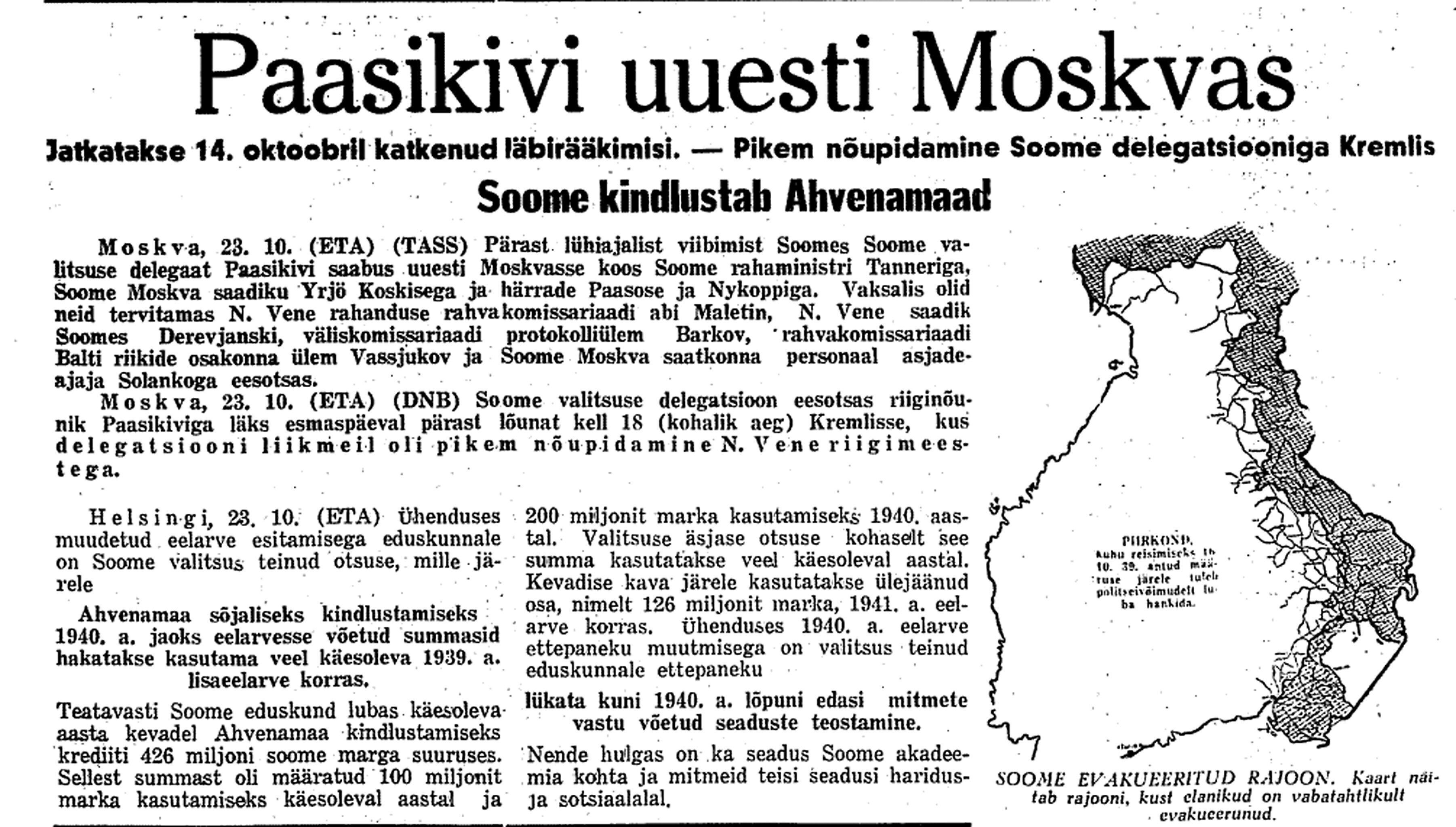 24. okt. Kell 18 V. V. koosolek. Selgub, et Paasikivi ja Tanner pöörduvad juba täna öösi Moskvast tagasi Helsingisse, et uuesti nõu pidada valitsusega, kuna Vene esitanud uusi nõudmisi. Soomes olevat käsk täna öösel kustutada kõik tuled. Soome olevat pöördunud Inglise ja Prantsuse poole, et ühineda nendega liiduks. Usutavat liitlaste võitu ja arvestatavat, et kuigi vahepeal peaks iseseisvus kaduma, liitlaste võidu puhul saavutatakse see uuesti.
